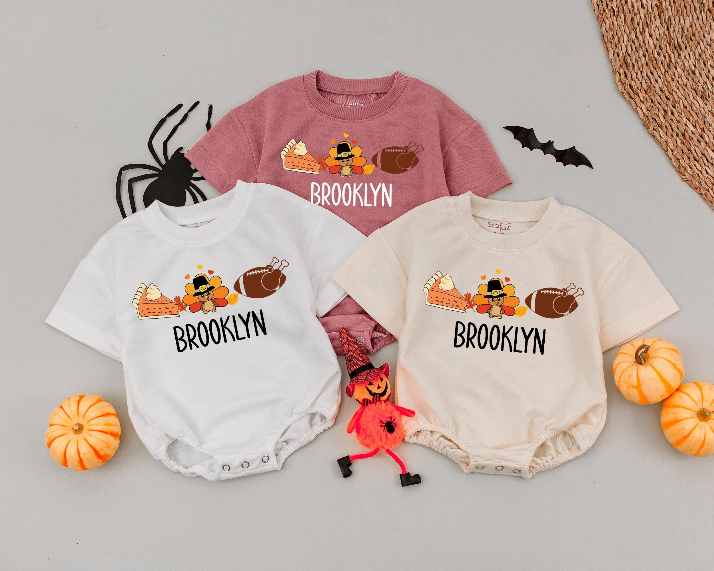 4) Fall Feast Icons Personalized Romper (Turkey, Pie & Football)