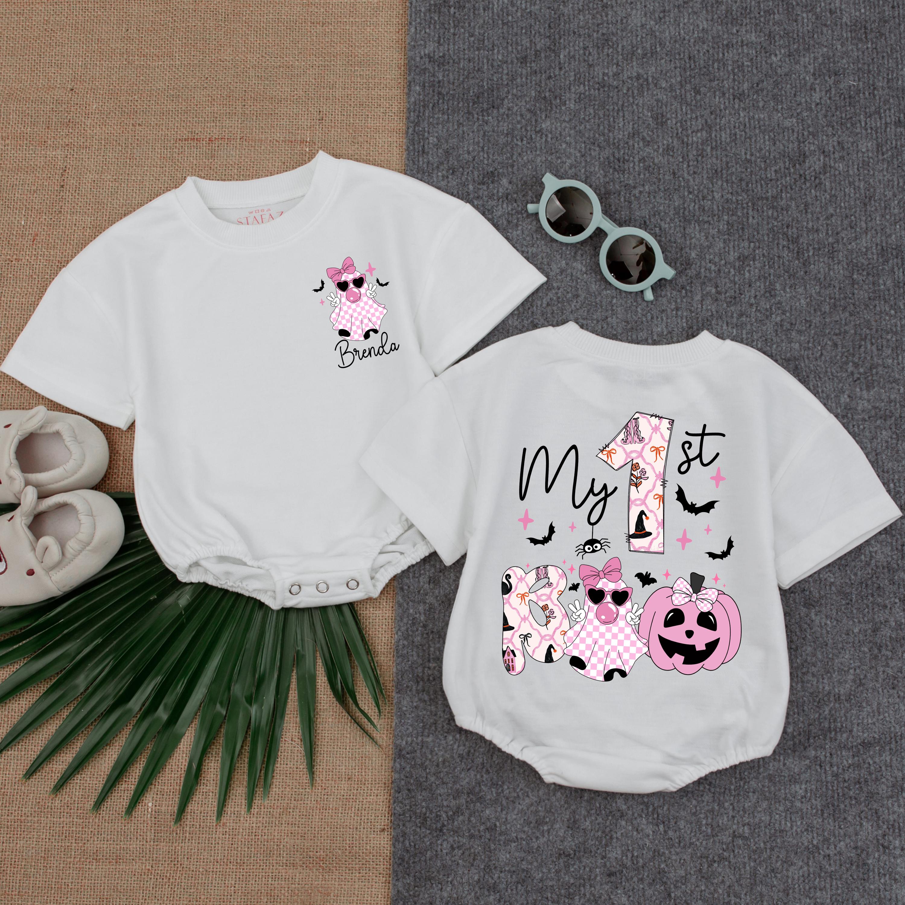 Front mini-ghost with name; back features a large “My 1st BOO” graphic in pastel pink.
