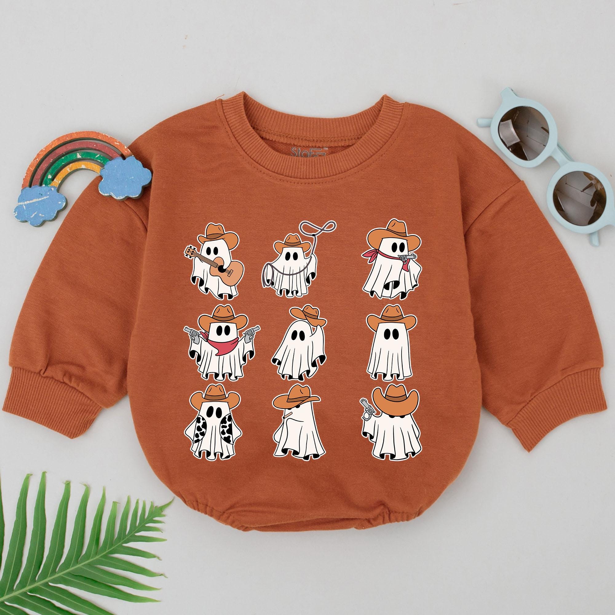 Yeehaw meets boo! This rust-colored romper features a group of playful little ghosts dressed as cowboys—complete with hats, lassos, and musical instruments. It’s the perfect blend of silly and spooky for your baby's first Halloween adventure.