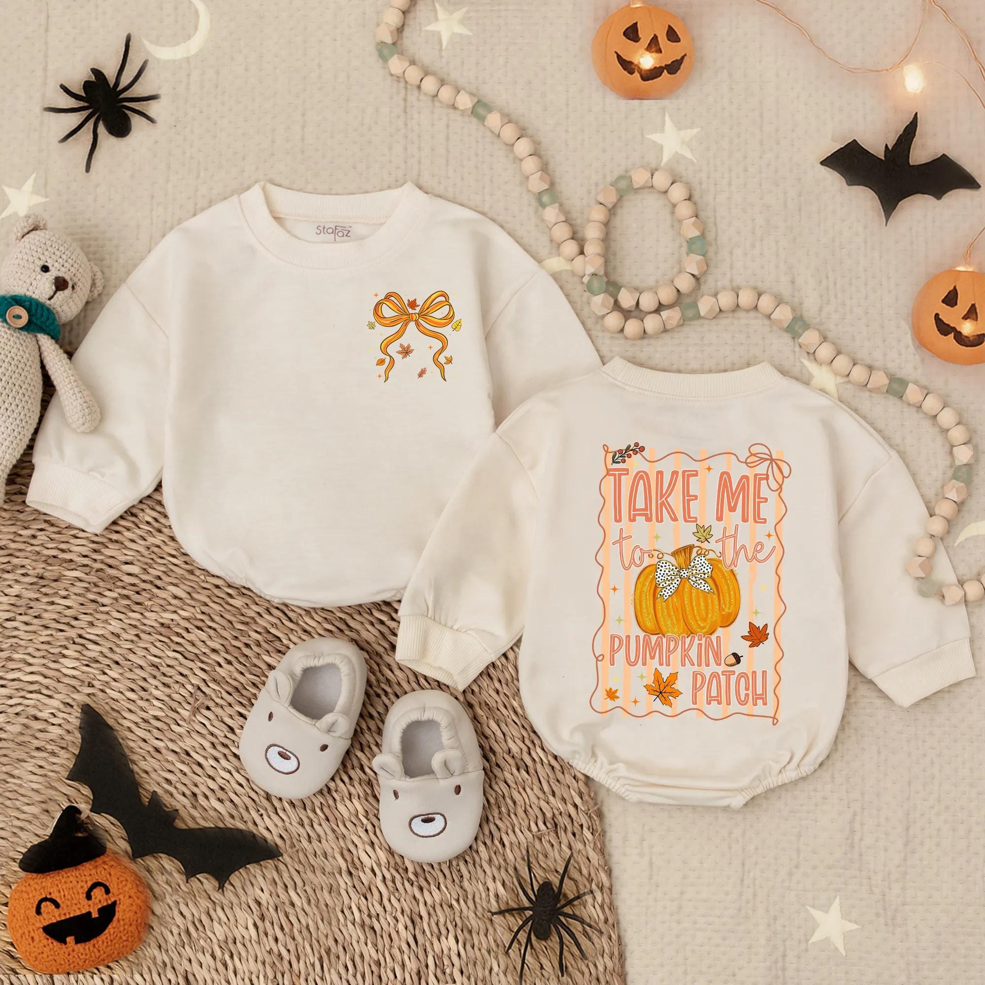 This cream-toned romper is made for fall outings. The front has a delicate fall bow design, while the back features cheerful pumpkin-themed artwork and the quote “Take Me to the Pumpkin Patch.” It’s comfy, seasonal, and Insta-ready.