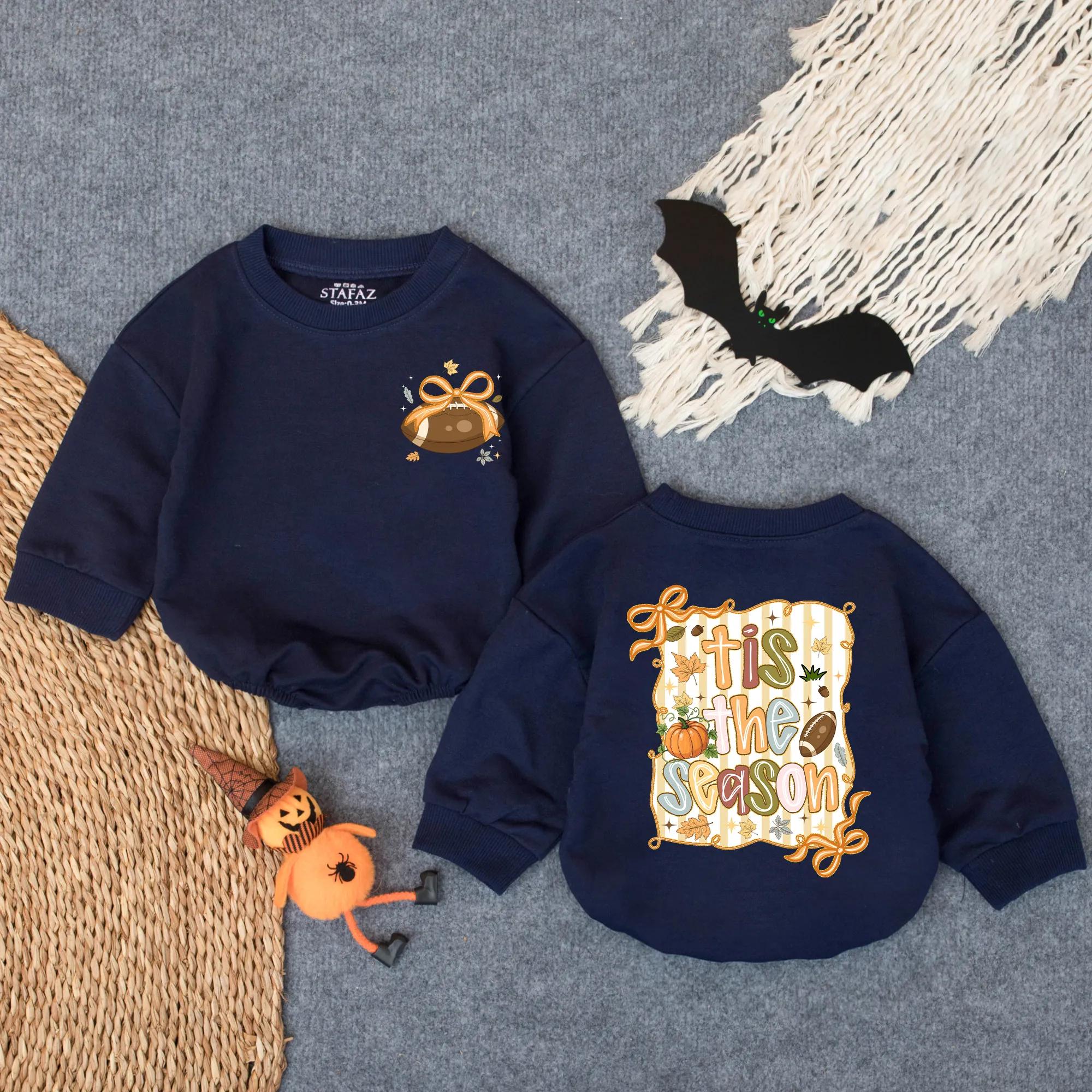 For a cozier, darker color palette, this navy romper hits all the right notes. A festive acorn-and-pumpkin print on the back says “’Tis the Season”—while the front bow detail adds a sweet autumn charm.