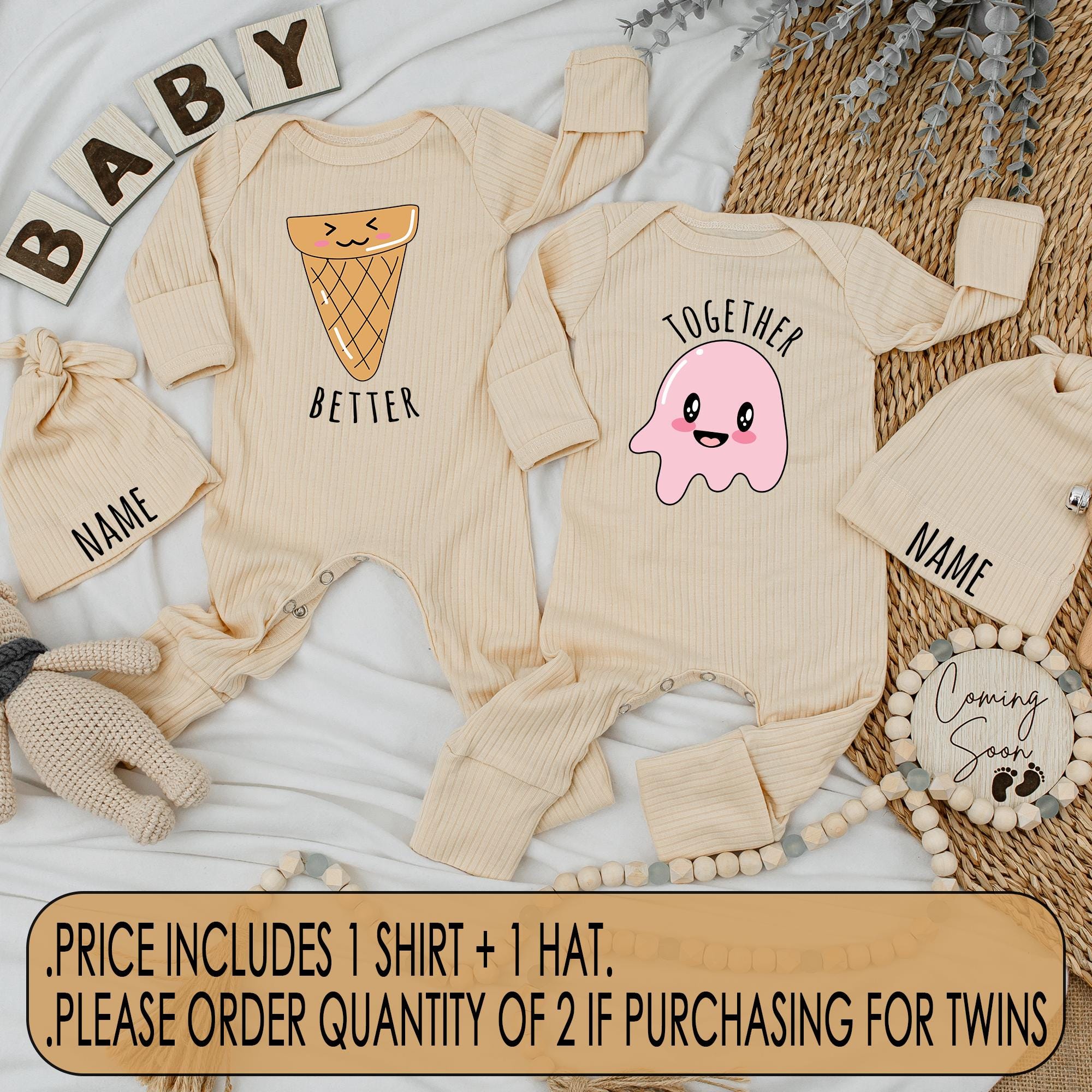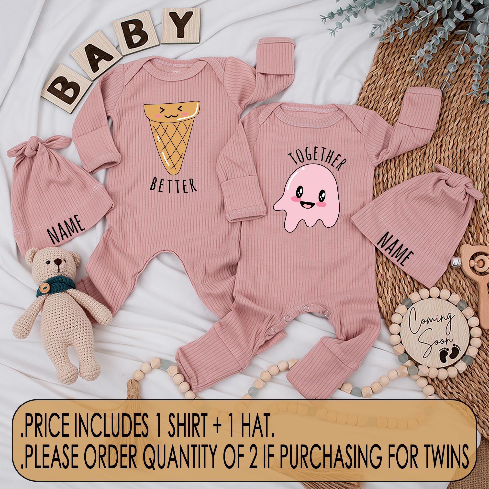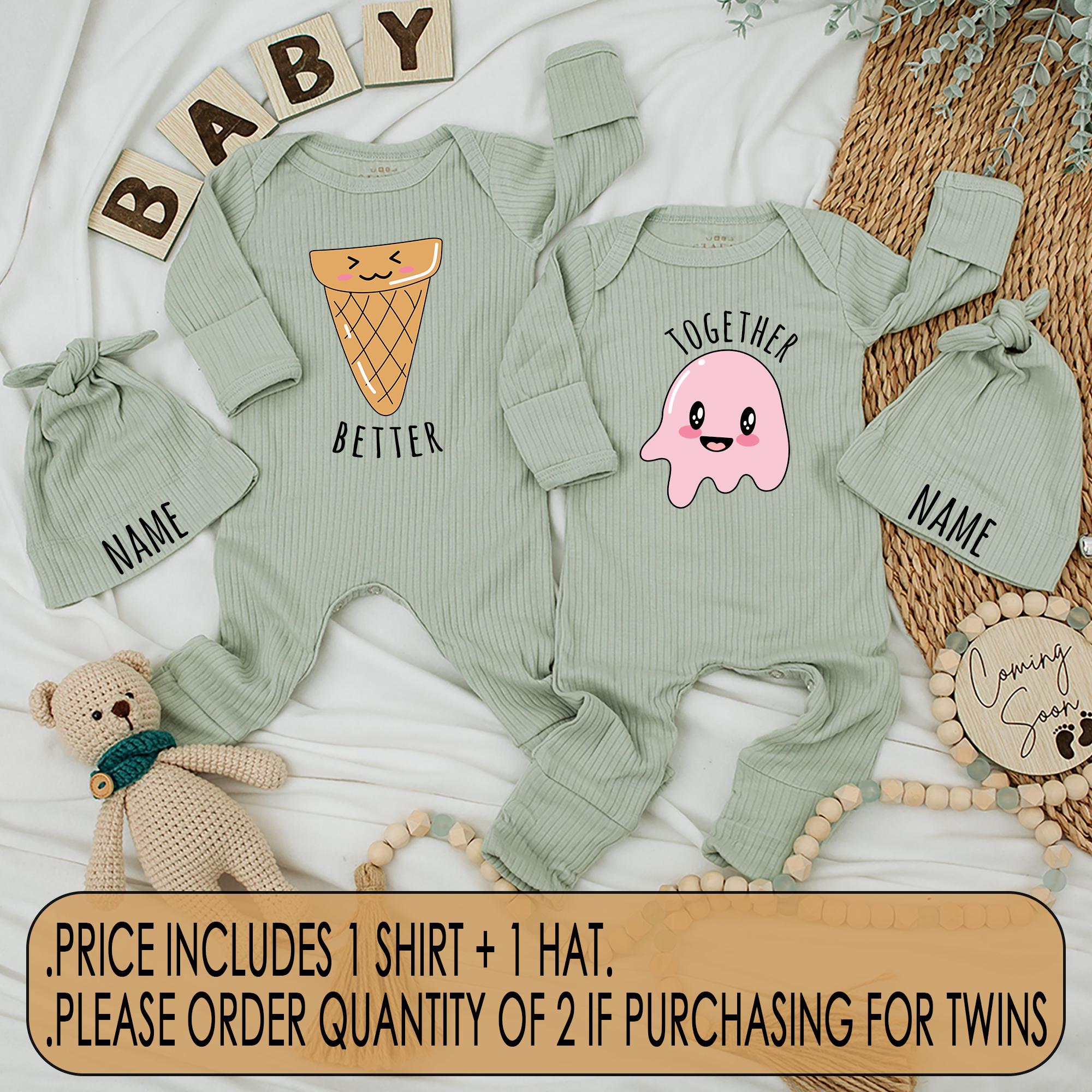 Picture this delightful scene: two giggling little ones, dressed in charming outfits that reflect their inseparable bond. Our 'Better Together' twin baby bodysuits feature a whimsical ice cream cone and a joyful pink jelly character, each with smiling faces and playful pastel colors. Crafted from soft, comfortable cotton, these outfits are perfect for capturing those unforgettable moments, whether it's a sunny family picnic or a cozy afternoon at home. Imagine the joy of gifting this adorable set at a baby shower, knowing that each wear will be a reminder of love and togetherness. Personalize it by adding a special name or date to create a keepsake that holds cherished memories. Bring a little more joy into everyday life with these enchanting matching outfits.