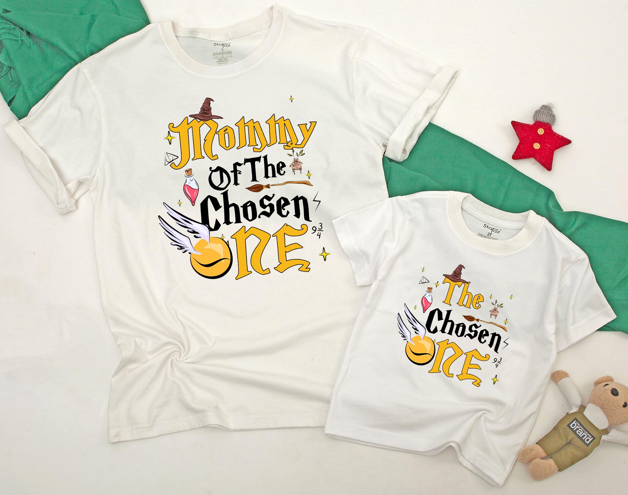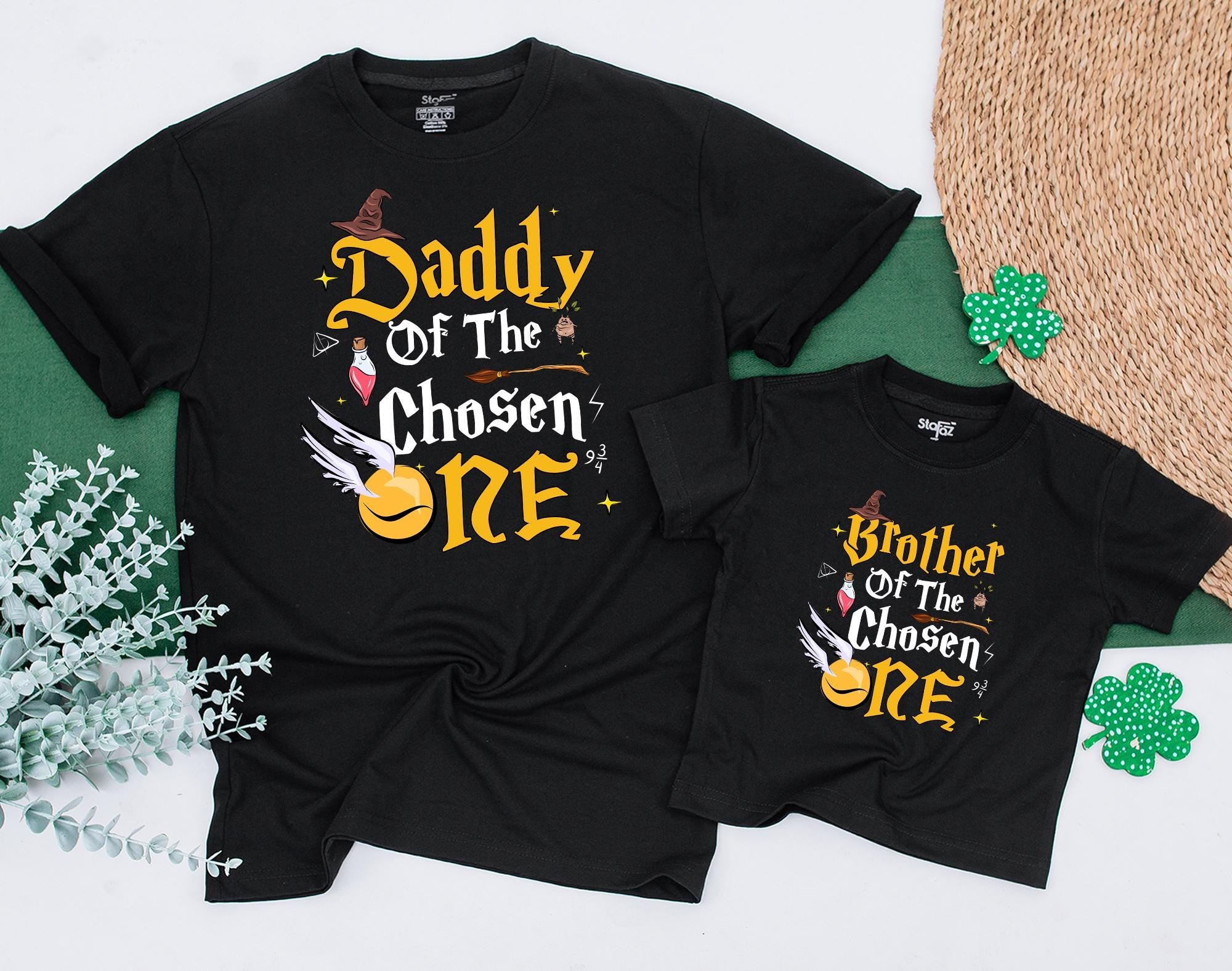 Imagine a family gathering filled with laughter and love, where each member feels like 'The Chosen One.' Our whimsical and magical themed garments bring this vision to life with playful fonts featuring titles like 'Daddy,' 'Mommy,' 'Sister,' and 'Brother.' Bold yellows, whites, and blacks accented with red and brown create a vibrant canvas, while elements like a wizard hat, lightning bolt, and golden snitch-like ball add enchanting touches. Perfect for a weekend brunch or a memorable birthday celebration, these outfits make family bonding moments even more special. Personalize with a name or date to transform these into cherished keepsakes, capturing memories that last a lifetime. Let these magical shirts be the highlight of your next family photoshoot or casual day out, embracing the joy and togetherness they inspire.