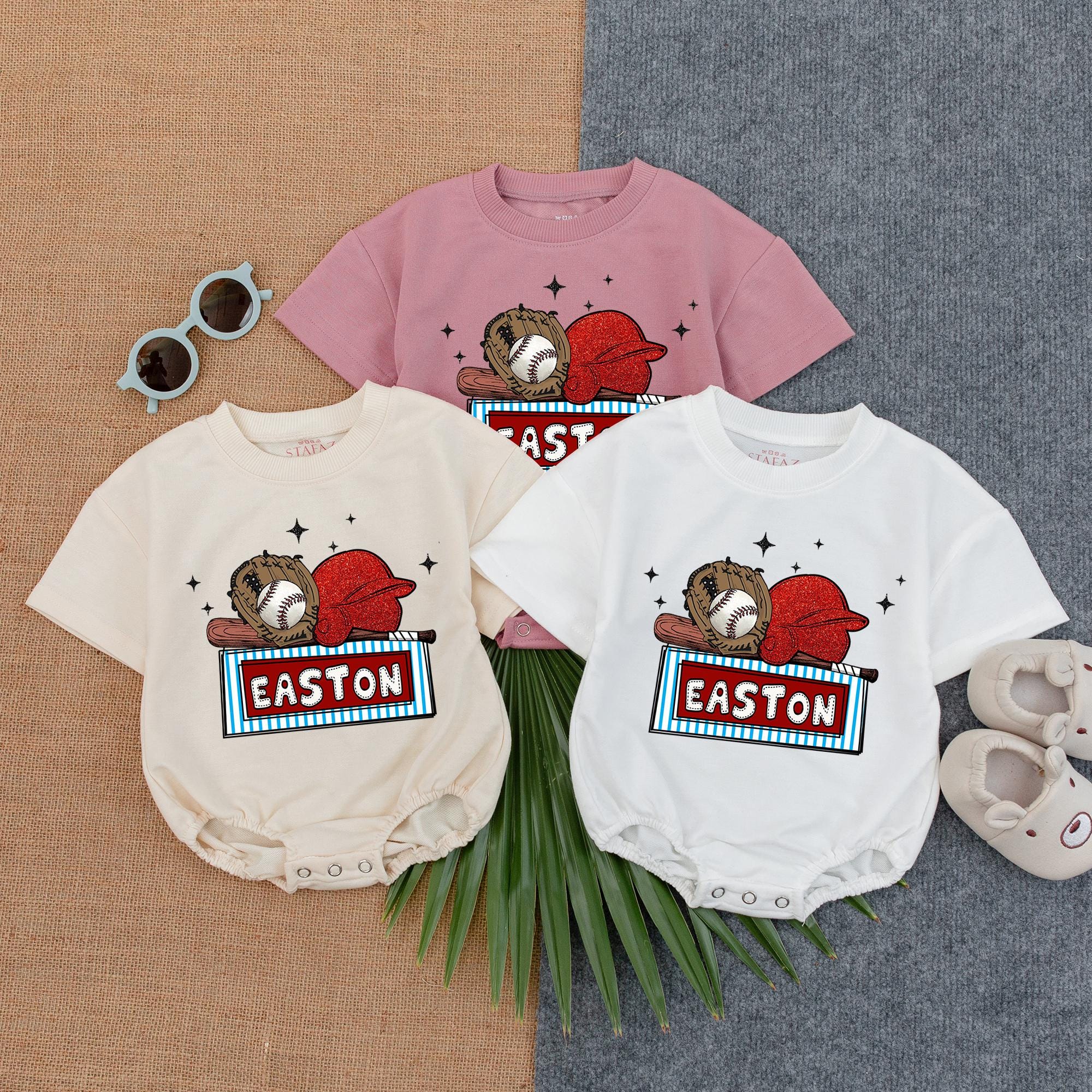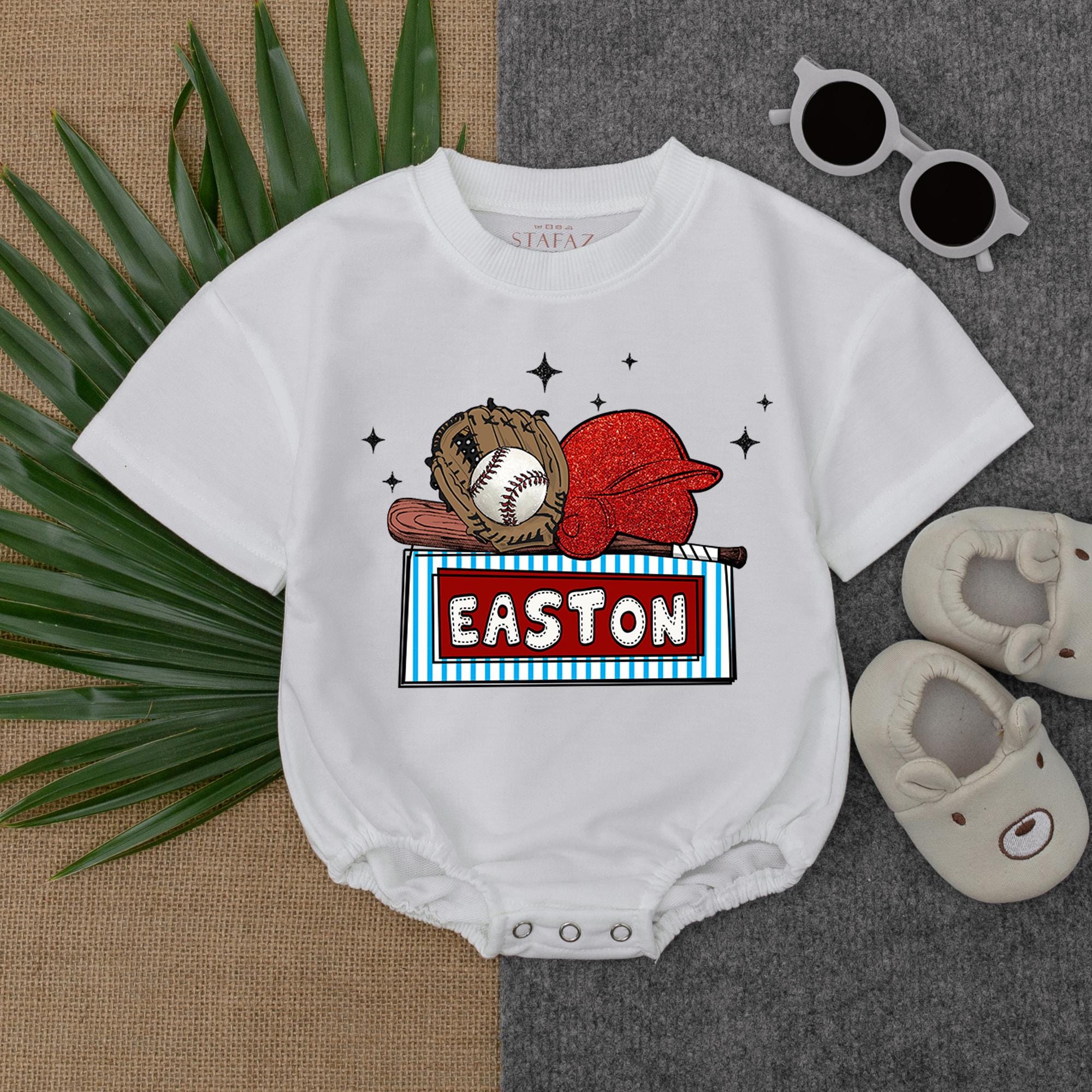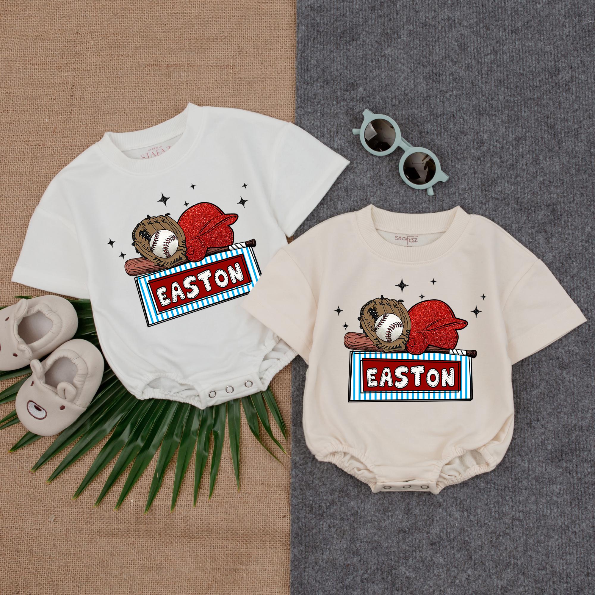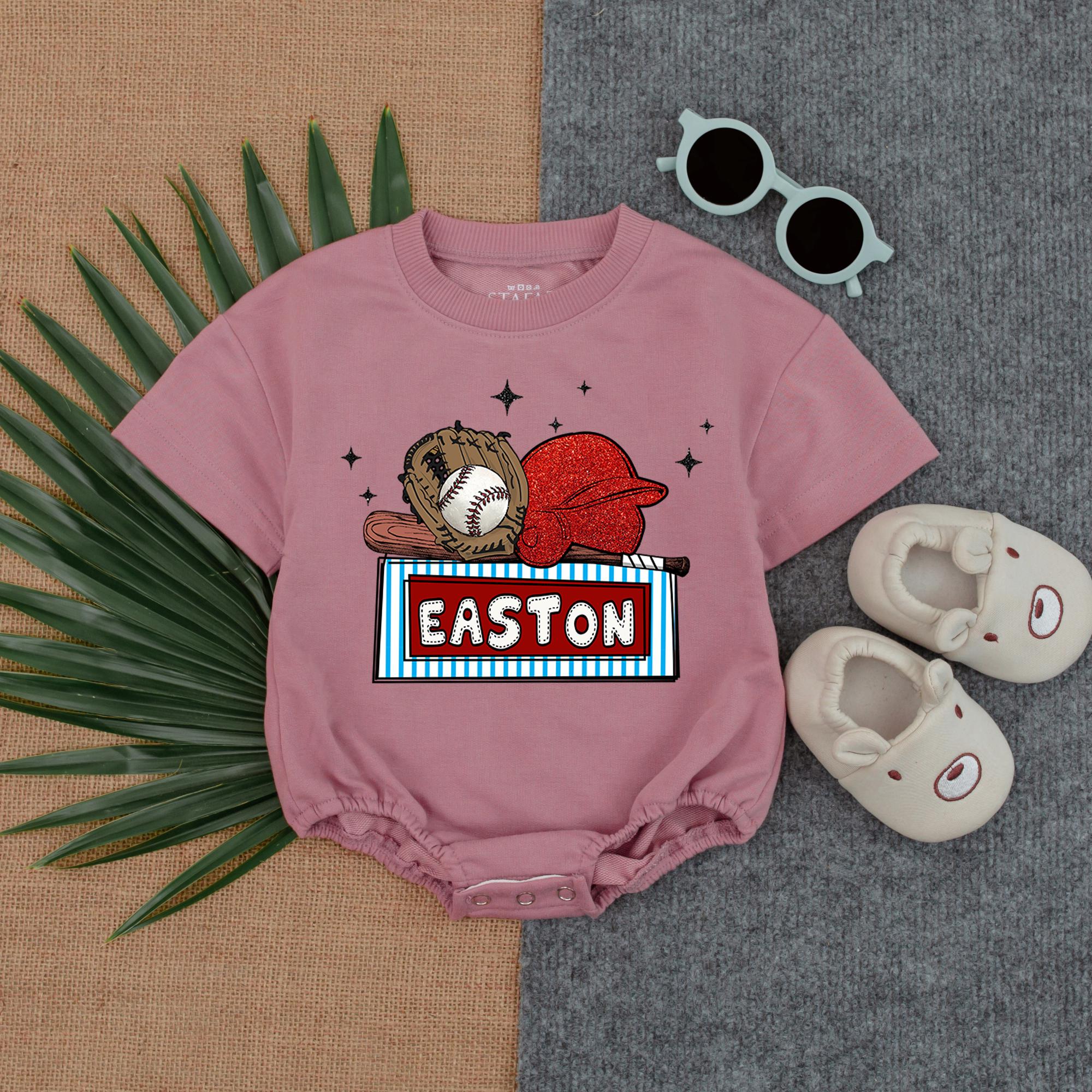 Imagine your little one dressed in this charming baseball-themed romper, a perfect piece for any budding sports fan. The vibrant design features a playful baseball glove and ball, accompanied by a bright red cap, capturing the essence of America's favorite pastime. With 'EASTON' boldly displayed in a striking blue and white striped frame, this romper is perfect for family outings or casual playdates. The scattered stars add a whimsical touch, making it a joyful choice for special occasions or everyday wear. Add your child's name to make it a cherished keepsake that celebrates their love for the game. Whether for a birthday or just because, this romper is a heartwarming gift that will be treasured for years to come. Capture this moment and let your little one shine in style.