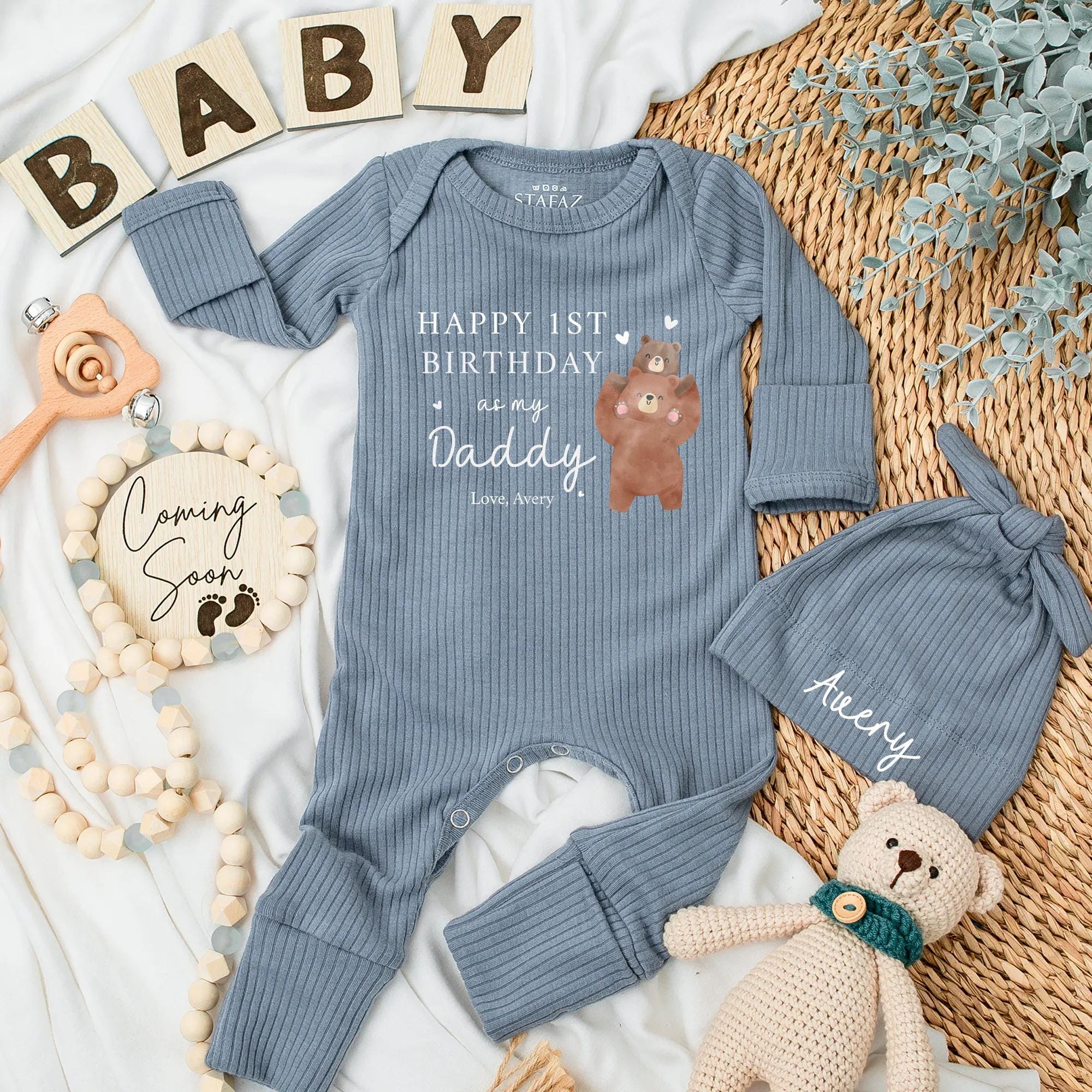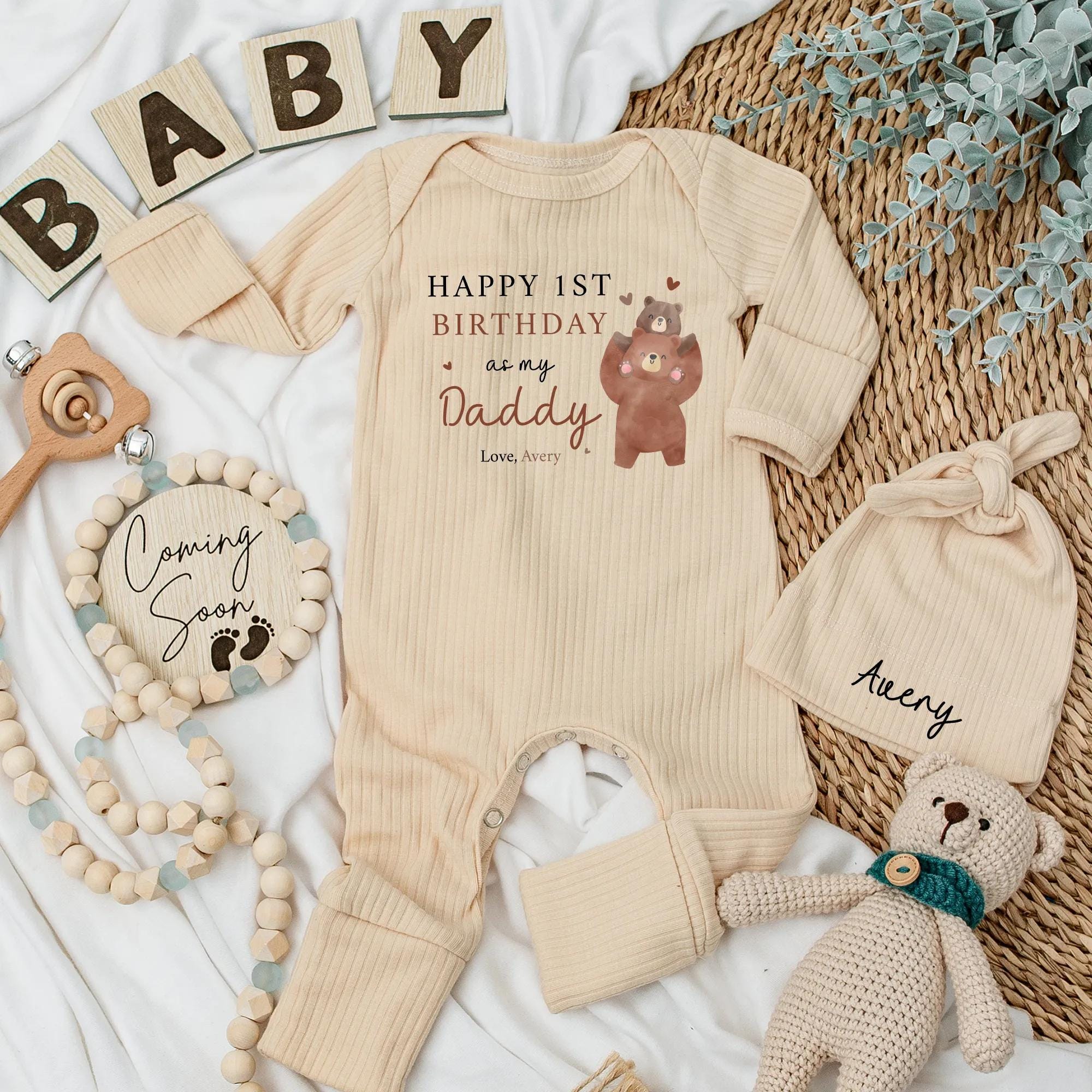 Imagine the joy on a new dad's face as he celebrates his first milestone with his little one. This adorable bodysuit features a charming cartoon-style bear standing upright, donning a festive party hat. The soft brown bear adds a playful touch, while the heartfelt message 'HAPPY 1ST BIRTHDAY as my Daddy' creates a focal point, highlighted by the word 'Daddy' in a standout font and color. Below, 'Love, Avery' is penned delicately, making it a perfect keepsake. Whether it's a family gathering or a cozy day at home, this outfit captures the warmth and pride of fatherhood. Personalize it with your baby's name to turn it into a cherished memory that stands out. Gift this to a new dad and let him treasure these precious moments forever.