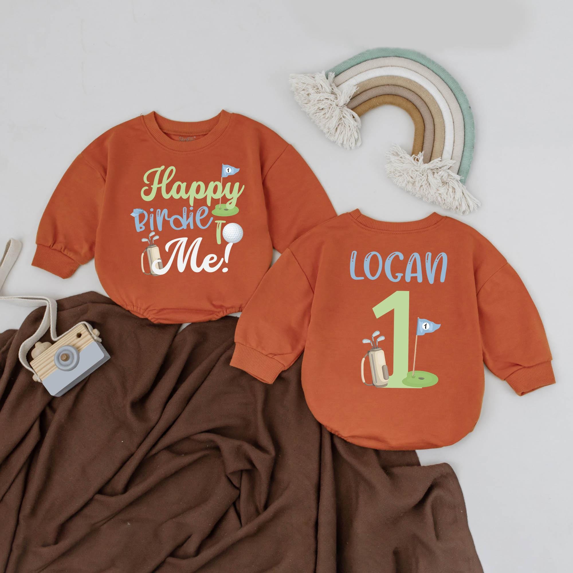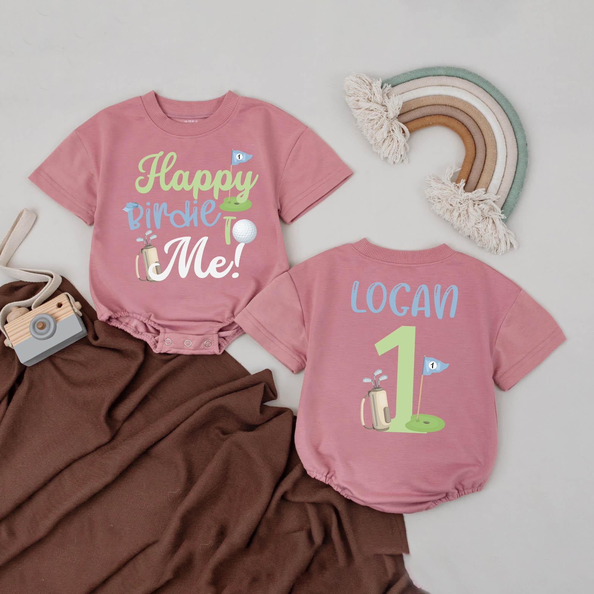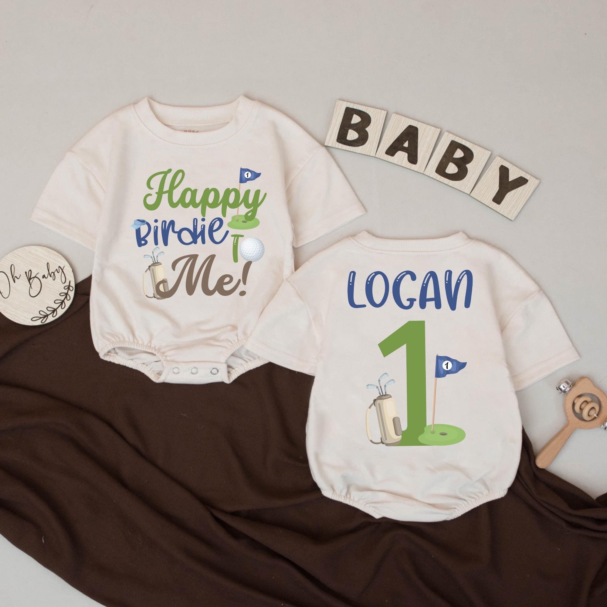 Celebrate your little one's first birthday with the joyful charm of our golf-themed romper. Imagine the delight as your baby boy wears this vibrant outfit, designed with playful elements like a tiny golf flag and ball, and the cheerful slogan 'Happy Birdie to Me!' in green and blue. The back proudly displays 'LOGAN' alongside a large green '1', marking this special milestone with a sporty twist. Perfect for a lively birthday party, this romper invites smiles and captures the spirit of fun and family gatherings. Personalize it with your child's name to create a keepsake that will be cherished for years to come. This unique gift is more than just clothing; it's a memory in the making.