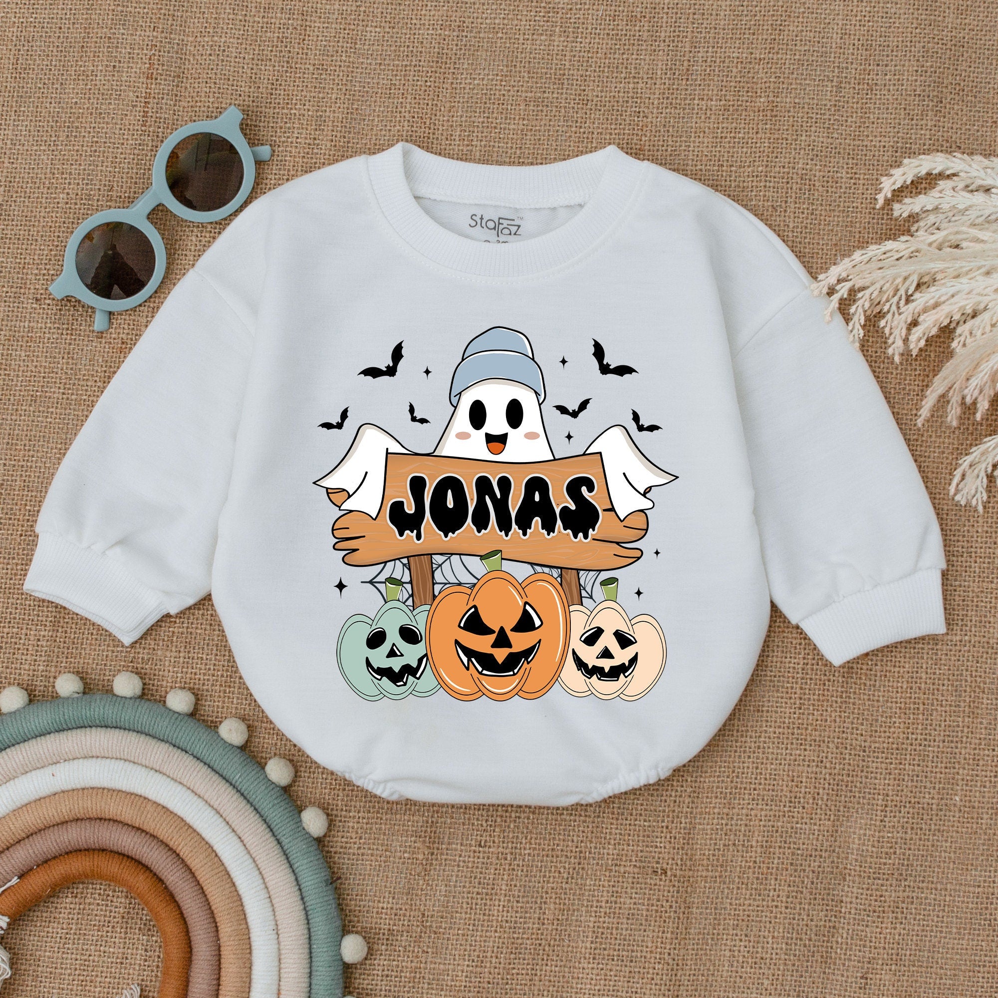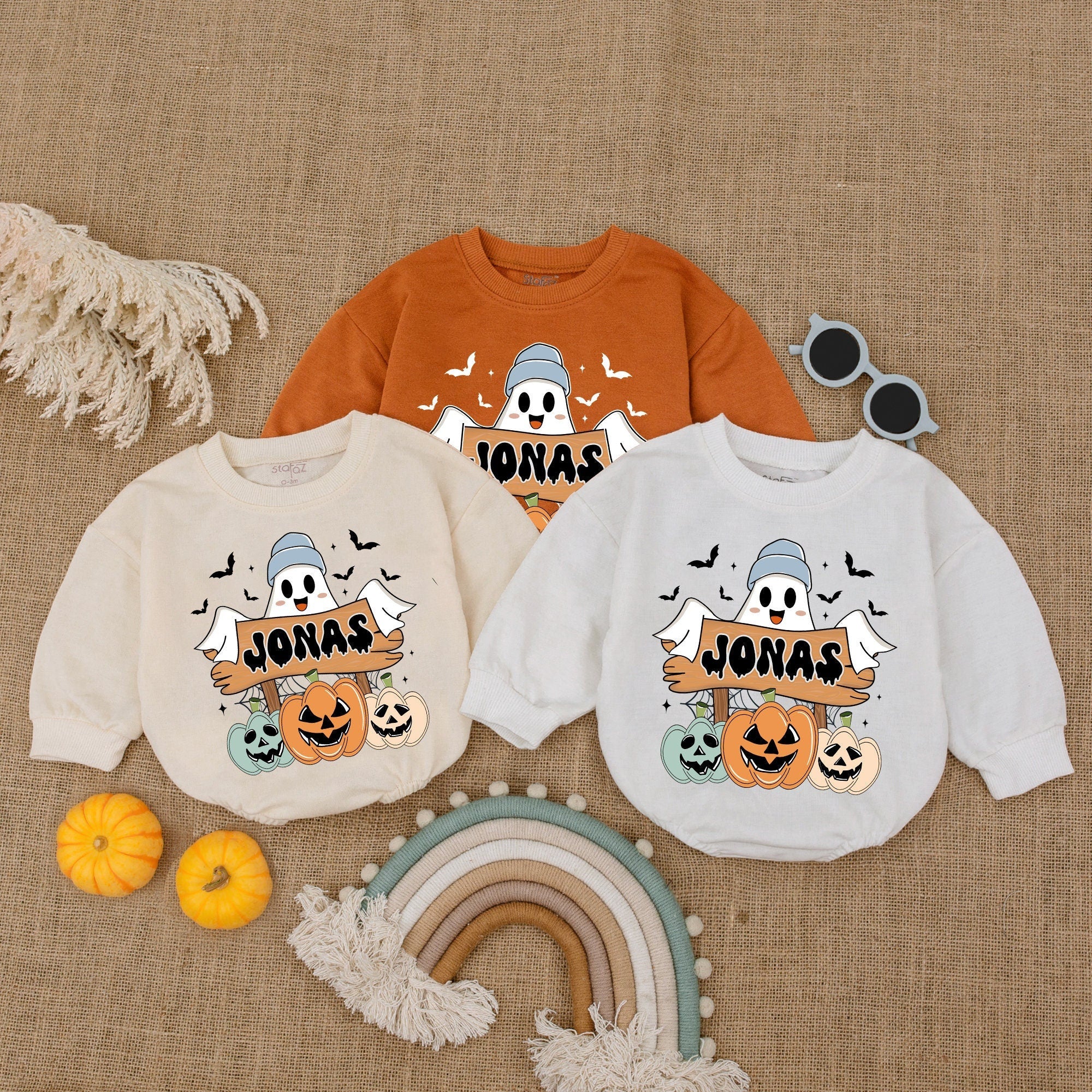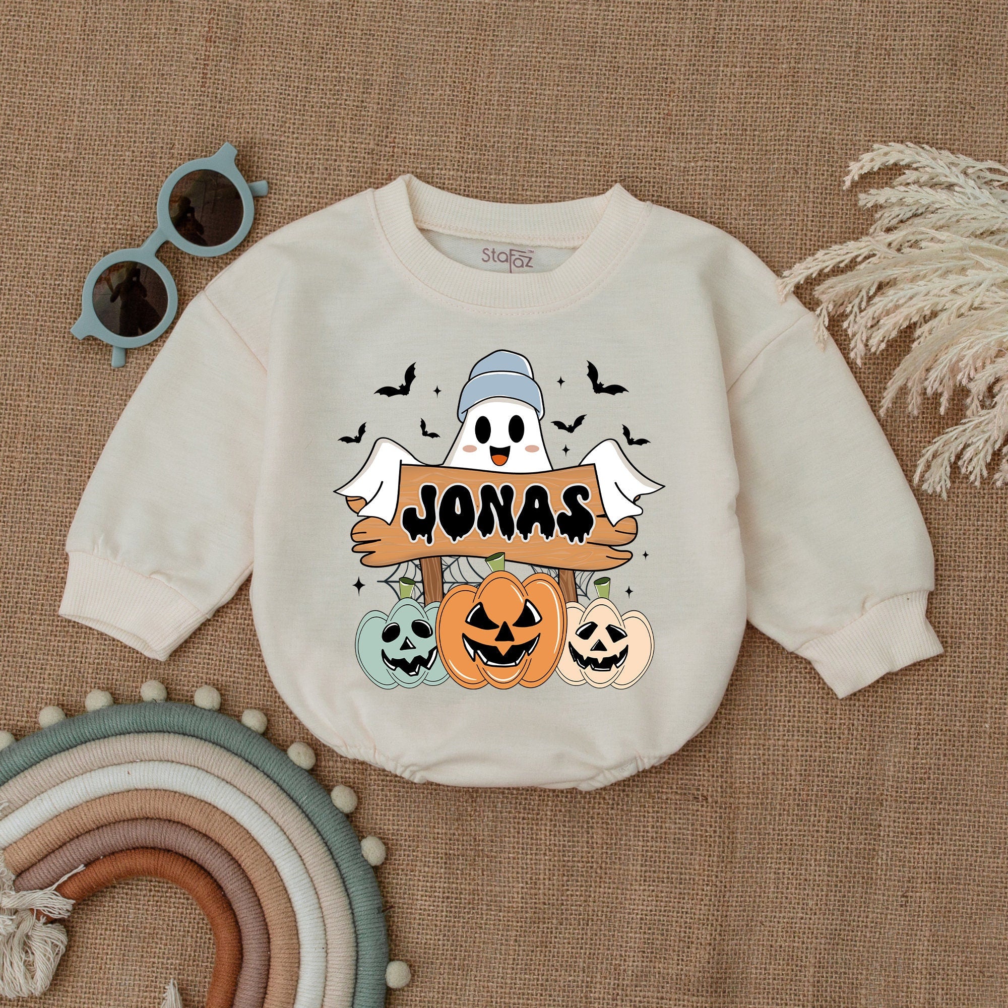 Custom Baby Boy Halloween Romper Friendly Ghost Design Personalized Name Pumpkin Outfit Soft Cotton Infant Costume Festive Boo Bodysuit