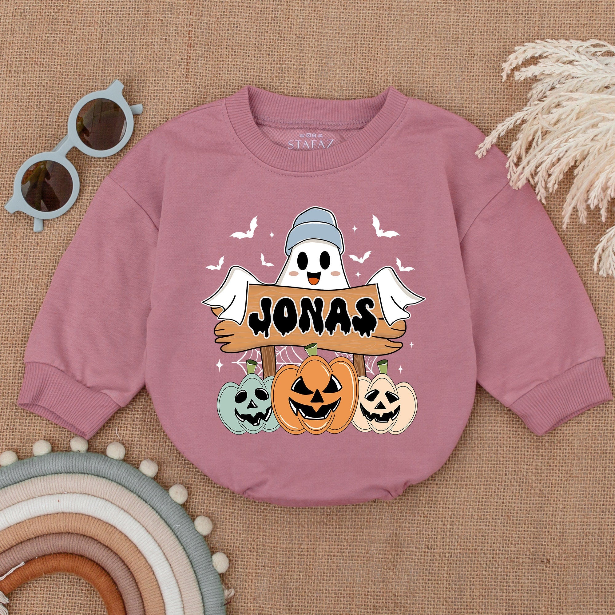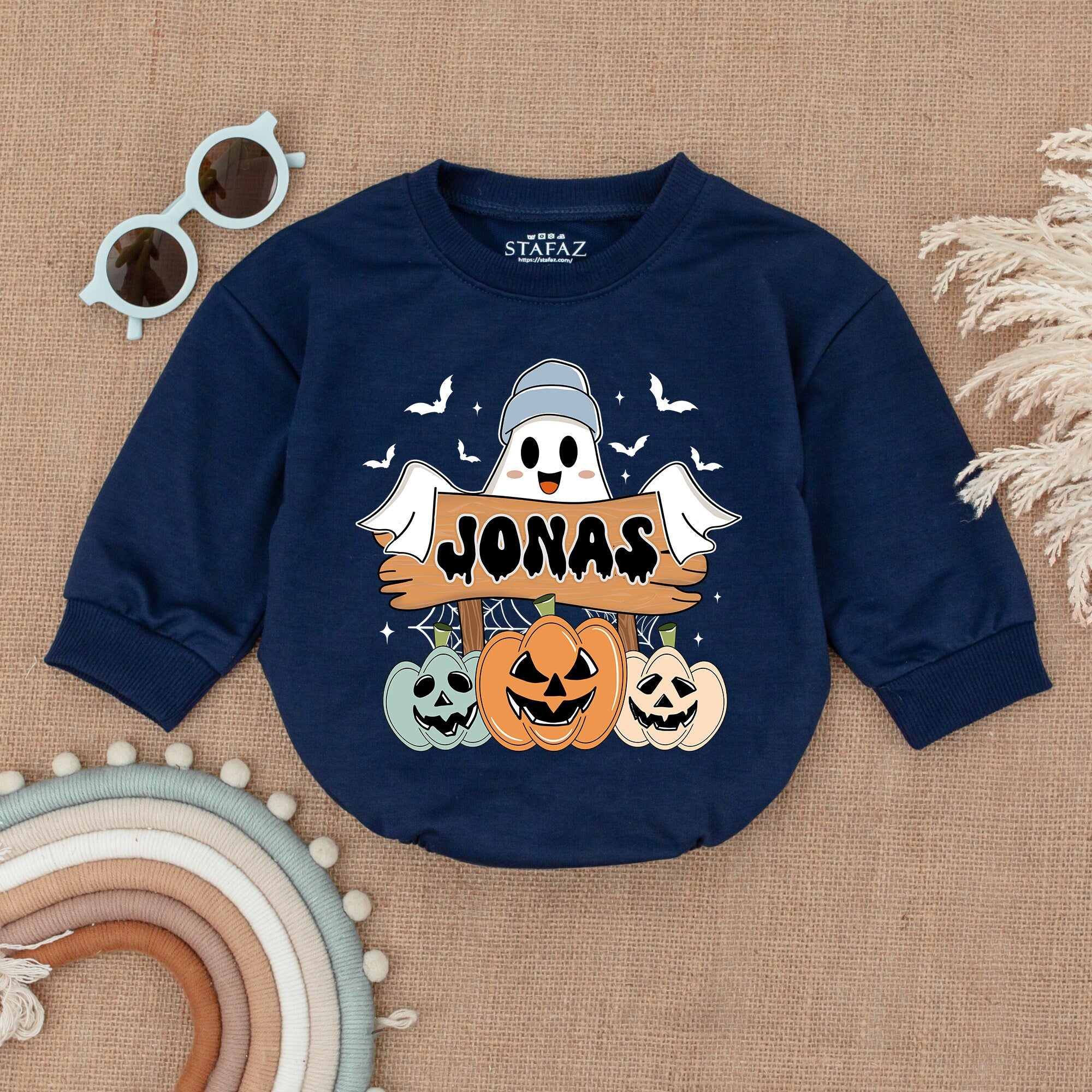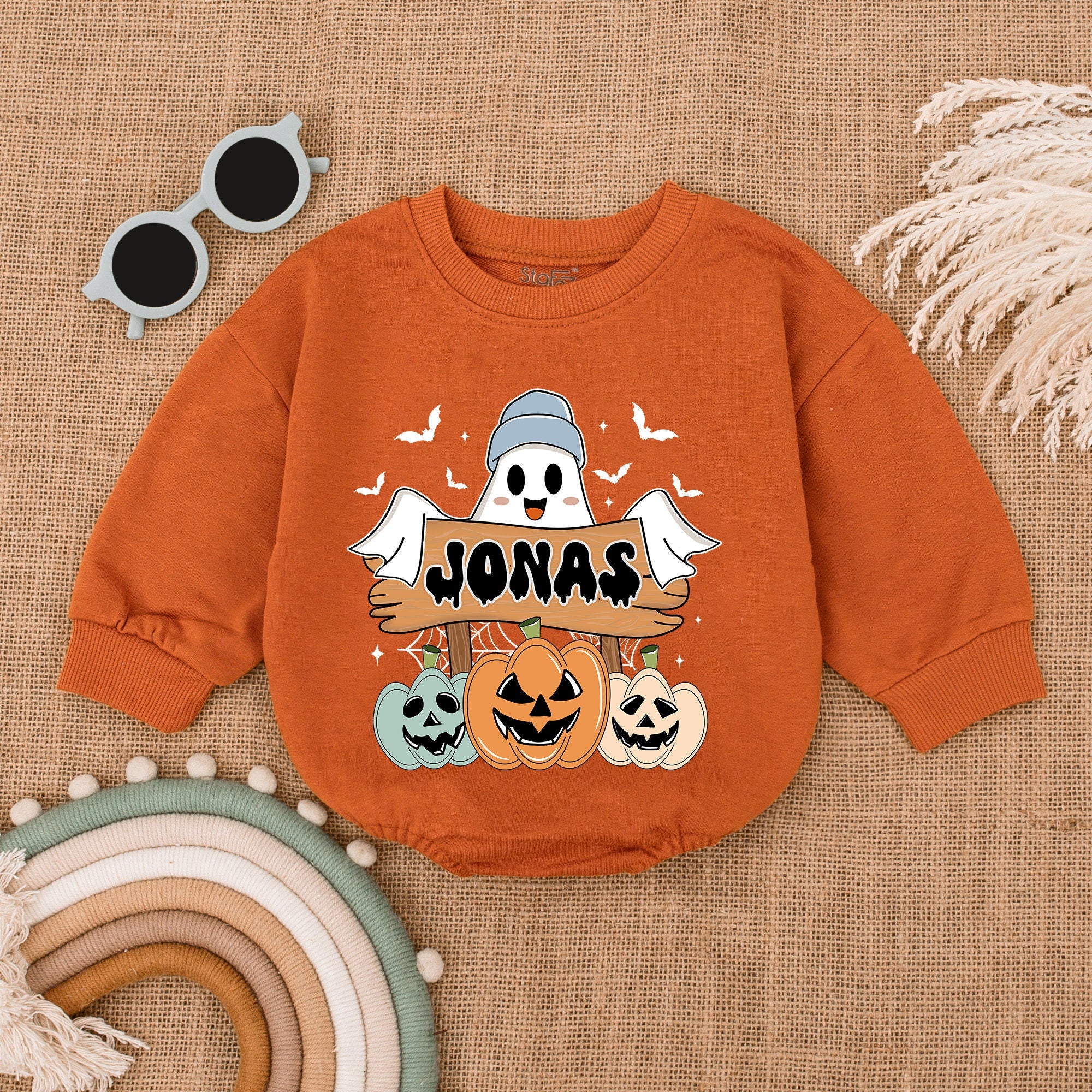 Custom Baby Boy Halloween Romper Friendly Ghost Design Personalized Name Pumpkin Outfit Soft Cotton Infant Costume Festive Boo Bodysuit