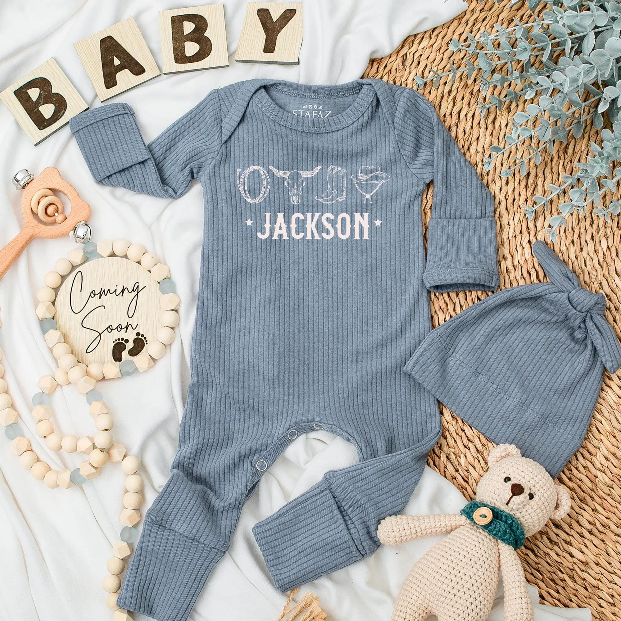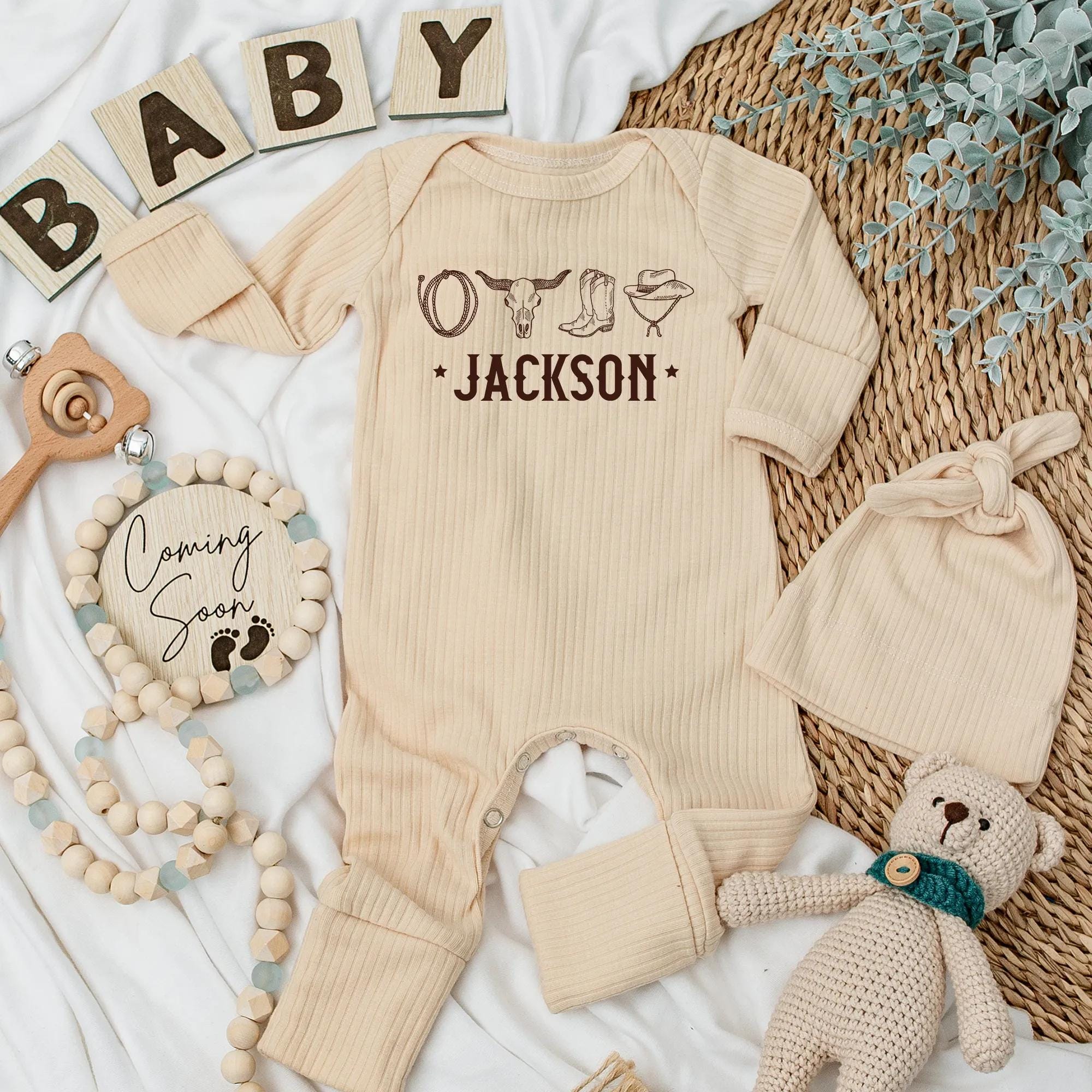 Imagine the joy of welcoming a little one into the world with a touch of Western charm. This playful cowboy-themed bodysuit, adorned with iconic symbols like a cowboy hat, horseshoe, longhorn skull, and boot, brings a vintage flair to your baby's wardrobe. The warm brown tones and rustic 'Jackson' lettering capture the essence of the Wild West, while the star motifs add a sprinkle of magic. Perfect for a baby shower gift, this soft and comfortable outfit is not just clothing but a keepsake, especially when personalized with your baby's name. Picture your little cowboy stealing the spotlight during family gatherings or casual outings. Let this unique piece become a cherished memory, celebrating the special bond between family and tradition. Customize it with a name to make it truly one-of-a-kind, a treasure they'll hold dear.