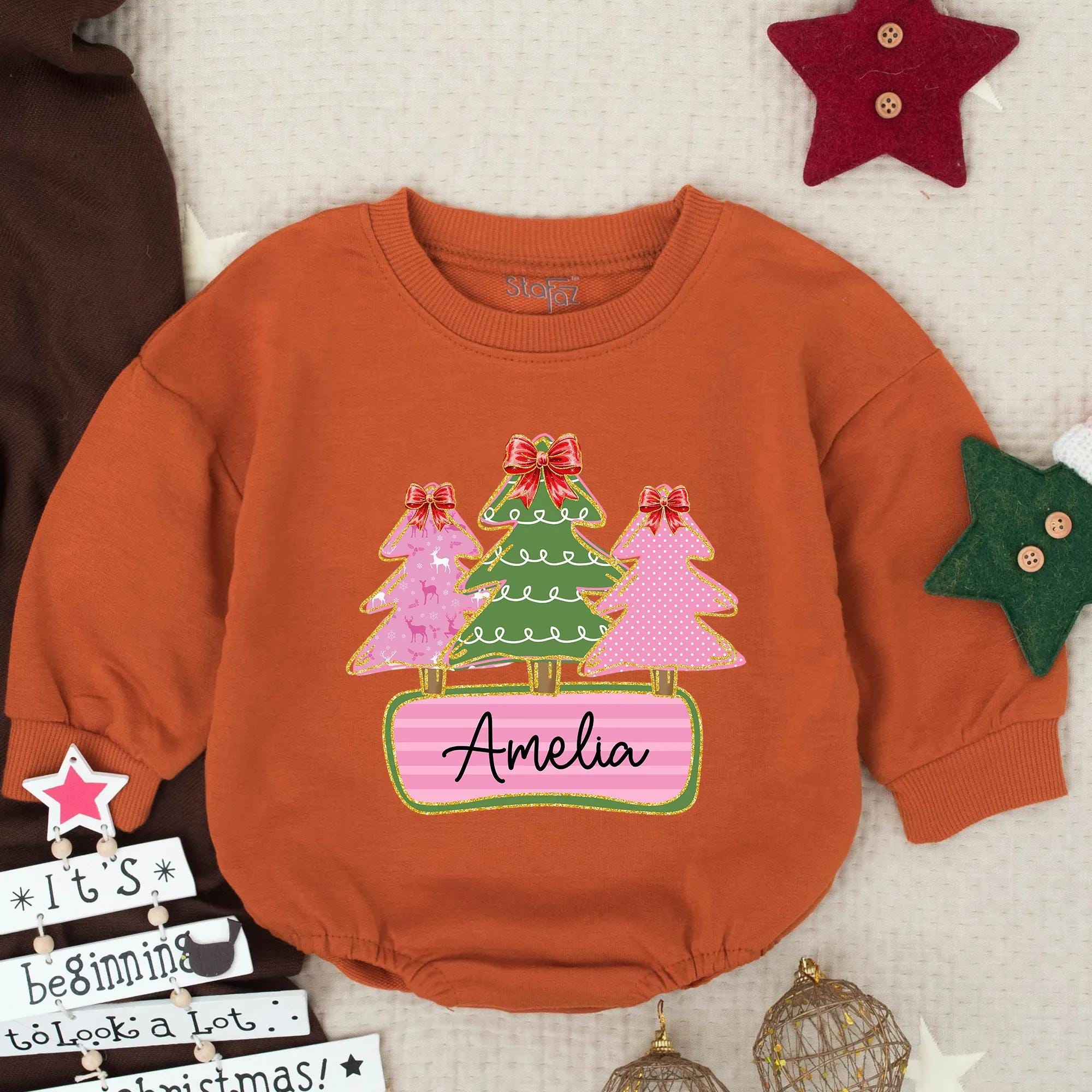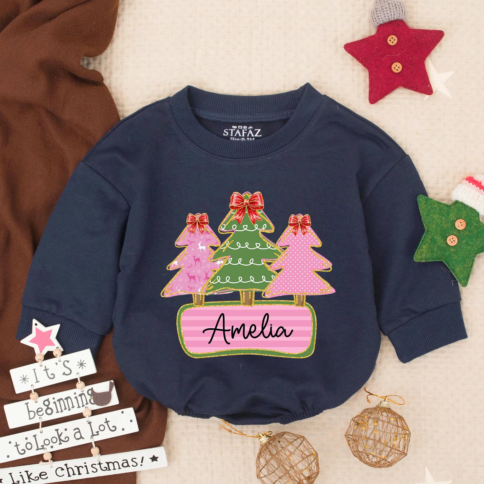 Imagine the joy of seeing your little one in this delightful Christmas romper, perfect for festive gatherings and cozy family moments. Adorned with three charming Christmas trees, with the central tree in a classic green and the flanking ones in a playful pink, each topped with a cheerful red bow, this outfit captures the spirit of the season. Below the trees, a sweet pink banner elegantly displays your child's name in black script, making it a unique keepsake. Crafted from soft, breathable cotton, this romper ensures comfort while your baby celebrates the holidays in style. Whether for a family party or a casual day at home, this personalized piece adds a touch of magic and warmth to any moment. It's more than just clothing; it's a cherished memory of your child's first Christmas. Personalize it with a name to create a one-of-a-kind gift that will be treasured for years to come.