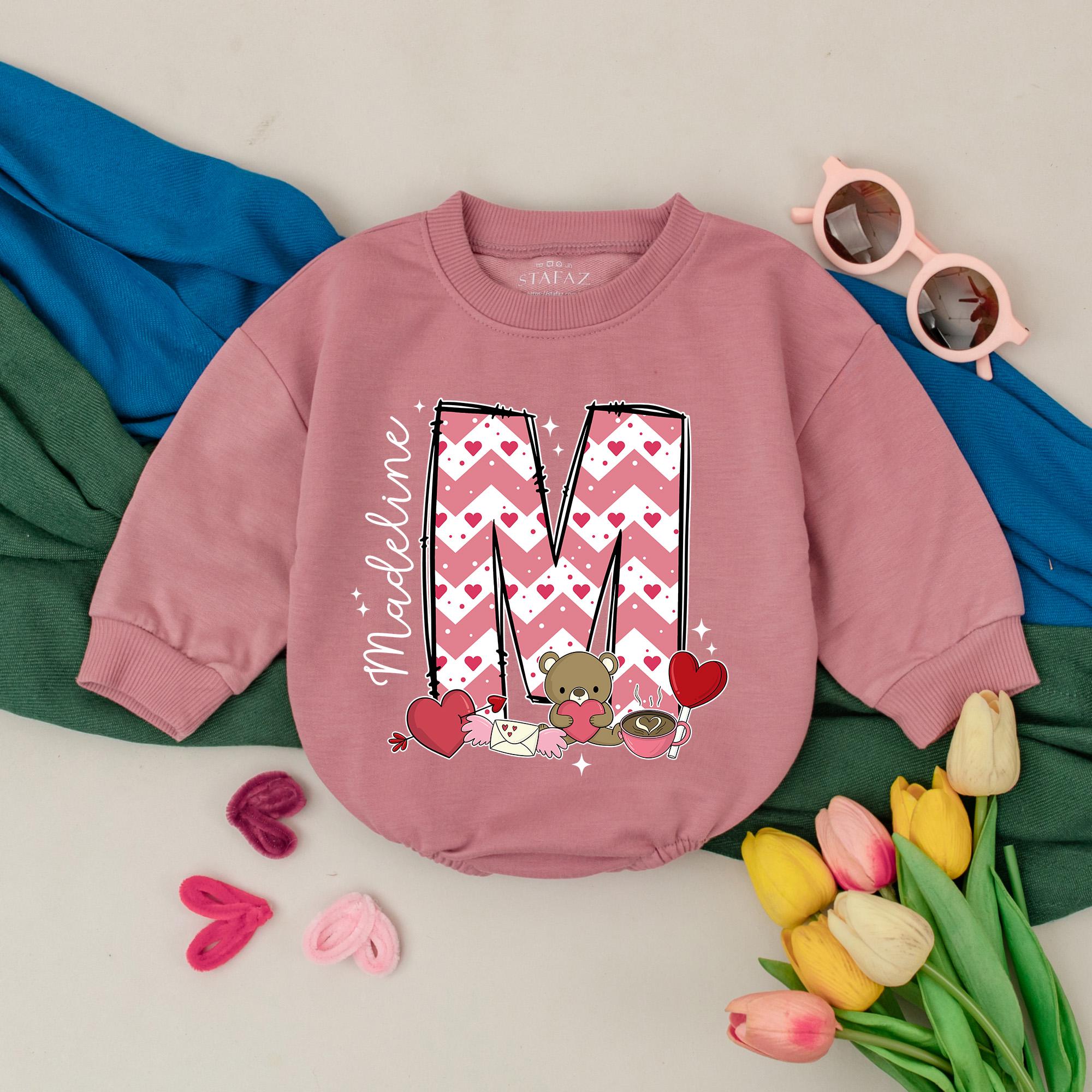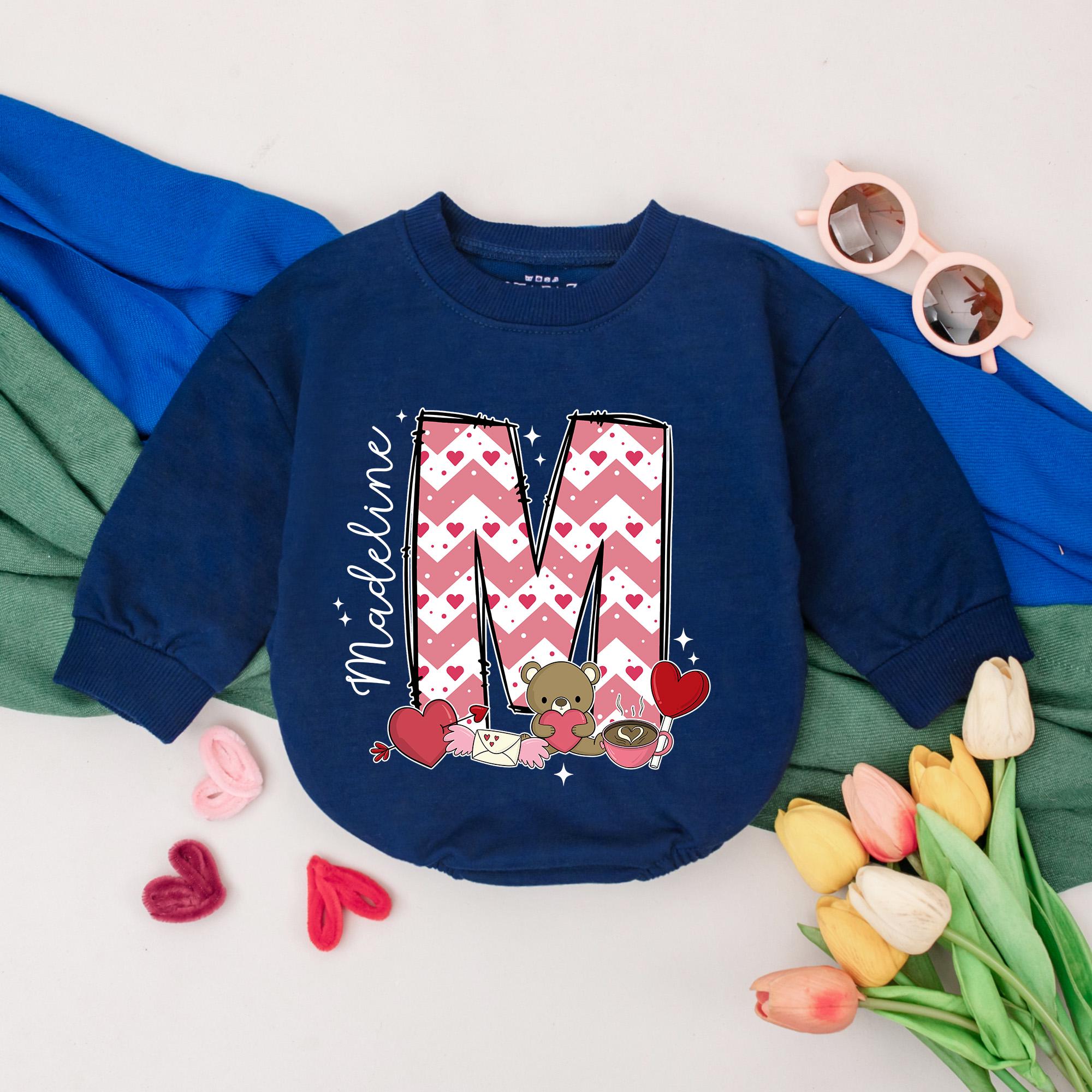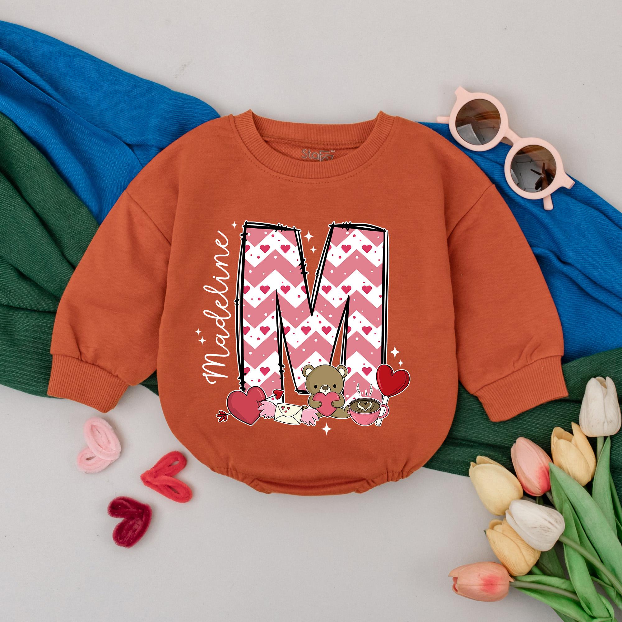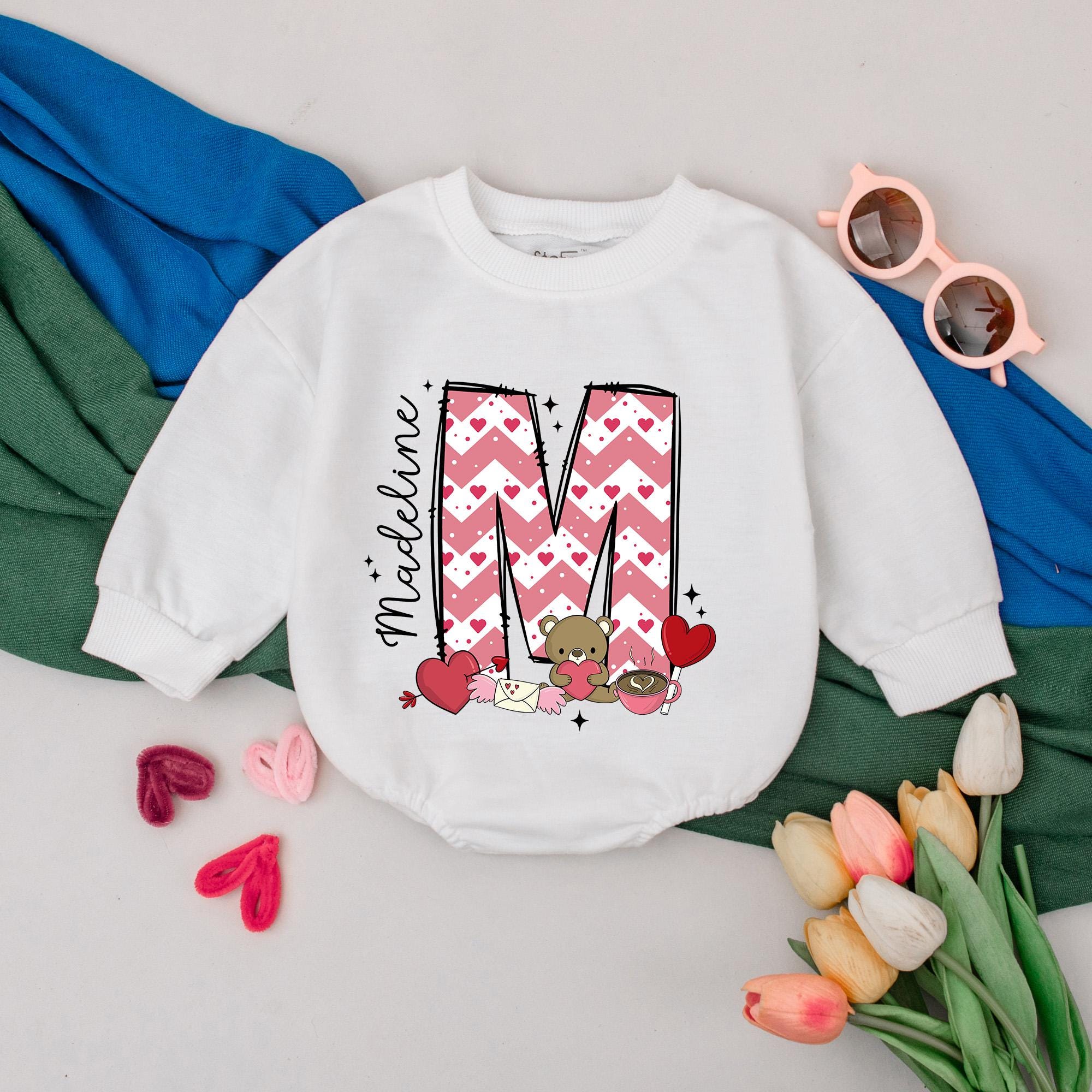 Imagine your little one celebrating her first Valentine's Day in this delightful romper, where every detail is a sweet reminder of love and cherished moments. The large, bold letter 'M' adorned with a playful pink and white chevron pattern captures the eye, while a charming teddy bear holding a heart brings a smile to your face. Two vibrant hearts in red and pink add a festive flair, perfectly complemented by the elegant script of 'Madeline' alongside the 'M'. Crafted for comfort, this soft cotton romper is ideal for cozy family gatherings or as a thoughtful baby shower gift. Personalizing it with her name makes it a treasured keepsake, turning ordinary moments into extraordinary memories. Embrace the joy of this special day and let her shine in this adorable outfit—it's a purchase that promises both style and sentiment.