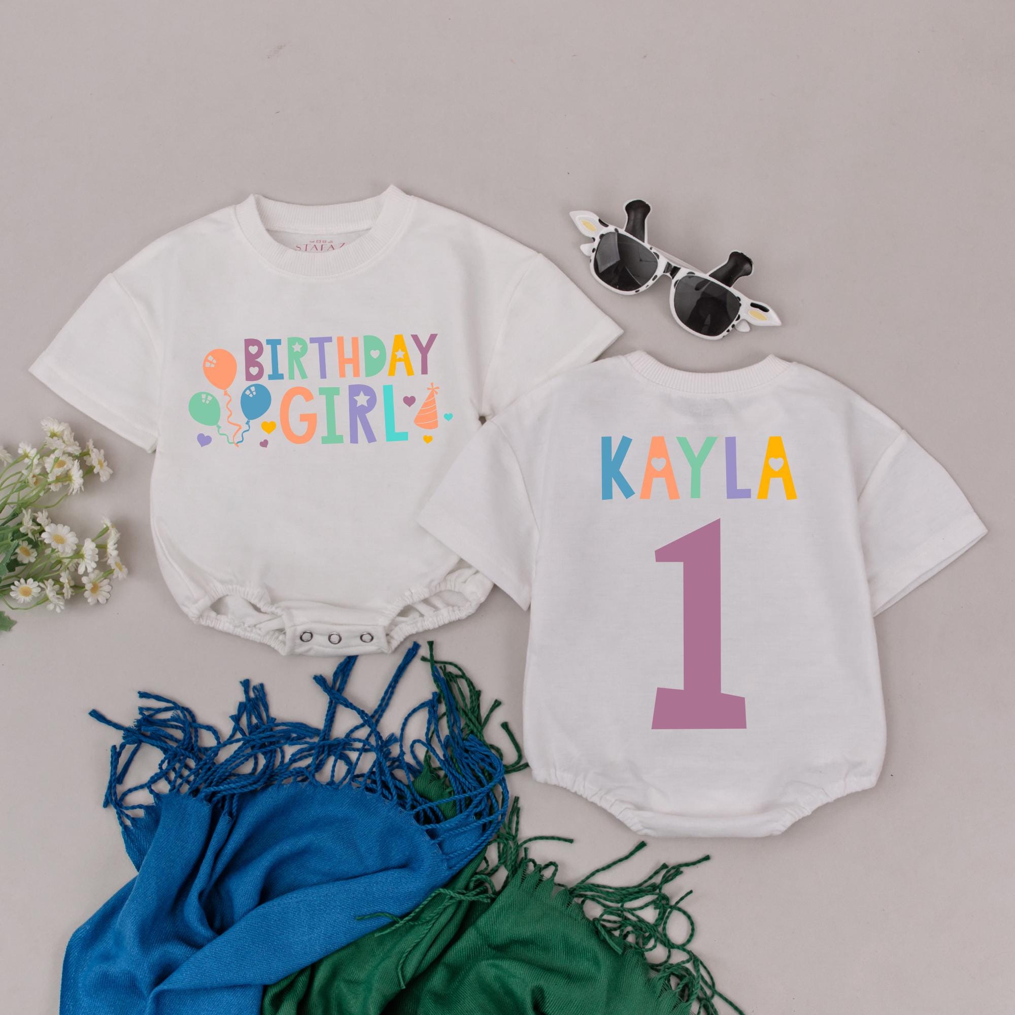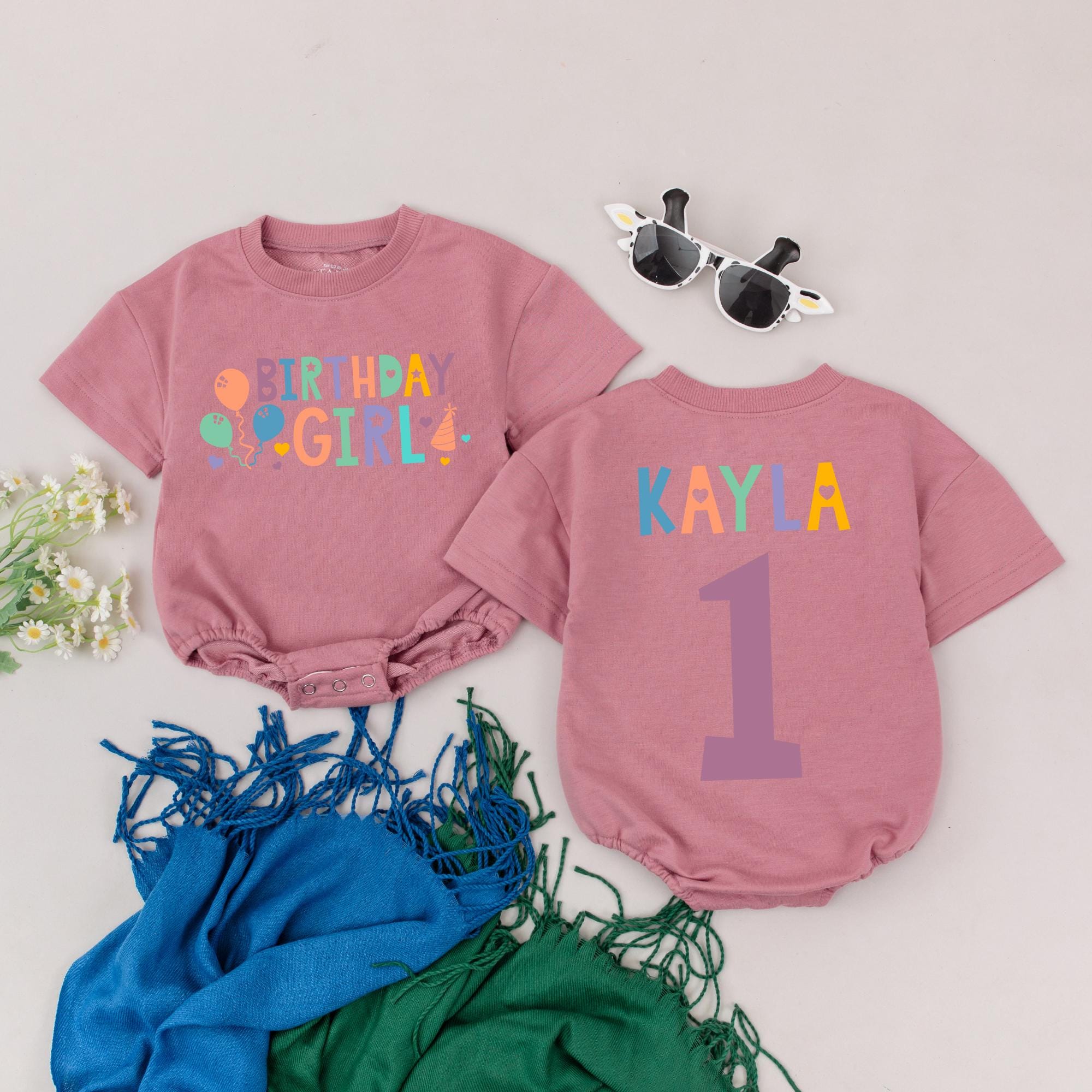 Celebrate your little one's first birthday with pure joy and color! Imagine the delight as Kayla crawls around in her vibrant romper, with 'BIRTHDAY GIRL' splashed across the front in pink, blue, orange, and purple hues. Balloons and stars dance around the letters, creating a festive atmosphere perfect for a joyful party. On the back, her name, 'KAYLA', stands proudly above a large purple number '1', marking this special milestone. This romper isn't just an outfit; it's a keepsake that captures the sweet memory of her first birthday. Gift her this lively, soft bodysuit and let her shine on her special day, a moment she’ll cherish in photos for years to come. Personalizing it with her name adds a unique touch, making it a cherished memento of this unforgettable occasion.