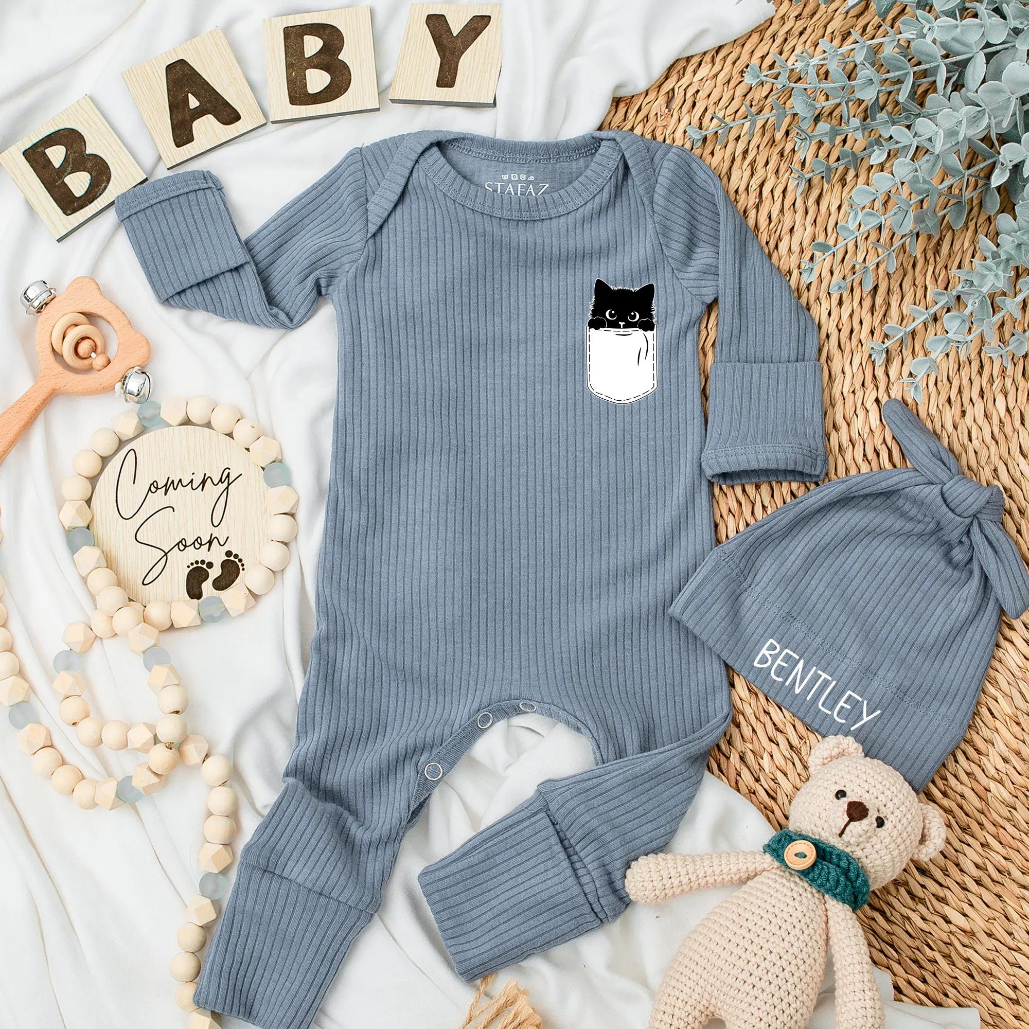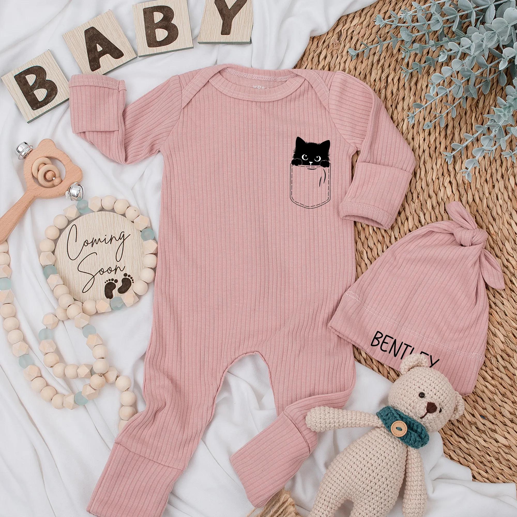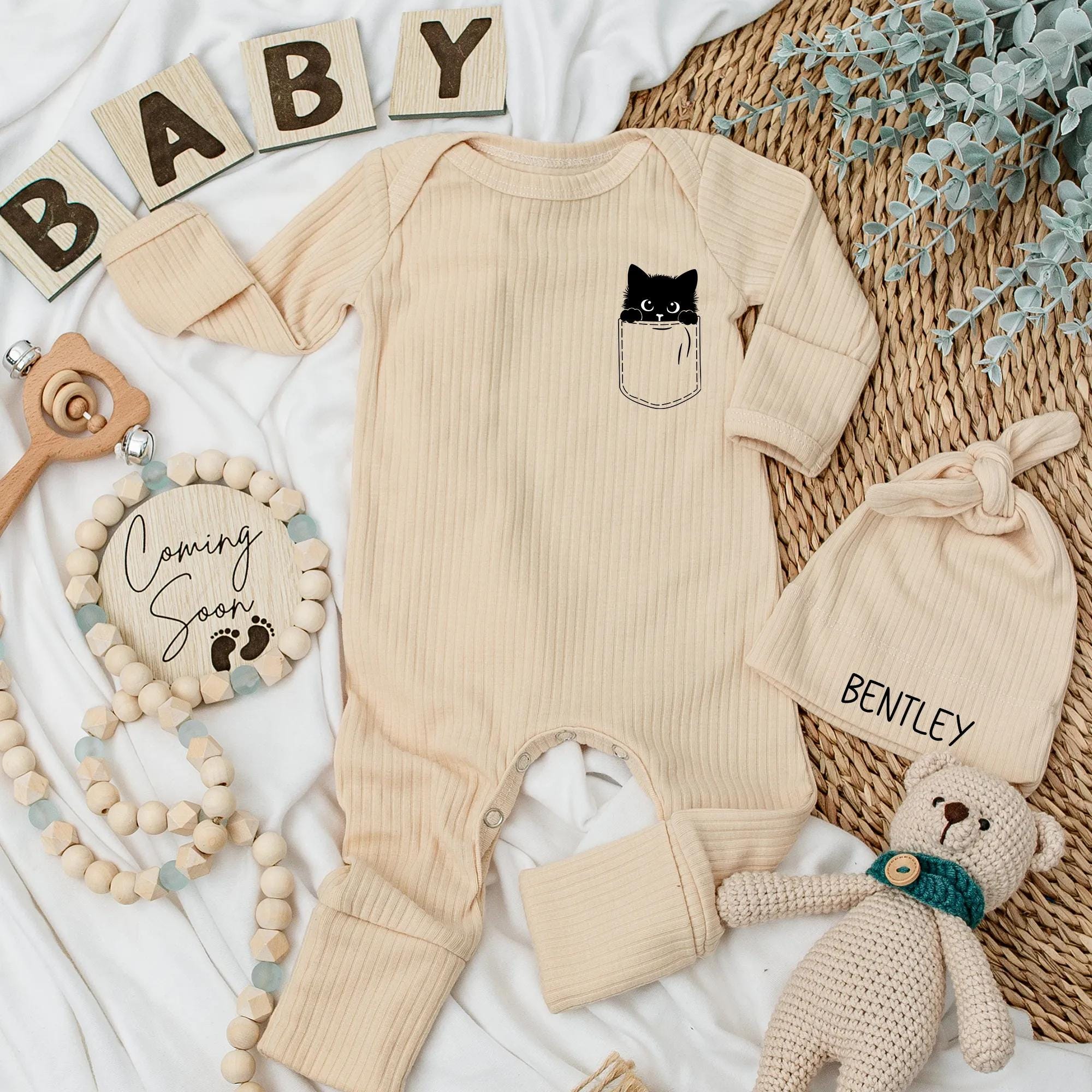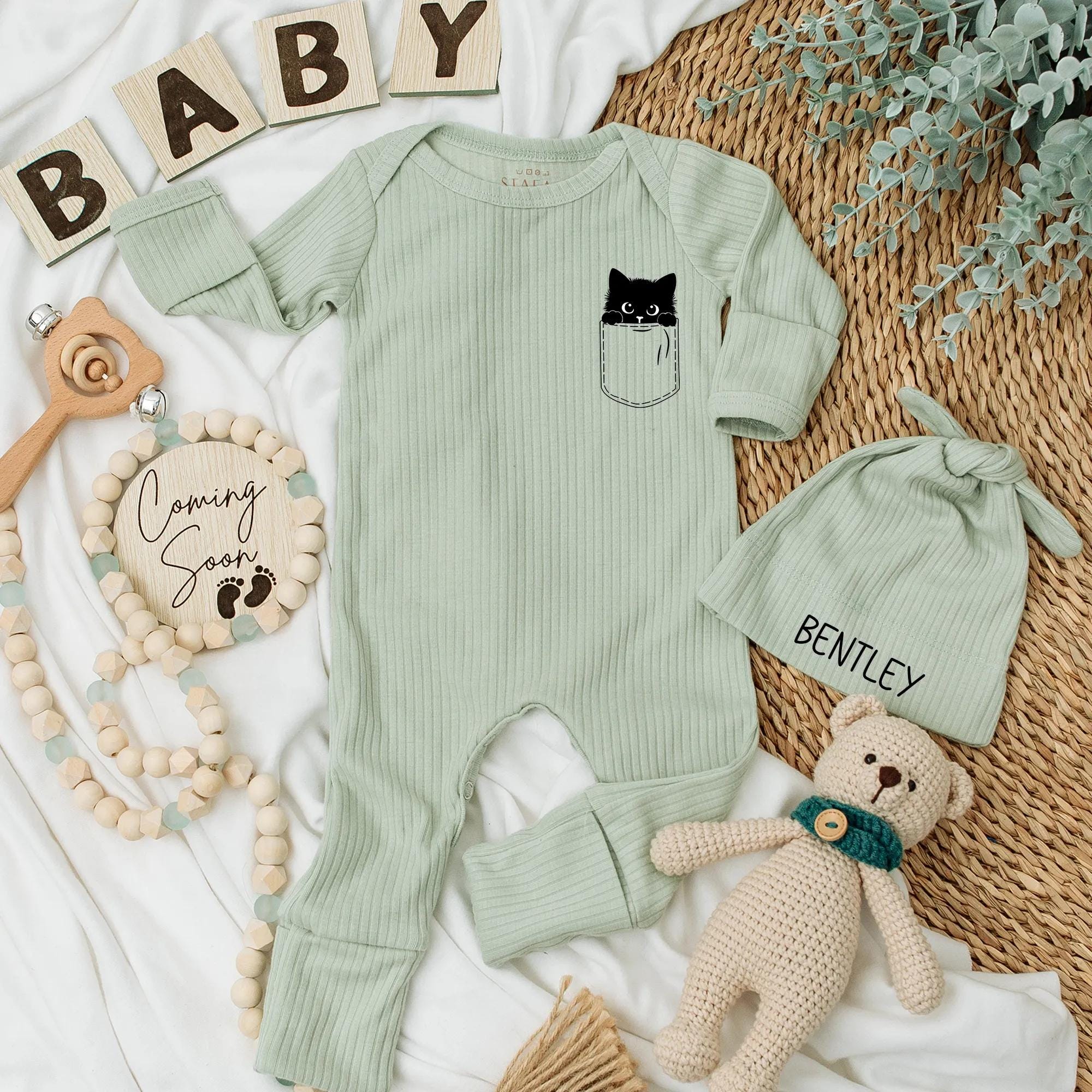 Imagine your little one dressed in this charming bodysuit, perfect for a cozy Halloween celebration. With a playful design featuring a cute black cat peeking out from a printed pocket, this outfit brings a whimsical touch to any festive gathering. The minimalist expression of the cat adds to its charm, making it an adorable choice for your baby's holiday wardrobe. Crafted from soft cotton, it's not only comfortable but also durable for all-day wear. Whether it's a family get-together or a casual day out, this romper makes for a delightful baby shower gift. Add a personal touch by choosing a name to print on the matching hat, turning it into a cherished keepsake. Capture joyful moments and create lasting memories with this unique and heartwarming outfit.