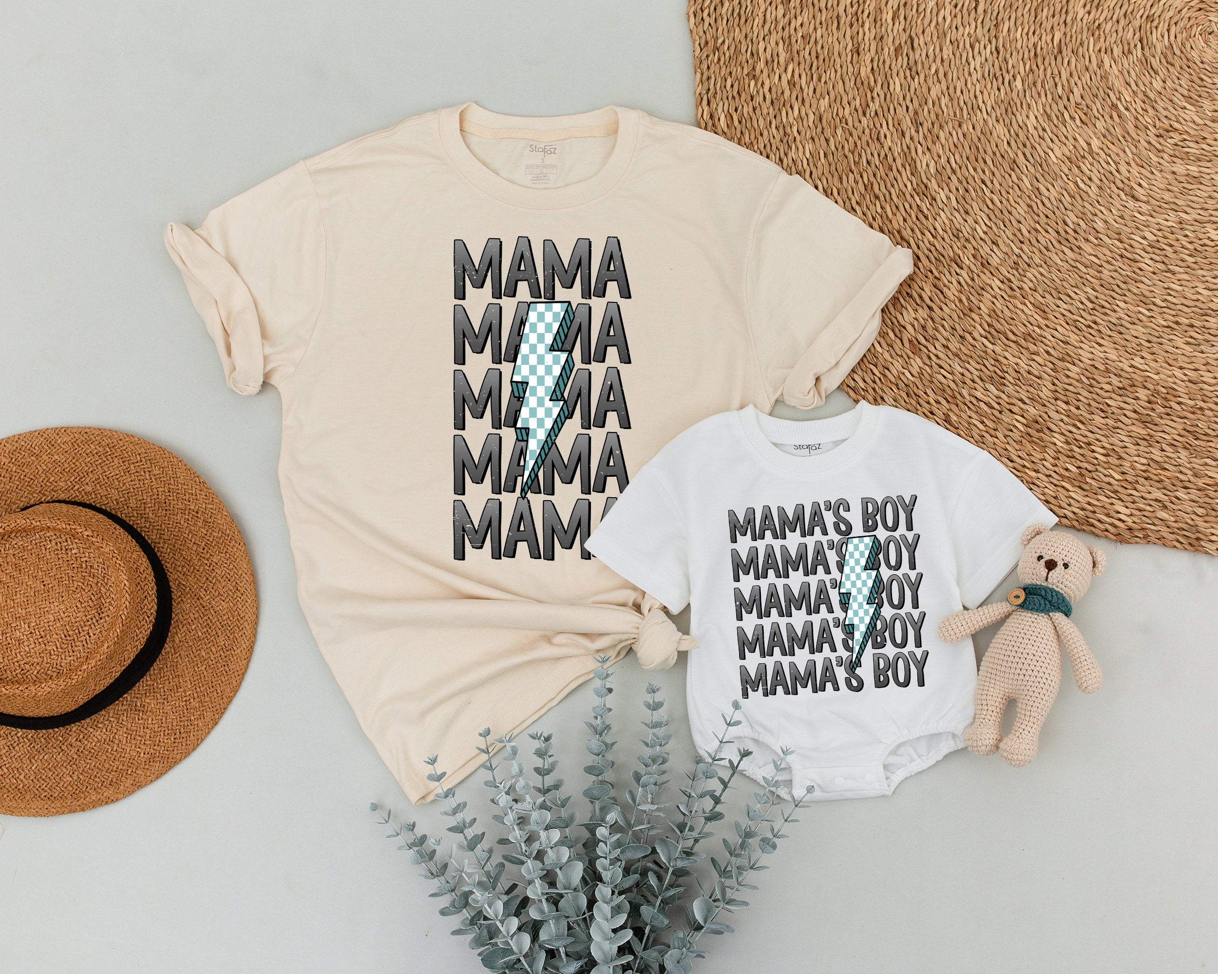 Imagine the joy of stepping out with your little one, both clad in matching shirts that celebrate the special bond between a mom and her son. The bold, black text 'MAMA' and 'MAMA'S BOY' is creatively interrupted by a striking blue and white checkered lightning bolt, adding a playful and modern touch to your outfits. Perfect for a relaxed weekend brunch or a lively holiday gathering, these soft cotton shirts ensure comfort and style. The matching design not only strengthens family ties but also turns everyday moments into cherished memories. Personalize these outfits with custom details to make them truly unique, a sentimental gift that stands out at any baby shower. Capture this special connection and create lasting memories with these delightful matching shirts.