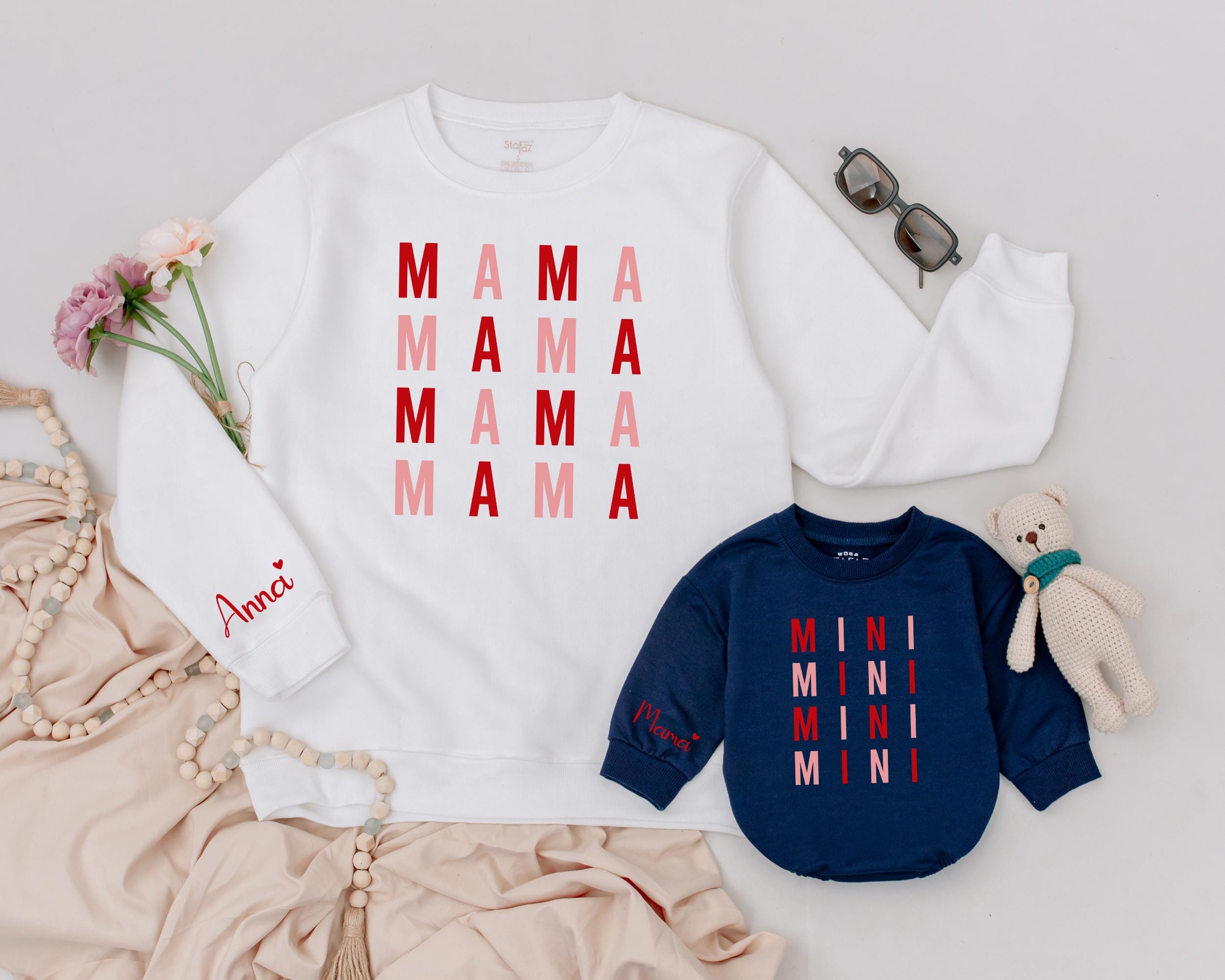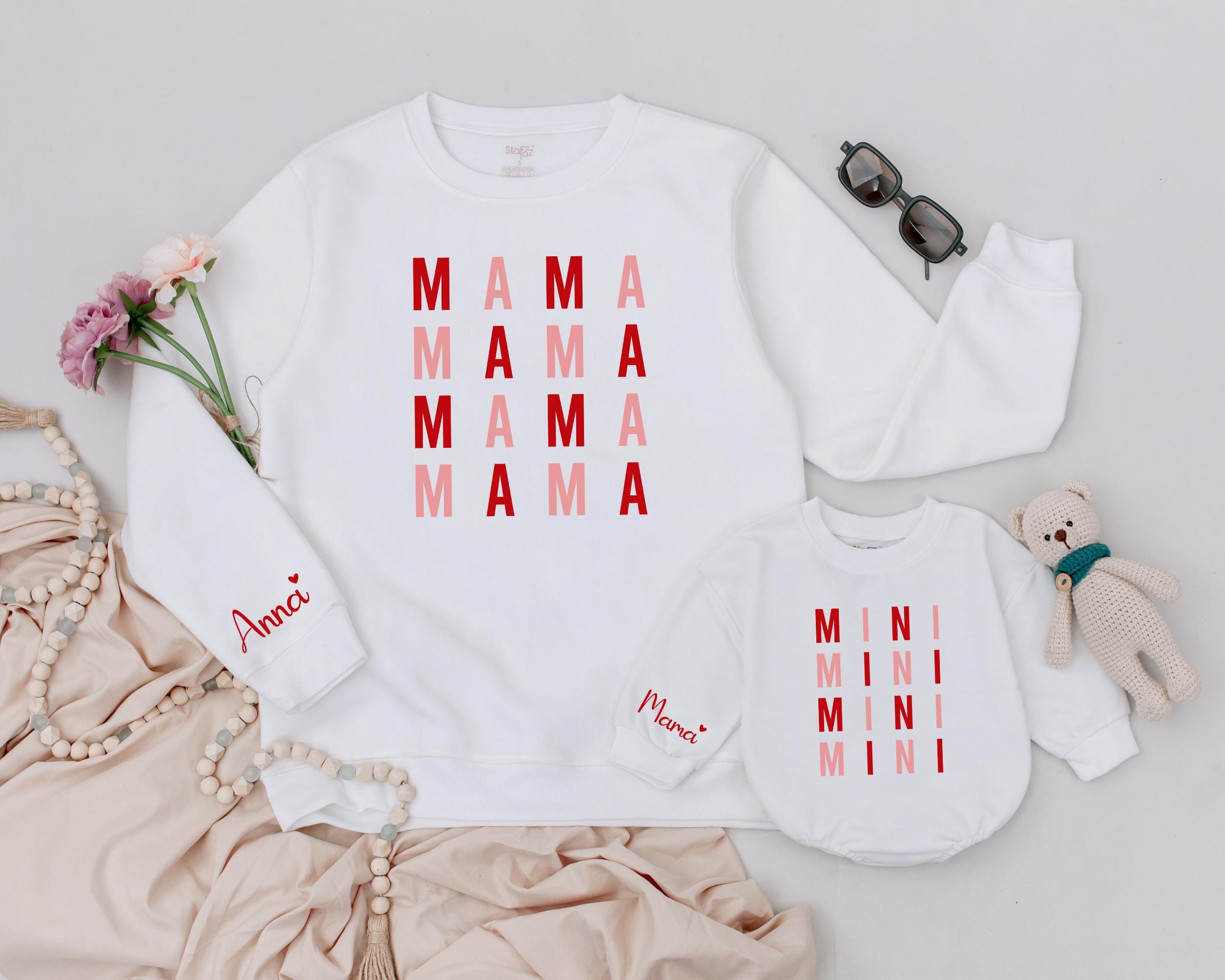 Custom Mama and Mini Matching Sweatshirts Personalized Valentine Gift for Mom and Baby with Red and Pink Text Family Outfit