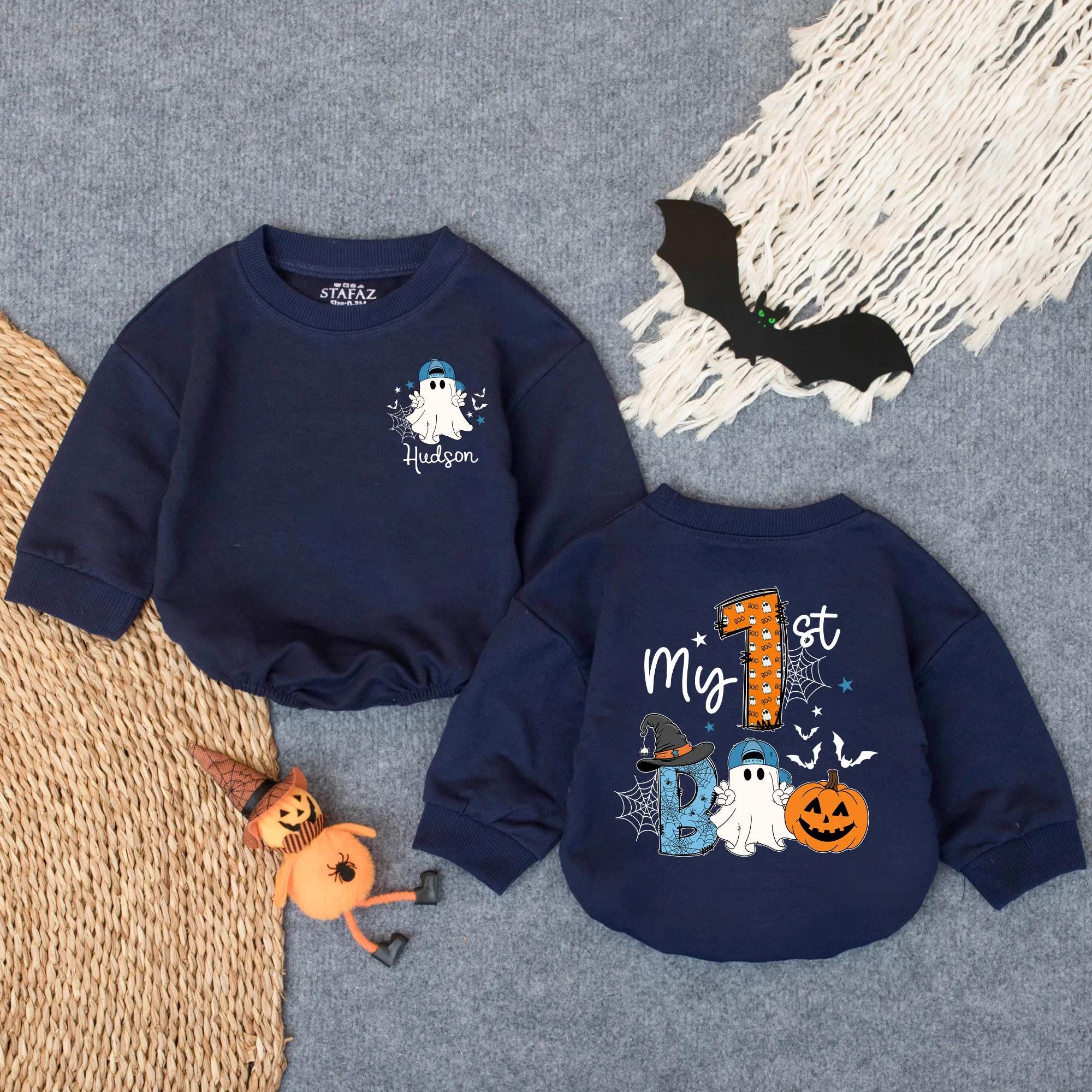 Celebrate your little one's first Halloween with a playful touch of whimsy! Picture your baby dressed in this adorable romper, featuring a cute ghost in a blue hat and a smiling pumpkin. The cheerful design, with 'My 1st Boo' adorned in festive colors of orange, blue, and black, captures the essence of fun and celebration. Perfect for cozy family gatherings or capturing precious moments in photos, this romper makes a delightful keepsake. Adding your baby's name transforms it into a cherished memento that family and friends will adore. It's more than just an outfit; it's a memory-making piece that brings joy and warmth to your Halloween festivities. Make this special occasion unforgettable by personalizing it for a unique touch.