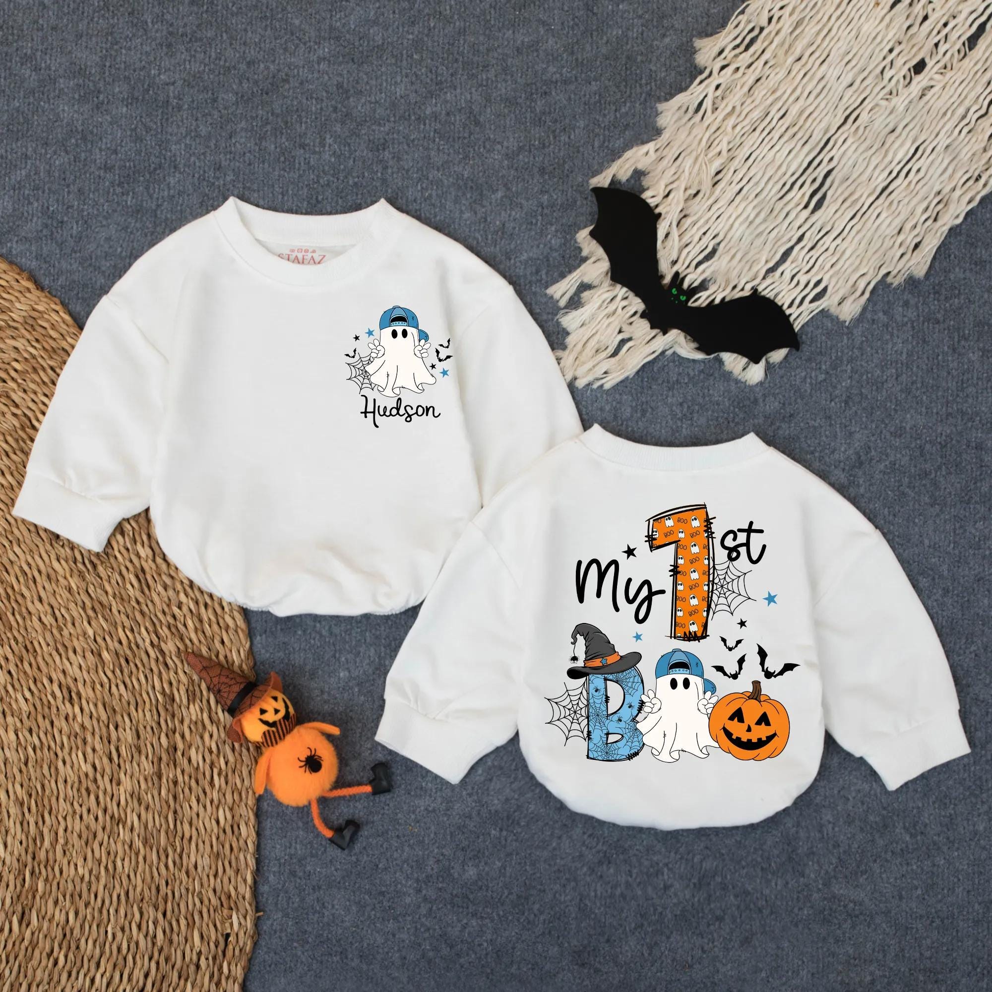 Custom My 1st Boo Baby Boy Romper Halloween Ghost Pumpkin Outfit Personalized Name Bodysuit Cute Fall Infant Clothes Blue Hat Orange