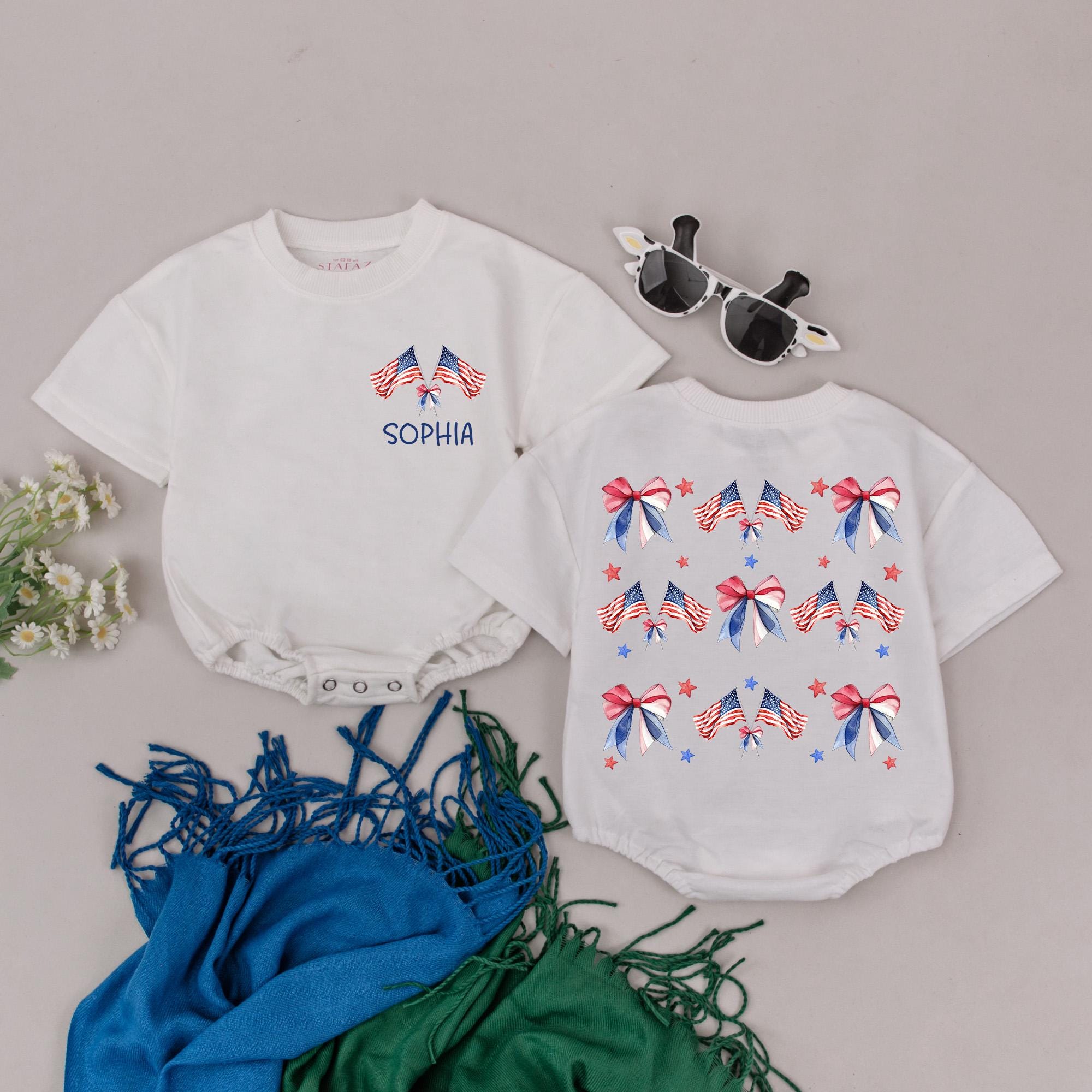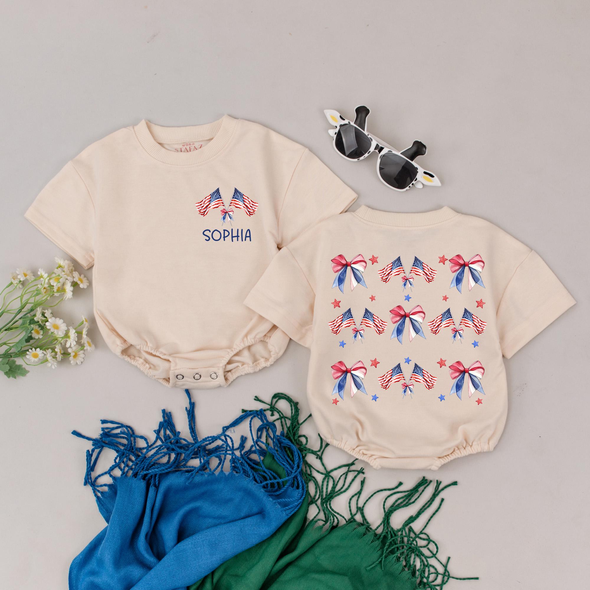 Imagine your little one sparkling with joy at the 4th of July family barbecue, dressed in a romper that truly celebrates the spirit of the day. This adorable outfit features a patriotic design with vivid red, white, and blue hues, complete with charming American flag-inspired bows on the front. Below the bows, the name 'SOPHIA' is proudly displayed, adding a sweet personal touch. The back is a lively pattern of bows adorned with stars and stripes, complemented by scattered red and blue stars, capturing the festive and cheerful essence of Independence Day. This romper is perfect for holiday gatherings or as a thoughtful gift that turns into a treasured keepsake. Let your baby girl shine in style and create lasting memories with this delightful outfit, a true celebration of family and freedom.