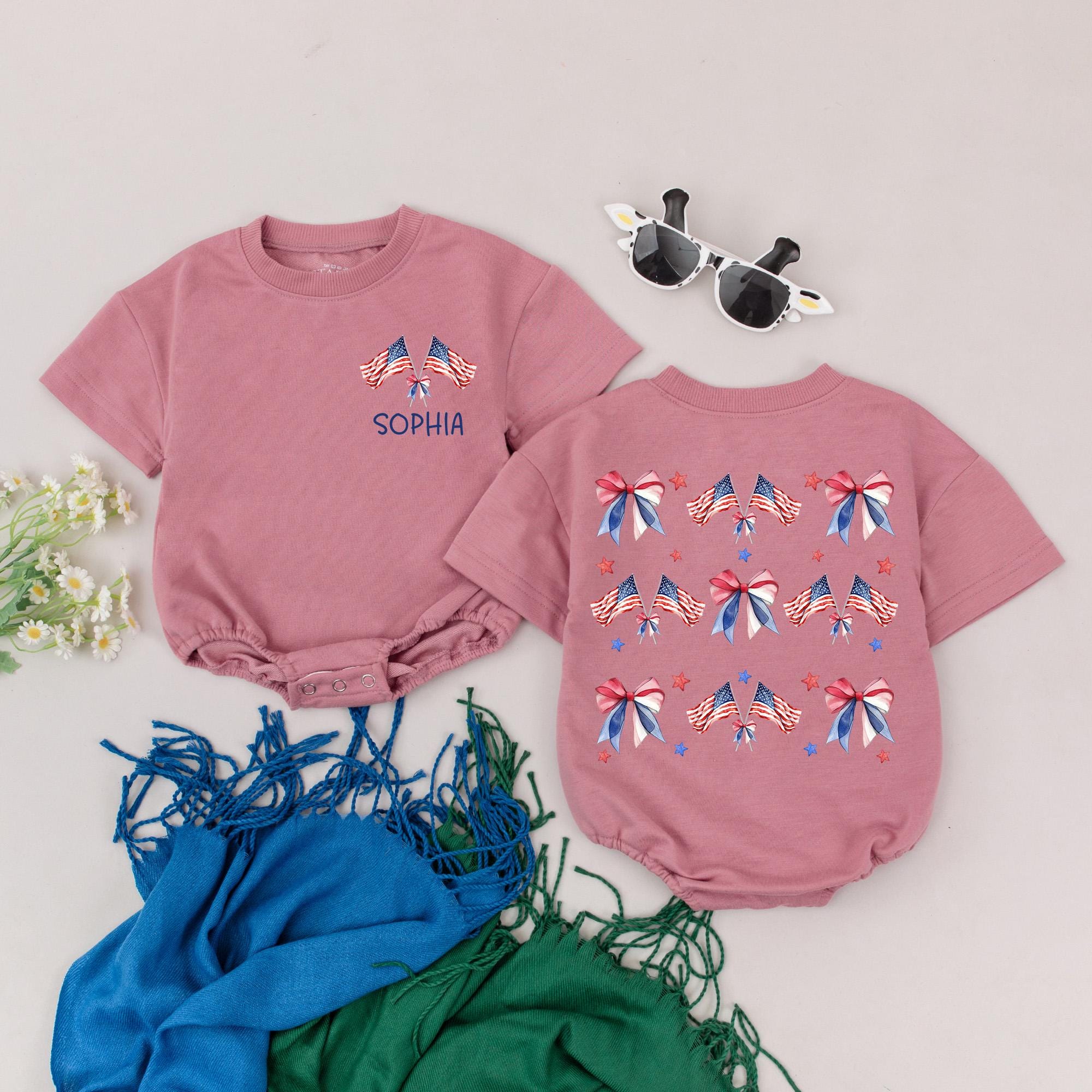 Custom Name 4th of July Baby Girl Romper Patriotic Bow Stars Stripes Infant Clothes Festive Red White Blue Outfit for Holiday Celebration