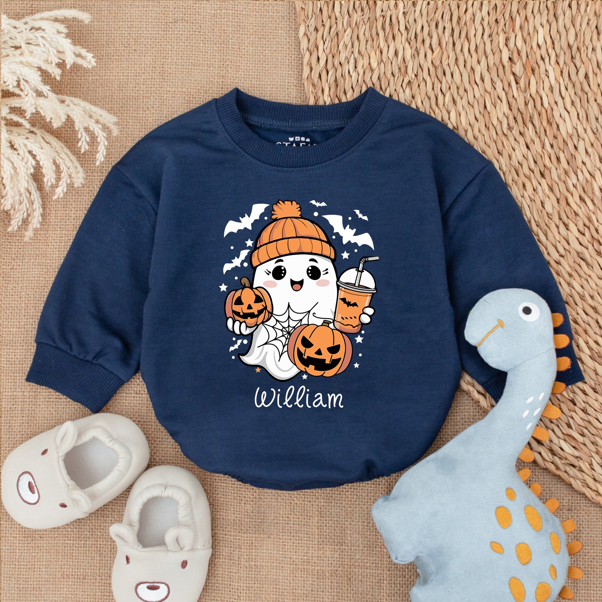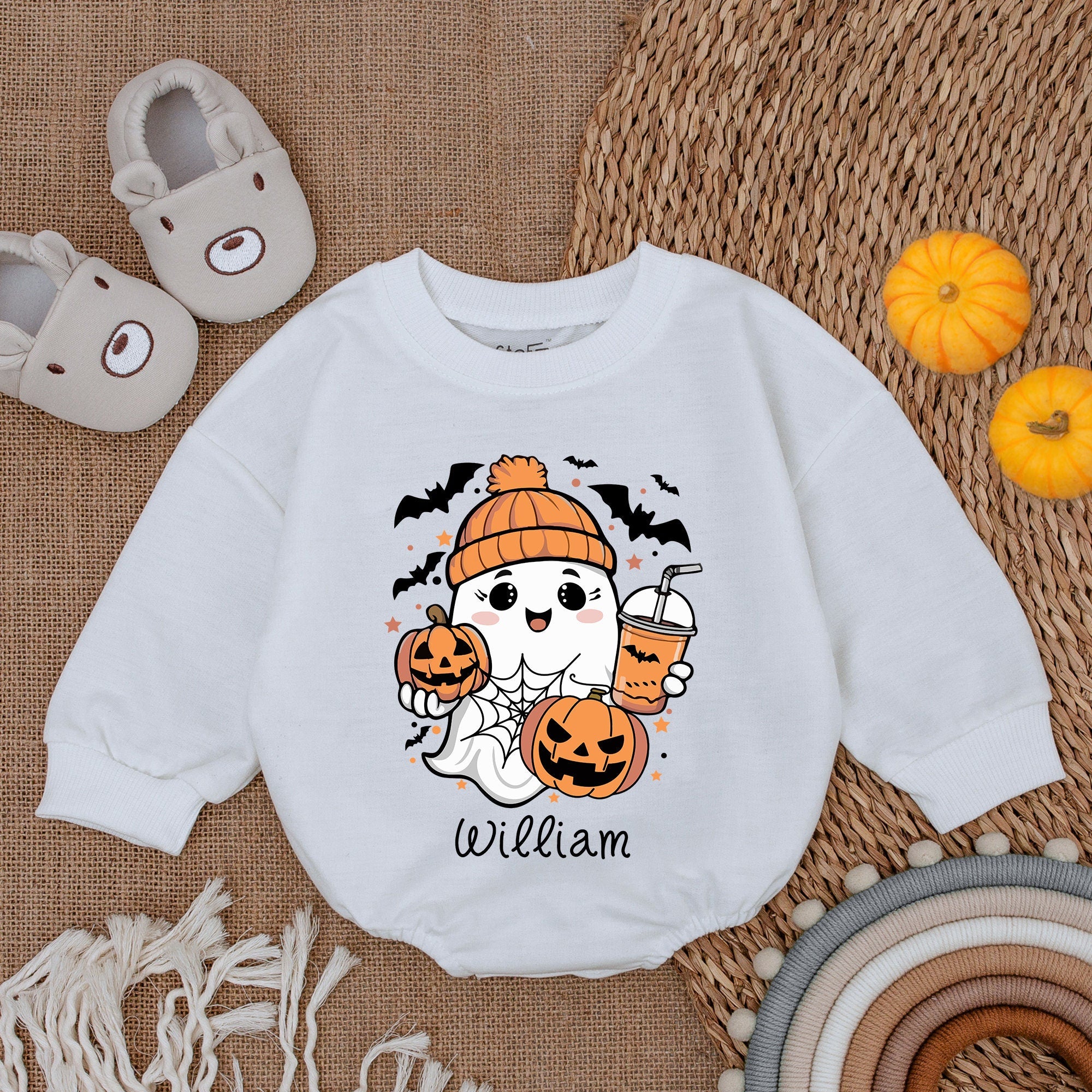 Custom Name Baby Ghost Romper Cozy Halloween Outfit with Pumpkin and Bats Cute Infant Holiday Gift Comfortable Cotton Romper