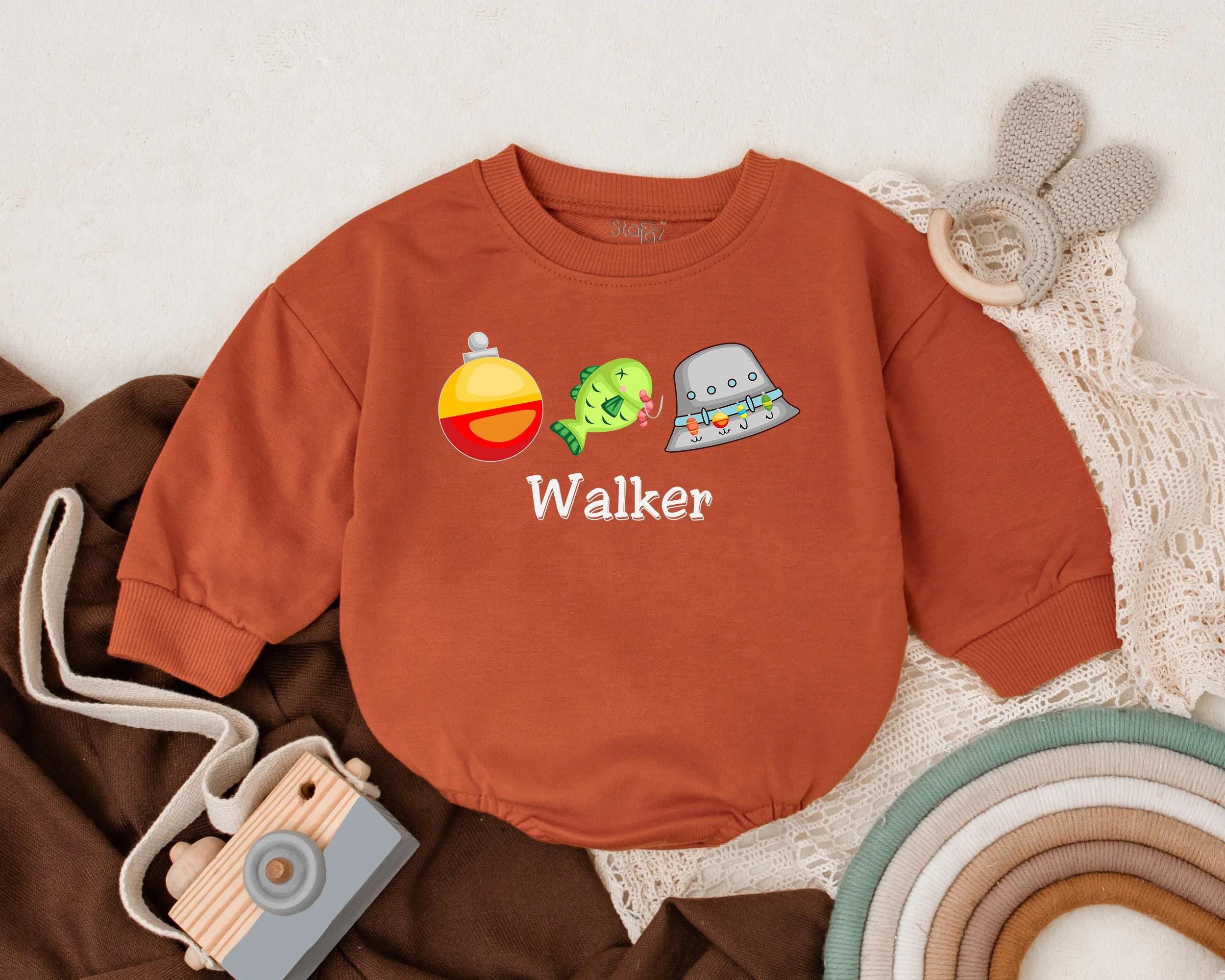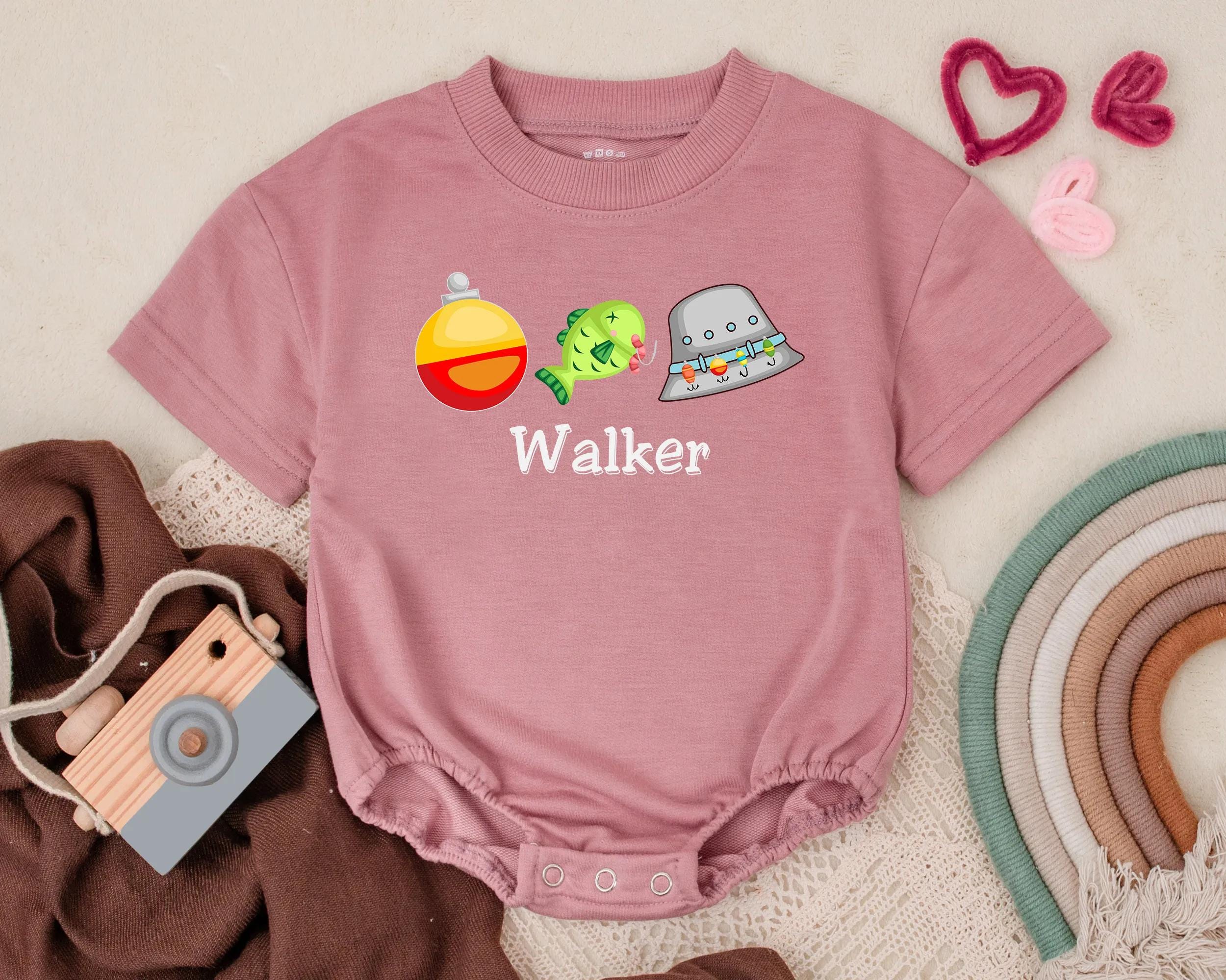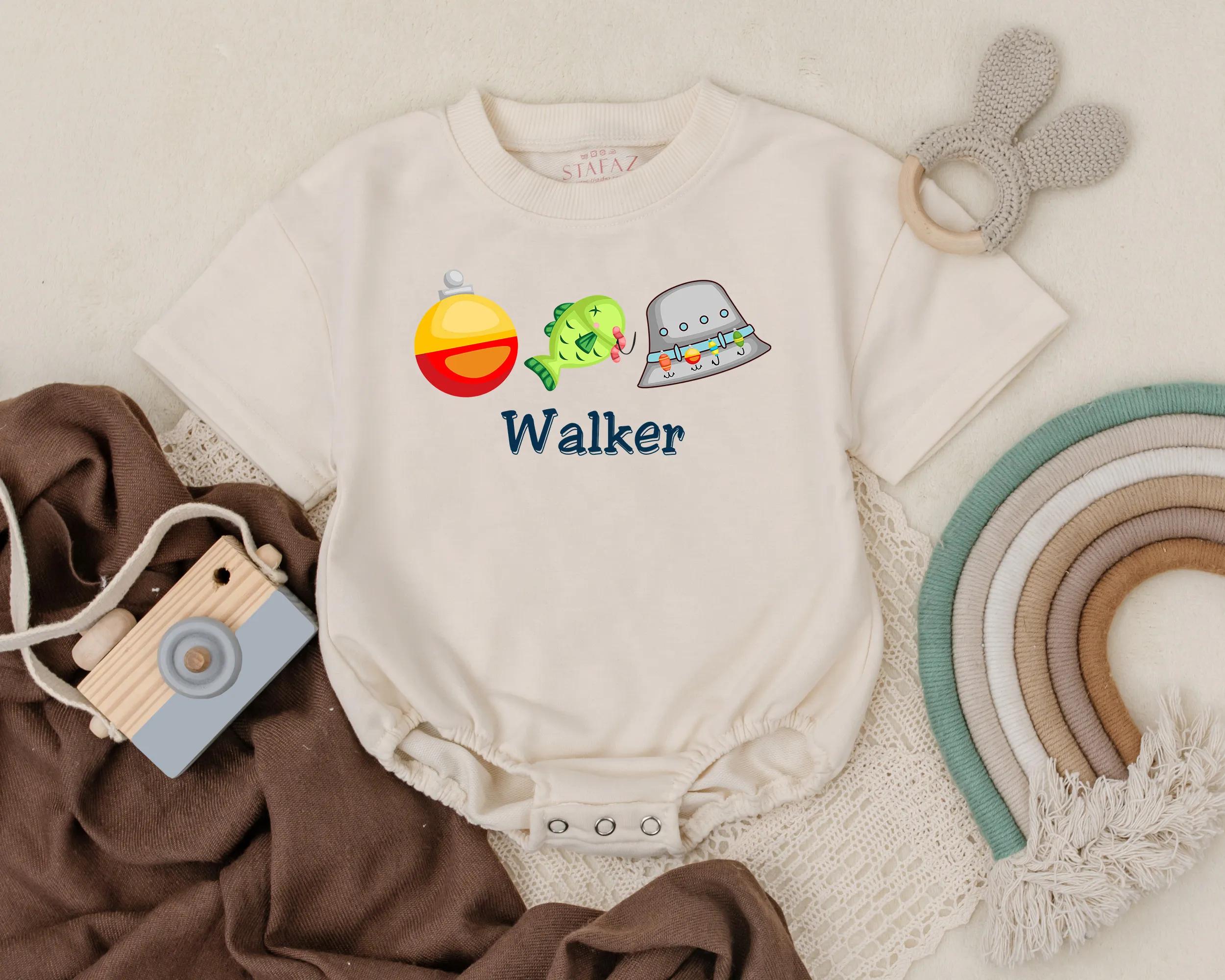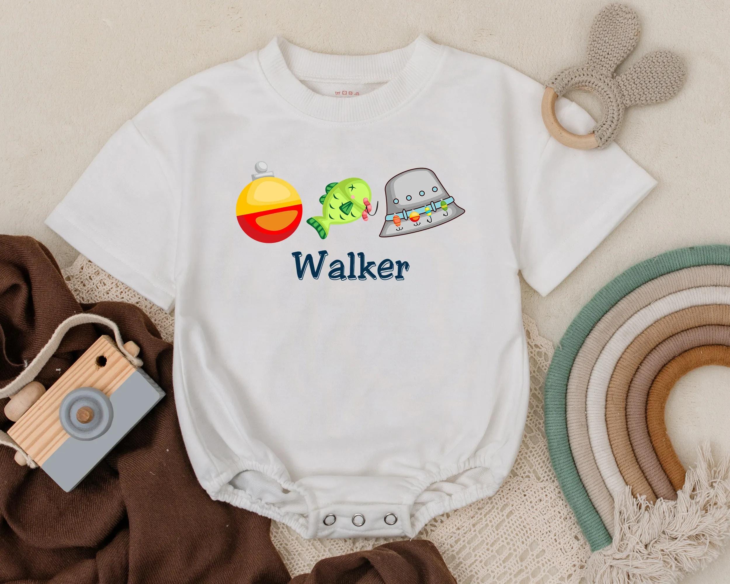 Imagine a sunny day by the lakeside, where laughter echoes and little feet dance on the grass. This delightful romper captures that playful, carefree spirit, adorned with a cheerful green fish and a bright red and yellow bobber that seem to leap with joy. A charming gray fishing hat, decorated with colorful lures, completes the look, making it perfect for your little one's summer adventures. The name 'Walker' is printed in bold, blue text, adding a personal touch that transforms this outfit into a cherished keepsake. Whether for a casual family picnic or a fun-filled party, this romper will surely bring smiles and fond memories. Gift it for a birthday or any special occasion, and invite loved ones to capture those precious moments of childhood wonder. Let this romper be the start of new adventures, where every wear tells a story.