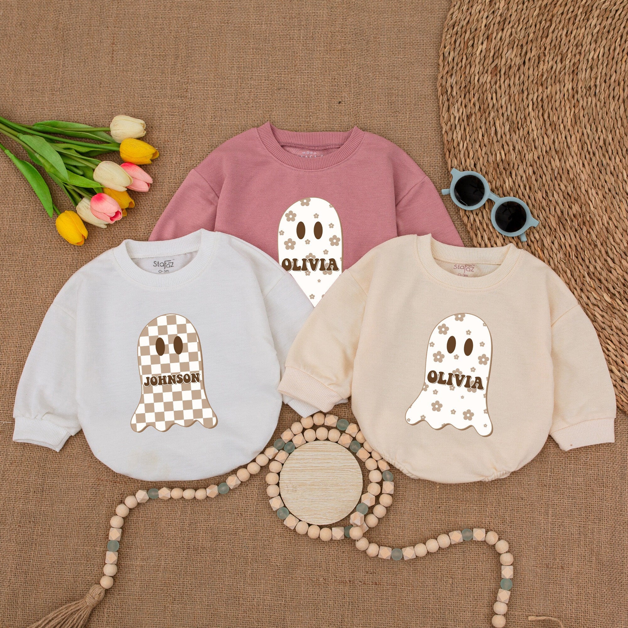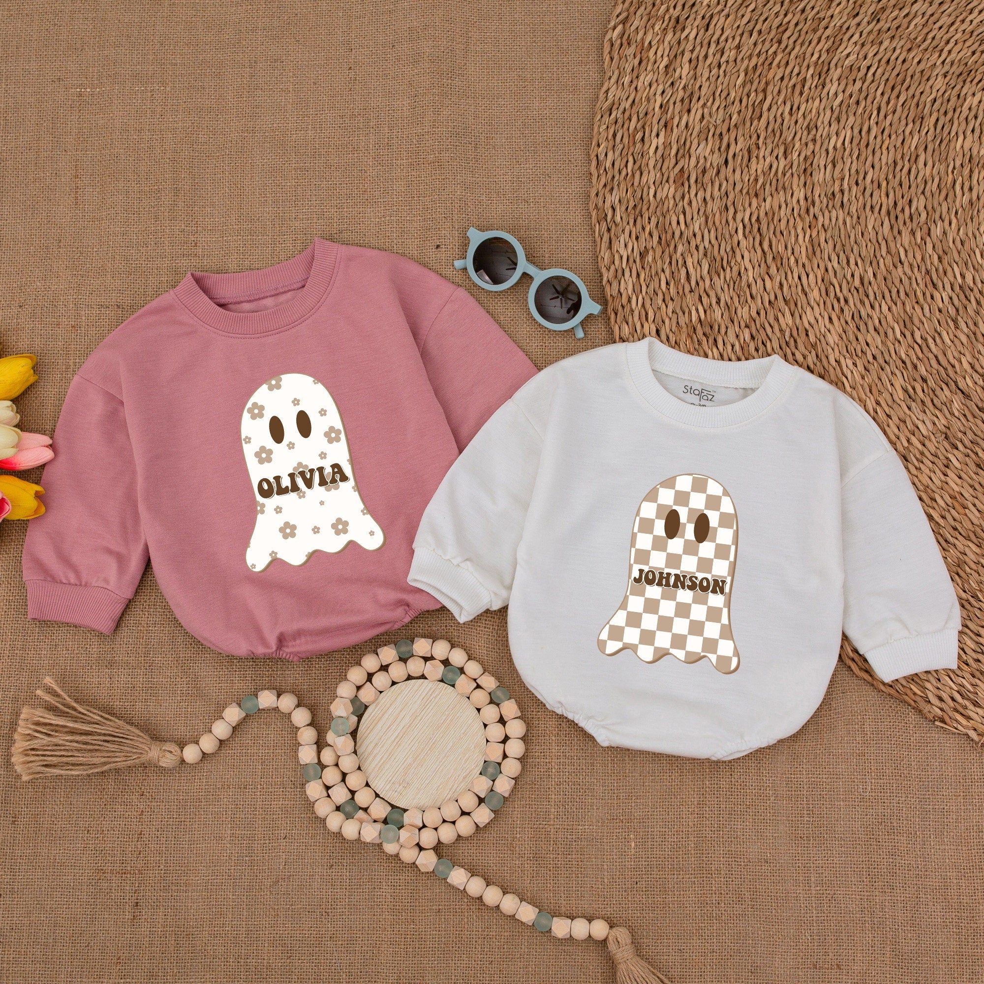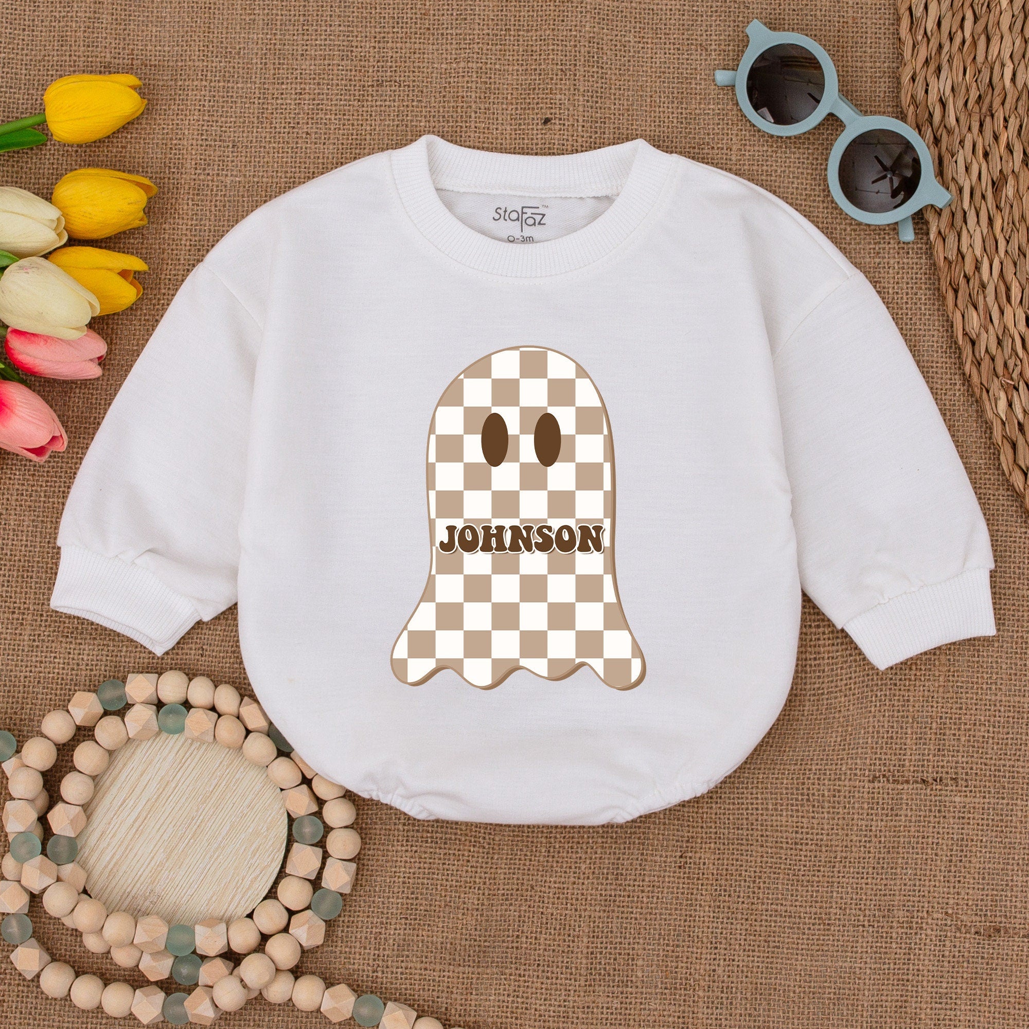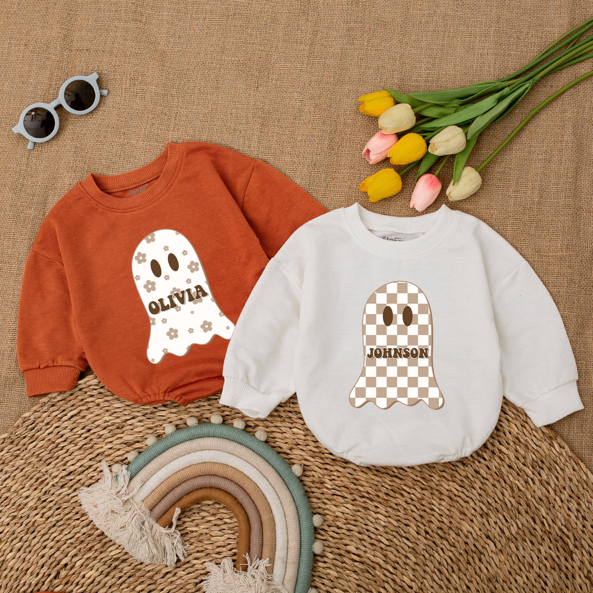 Custom Name Halloween Ghost Baby Romper with Flowers or Checkered Design Soft Cotton Outfit for Birthday Fall Infant or Toddler Gift
