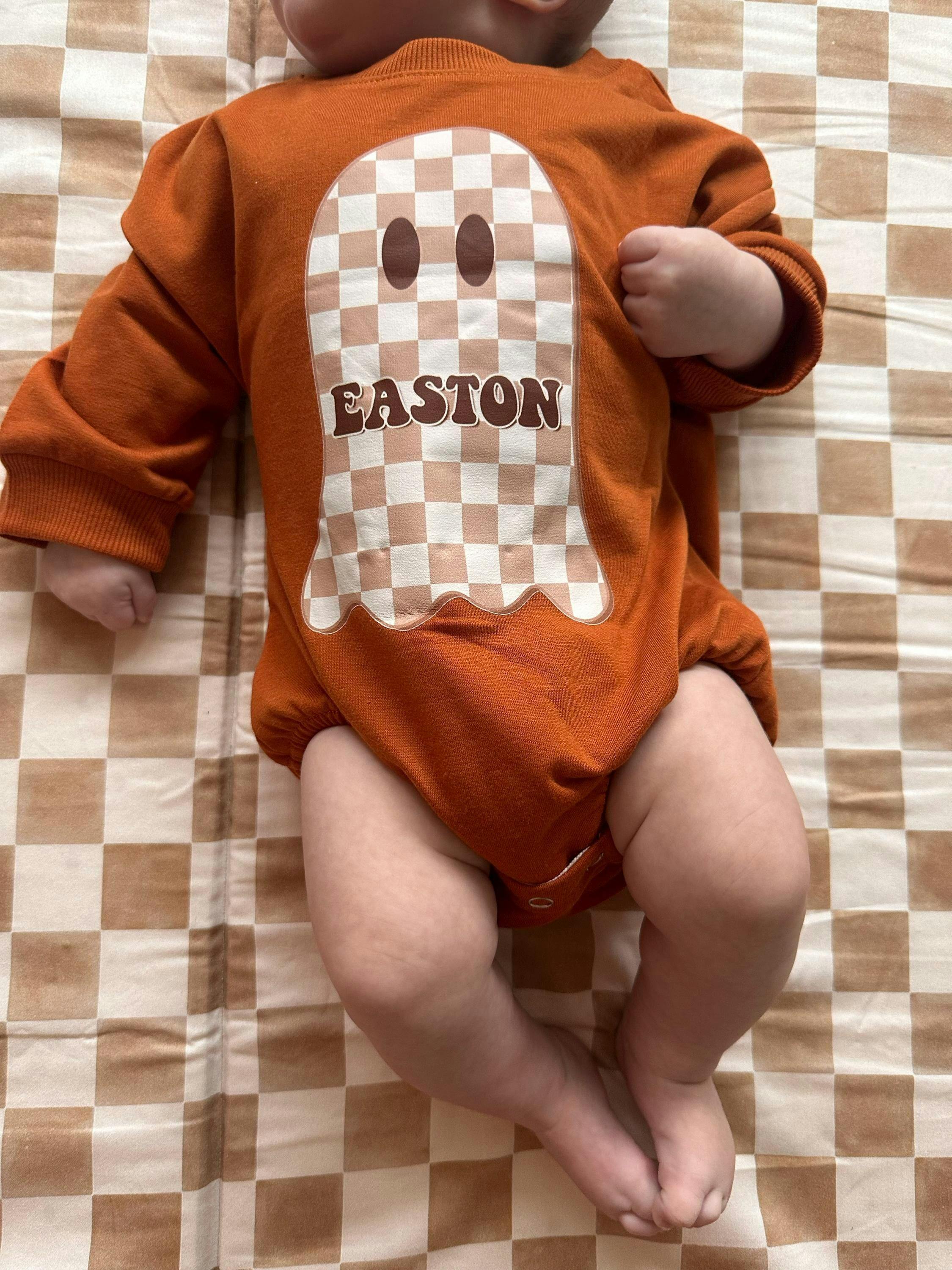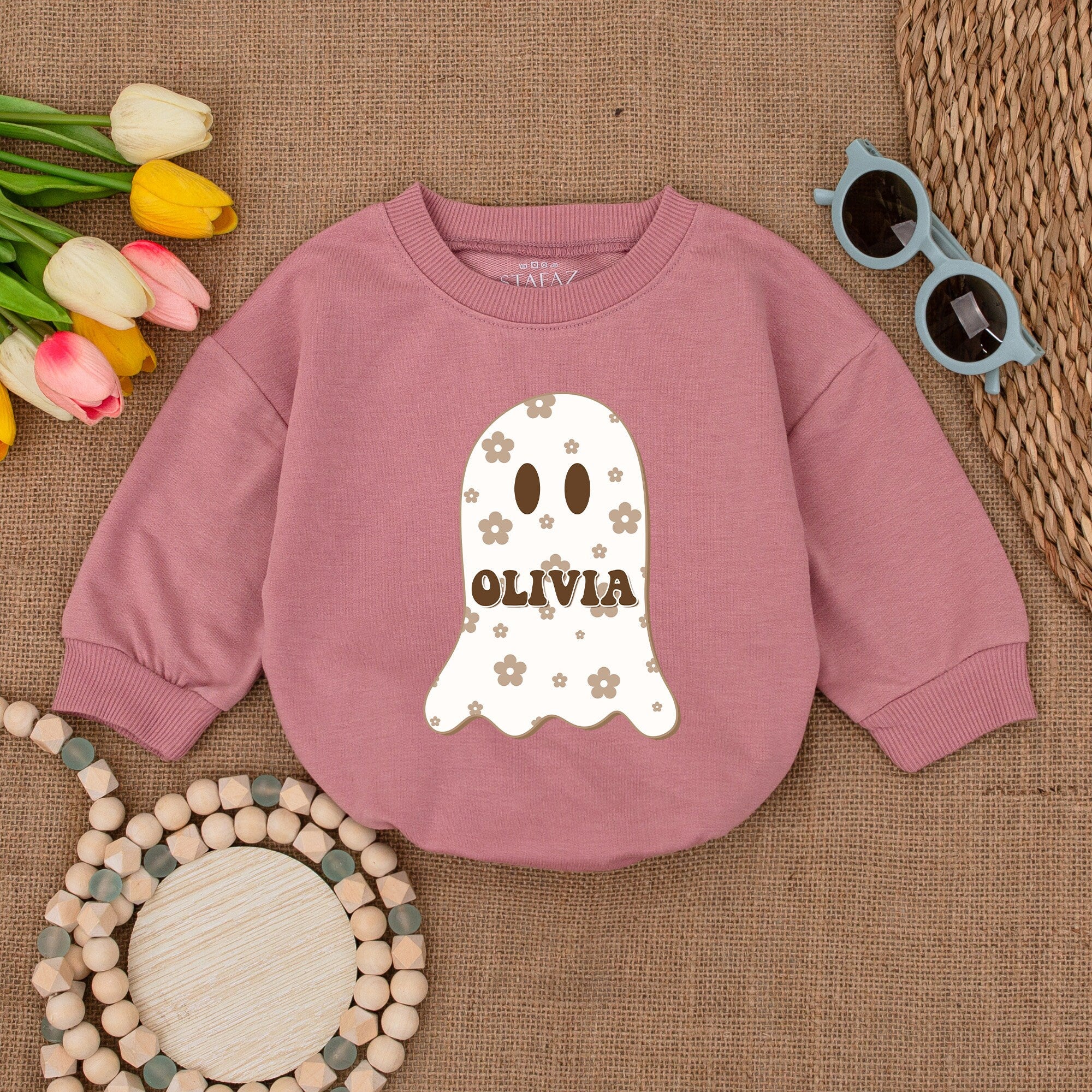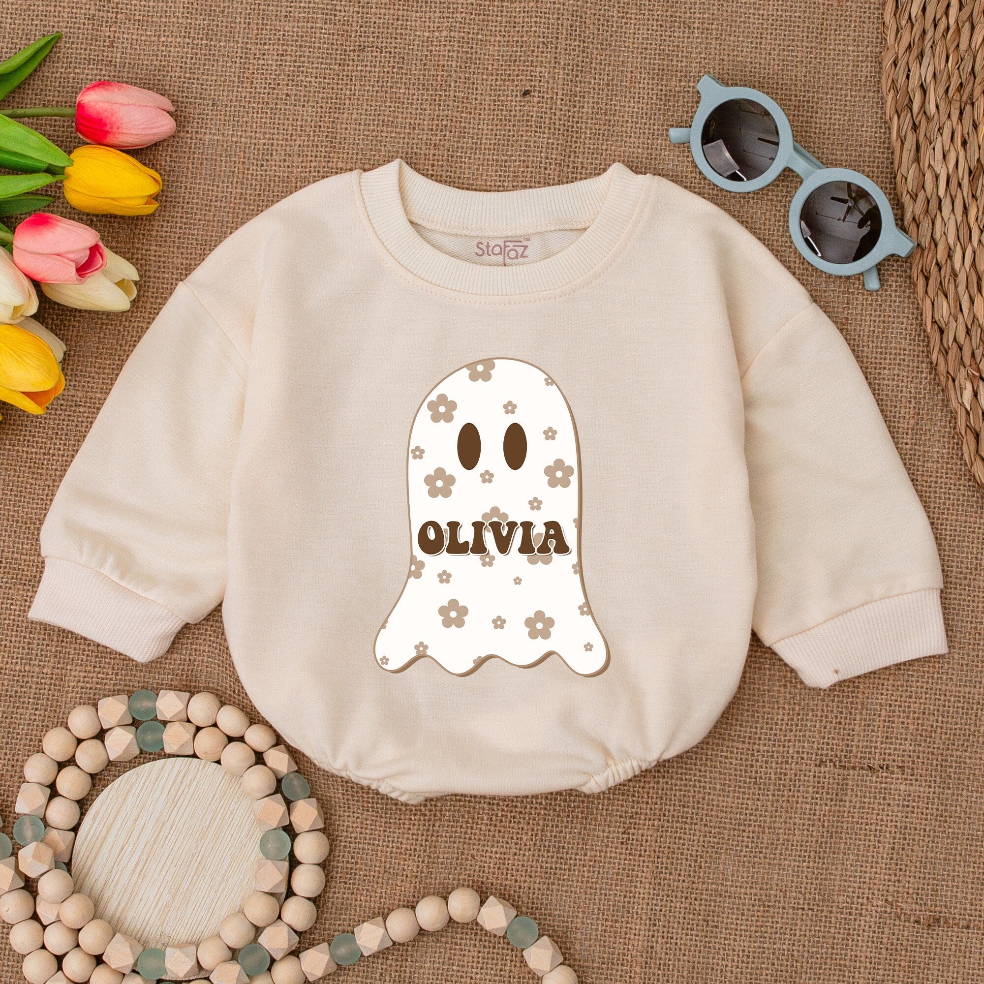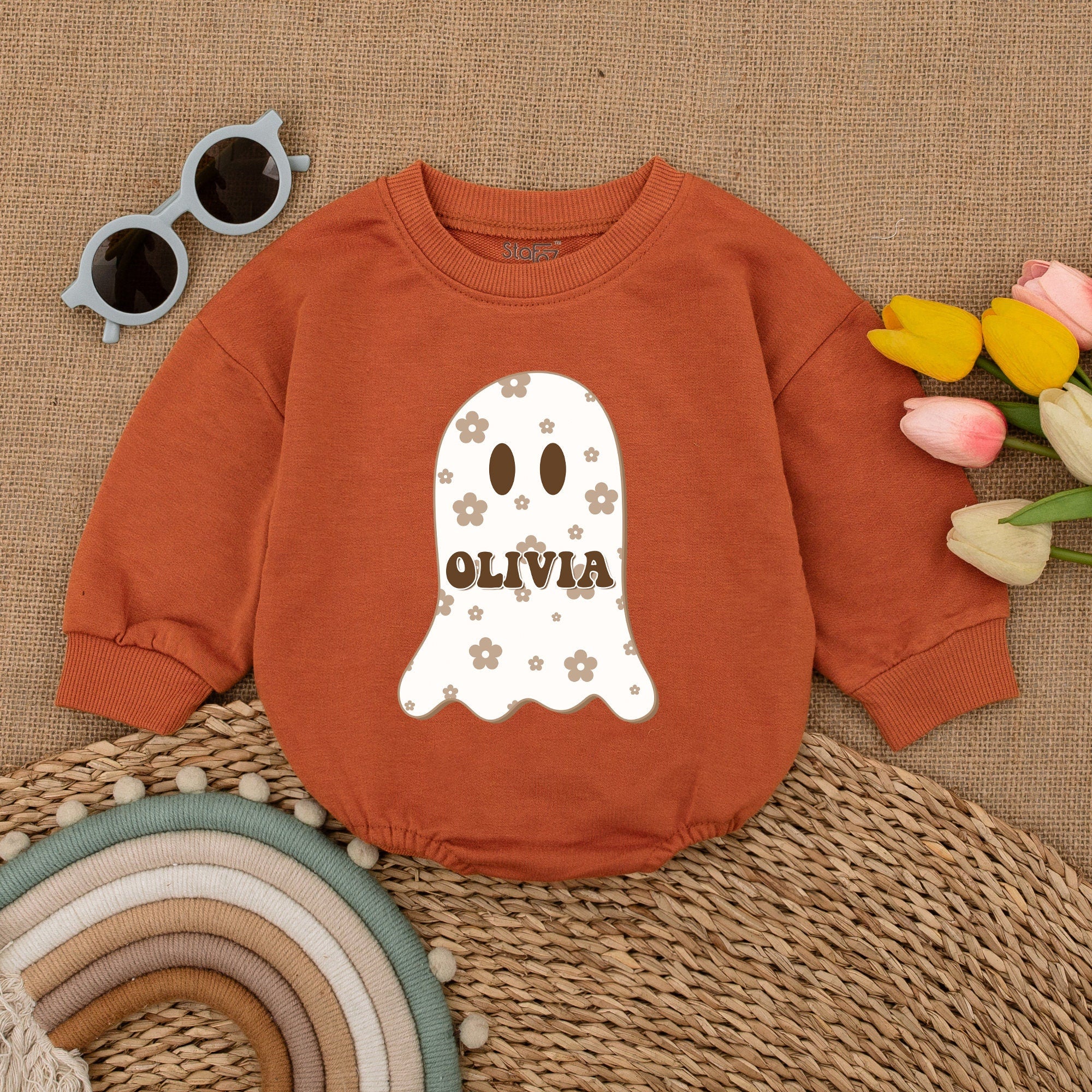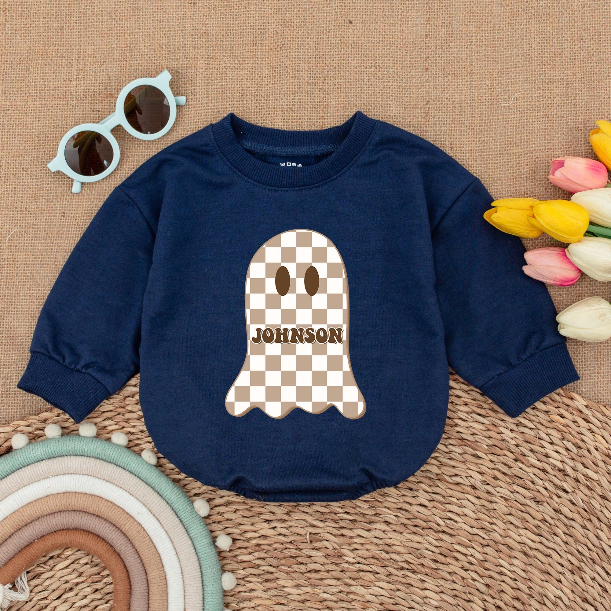 Custom Name Halloween Ghost Baby Romper with Flowers or Checkered Design Soft Cotton Outfit for Birthday Fall Infant or Toddler Gift
