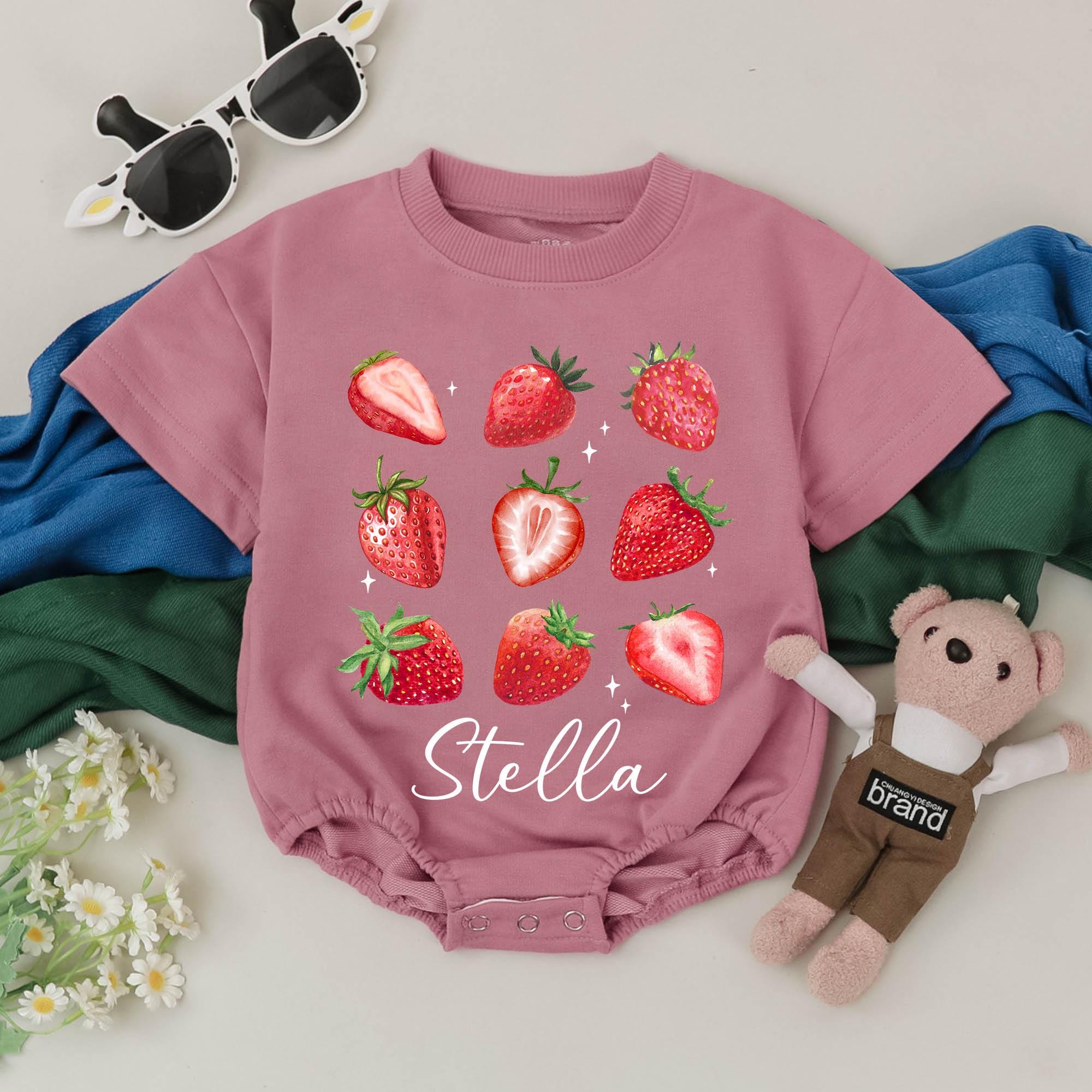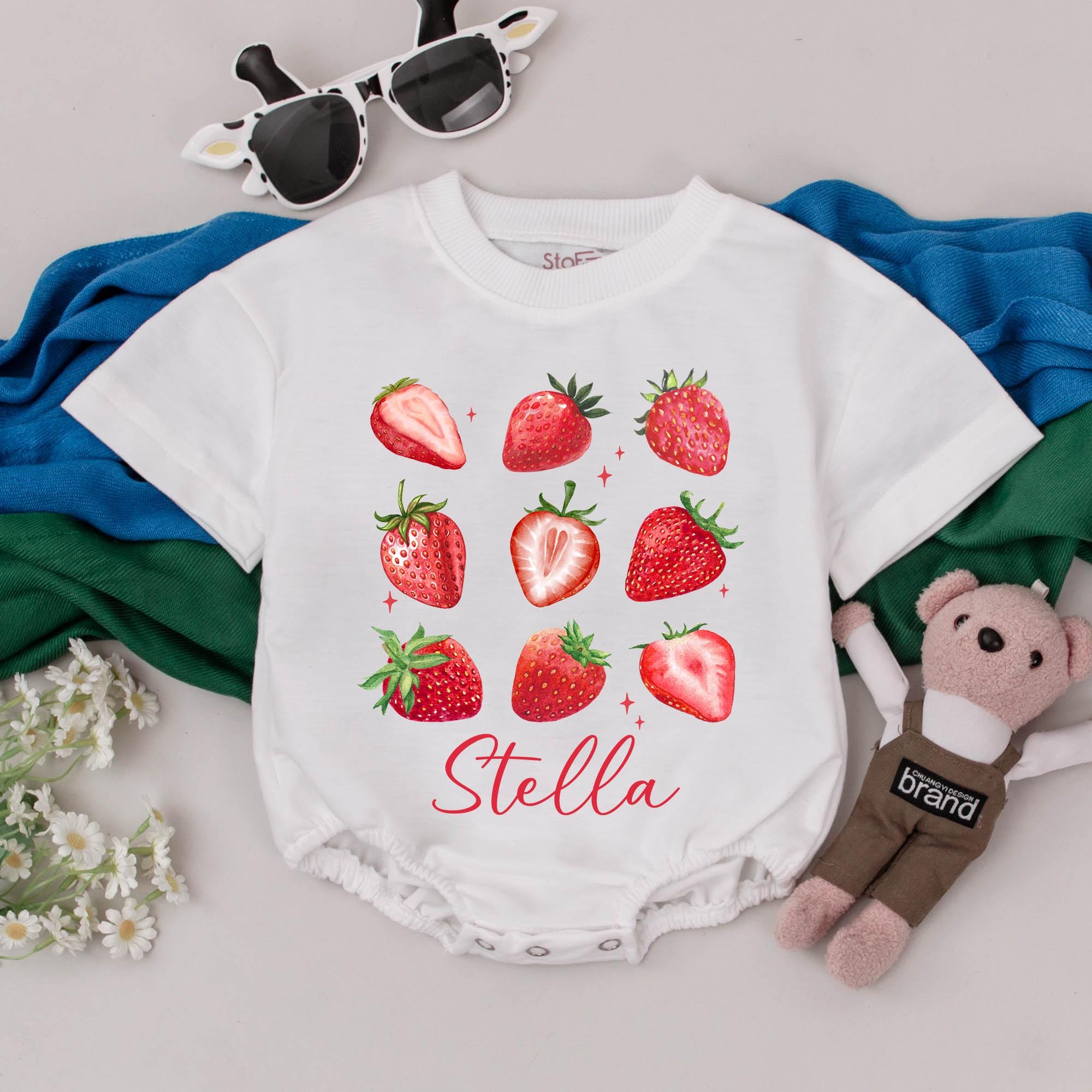 Imagine your little one giggling with delight, wrapped in the whimsical charm of this strawberry-themed romper. Each vibrant strawberry pops off the fabric with lifelike detail, while twinkling star accents add a sprinkle of magic to the design. Perfect for a sunny day at the park or a cozy family gathering, this romper invites joy and playful moments. The bold, cursive 'Stella' adds a personal touch, making it a cherished keepsake. Whether celebrating a first birthday or simply savoring the everyday, this outfit turns ordinary moments into treasured memories. Customize it with your child's name for a truly unique gift that will be adored for years to come.