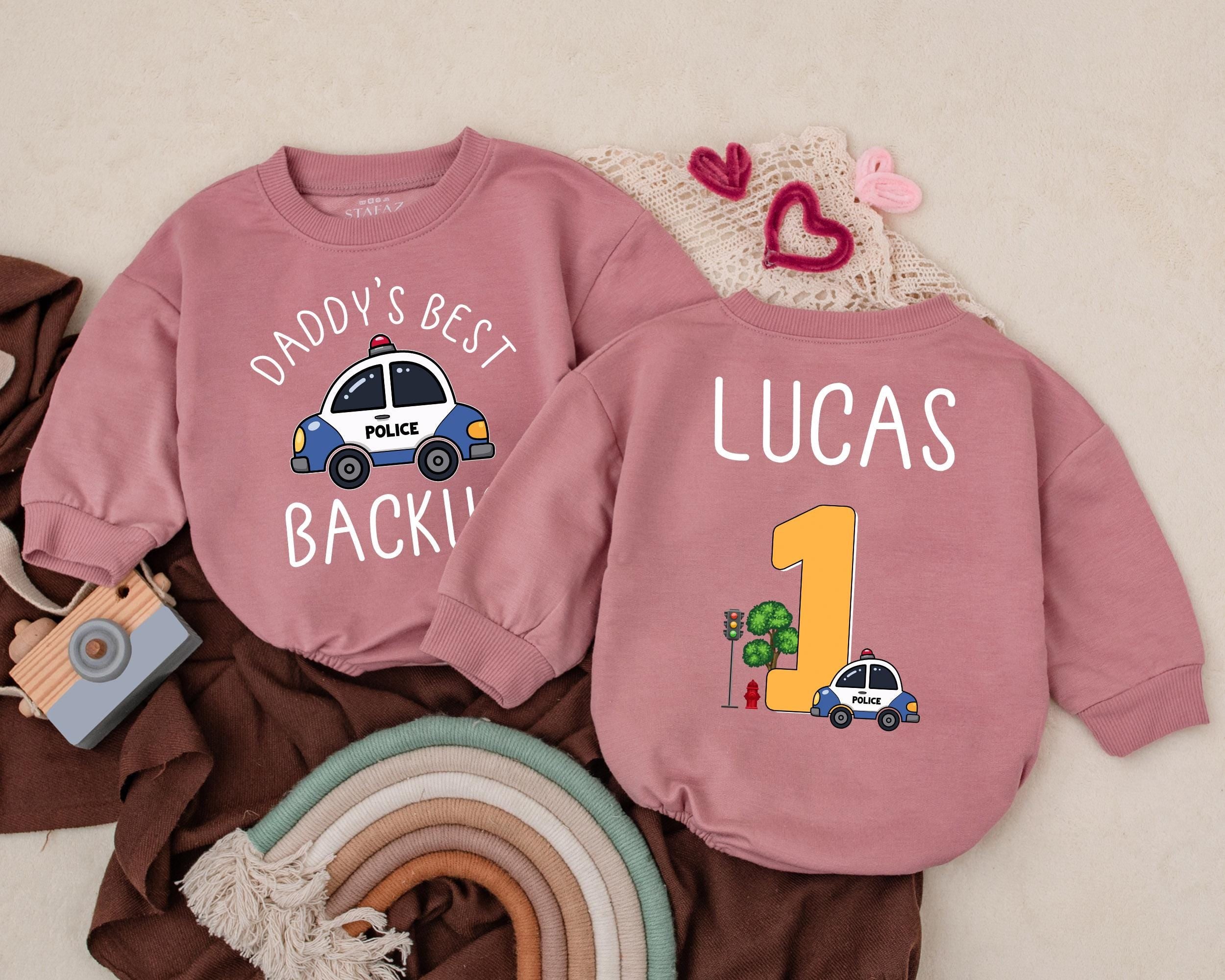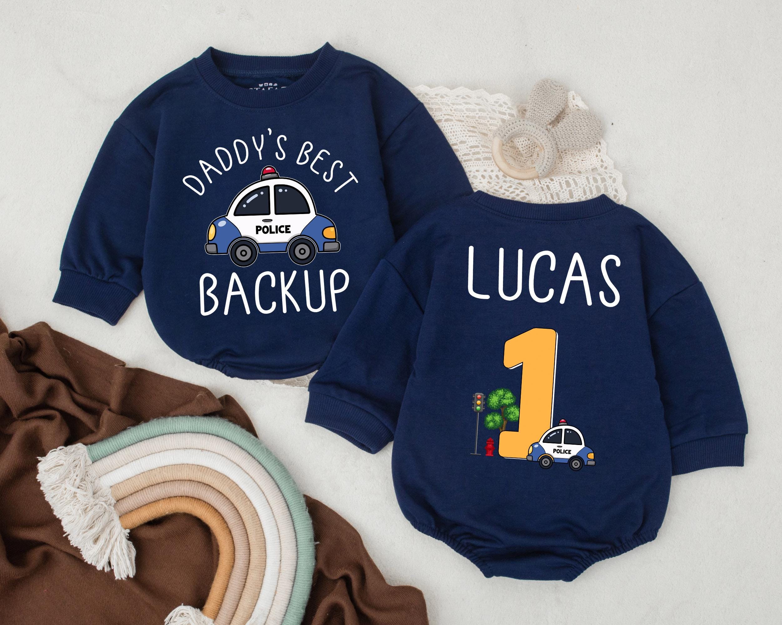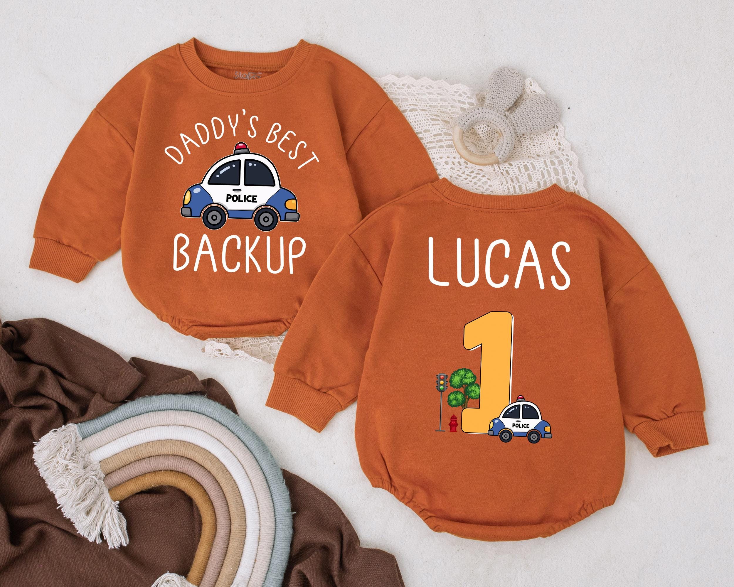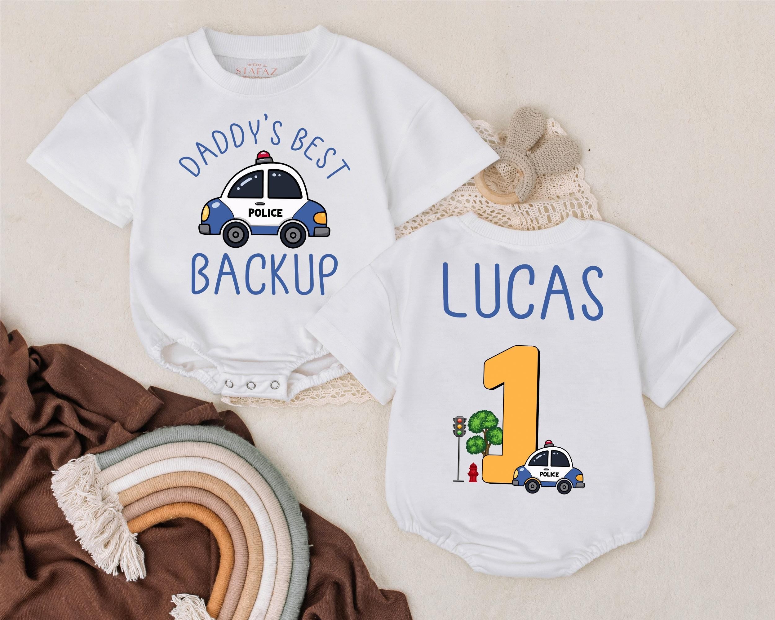 Custom Police Baby Romper Daddy's Best Backup First Birthday Outfit with Cartoon Police Car and Personalized Name Soft Cotton Design