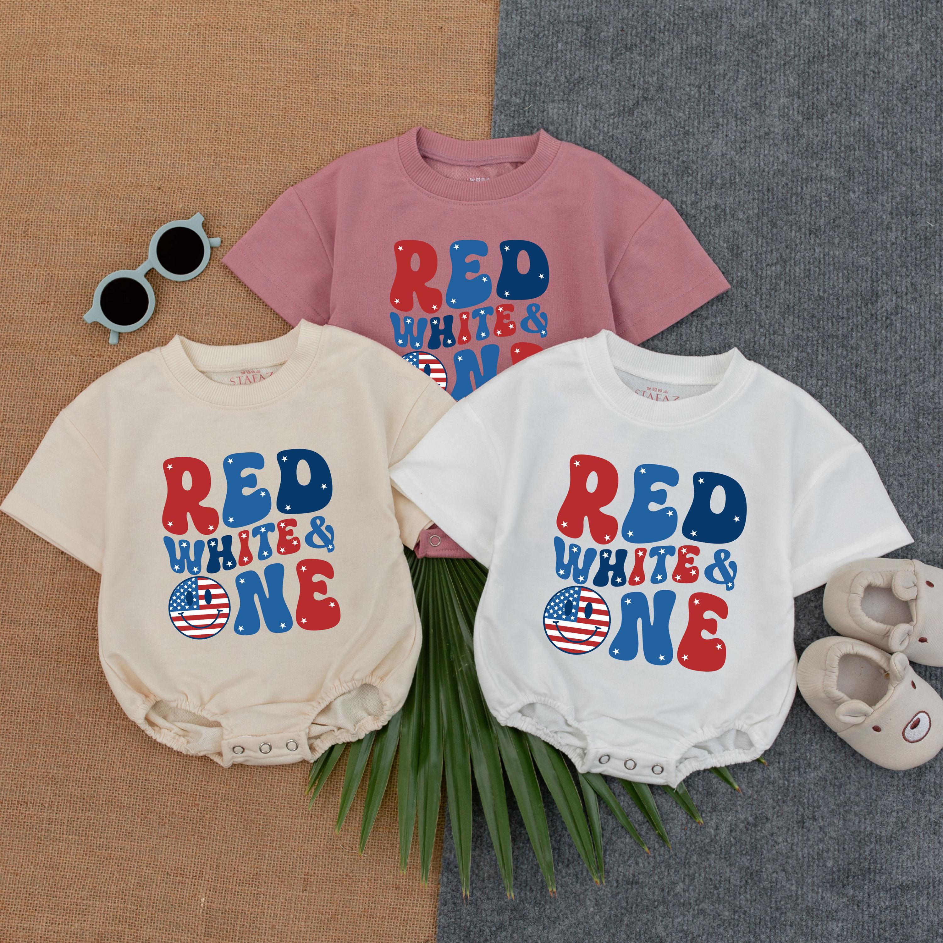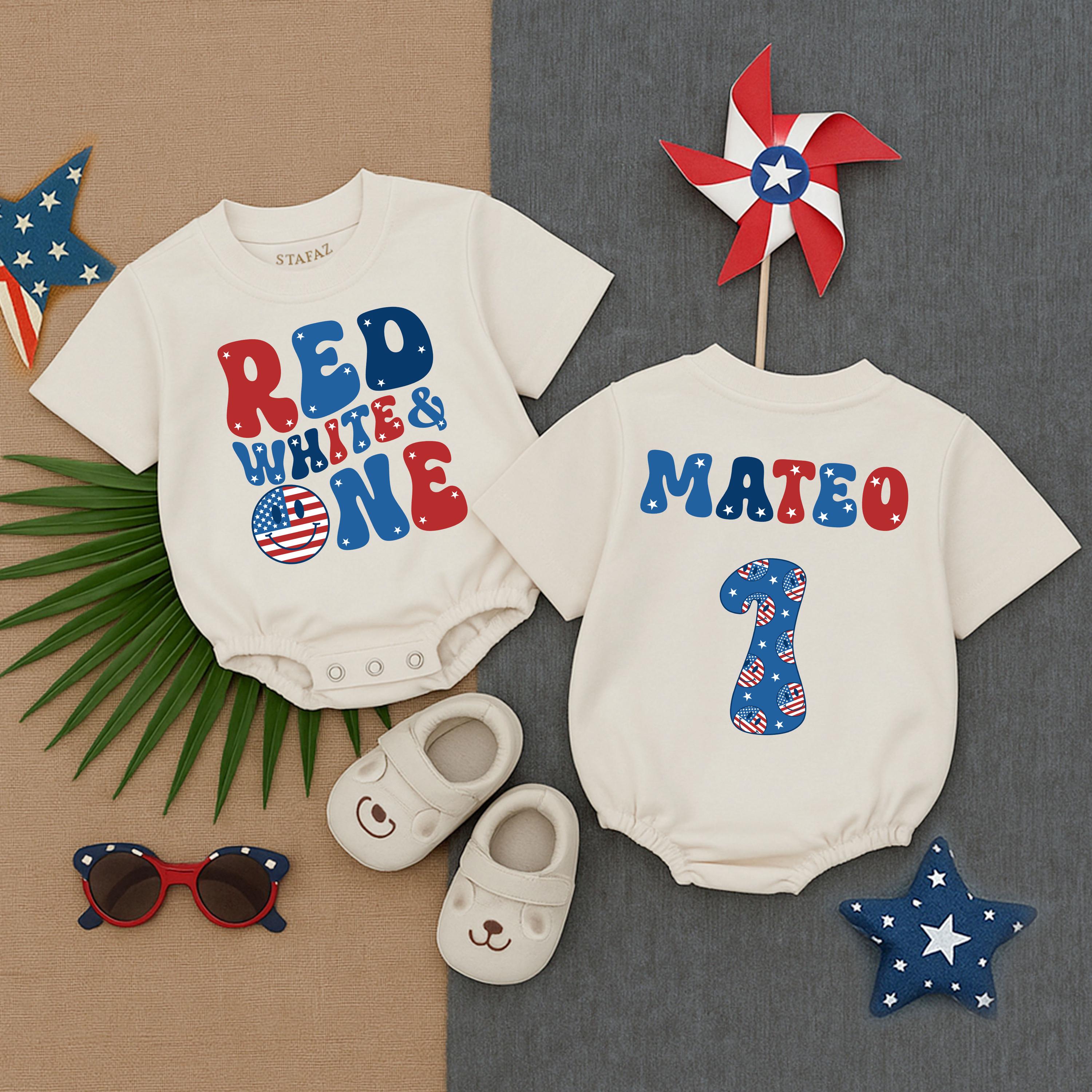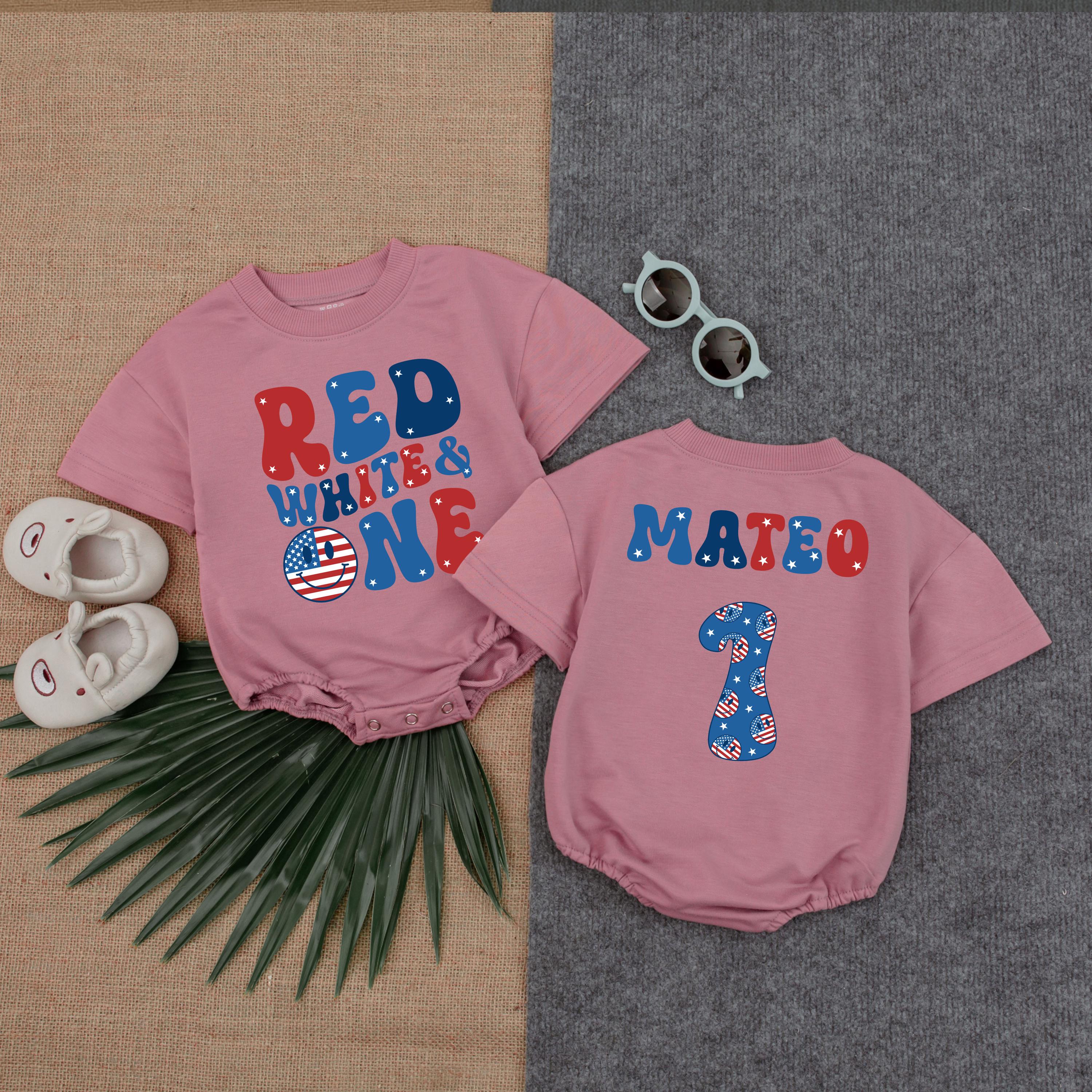 Imagine your little one celebrating Independence Day in style, bringing a smile to everyone’s face with this joyful romper. The front bursts with the words 'RED WHITE & ONE' in bold red and blue, while the 'O' cleverly sports an American flag pattern, adding a patriotic flair. On the back, 'MATEO' is playfully printed in alternating colors above a large flag-patterned number '1', making it a standout piece for any 4th of July gathering. As your child plays, laughs, and enjoys the holiday festivities, this romper will be a cherished part of those precious memories. Personalizing it with a name transforms it into a keepsake that captures this special moment in time. Perfect for gifting or creating memorable family photos, let this delightful outfit be part of your Independence Day celebration.