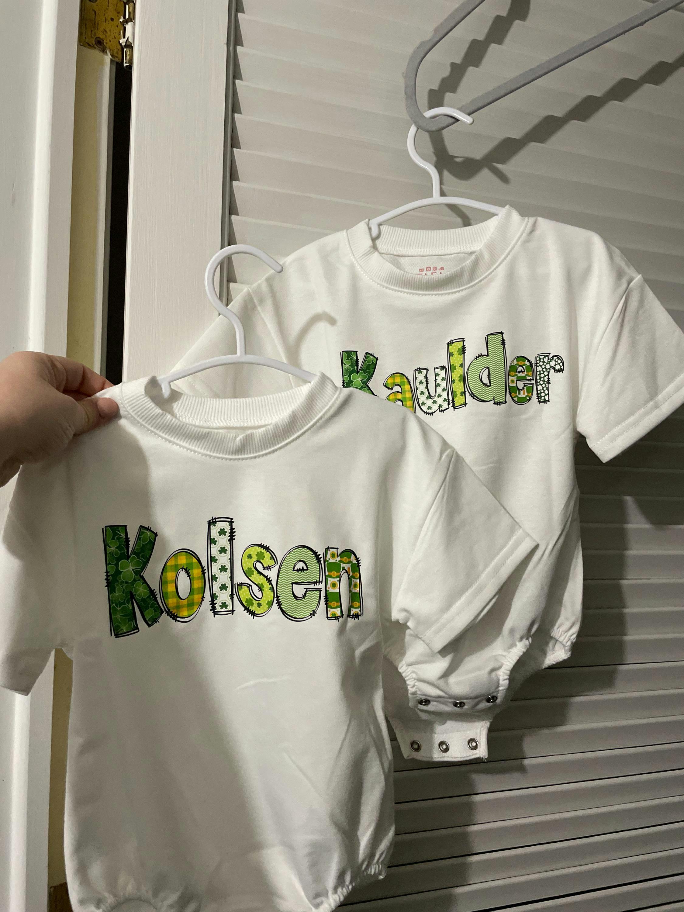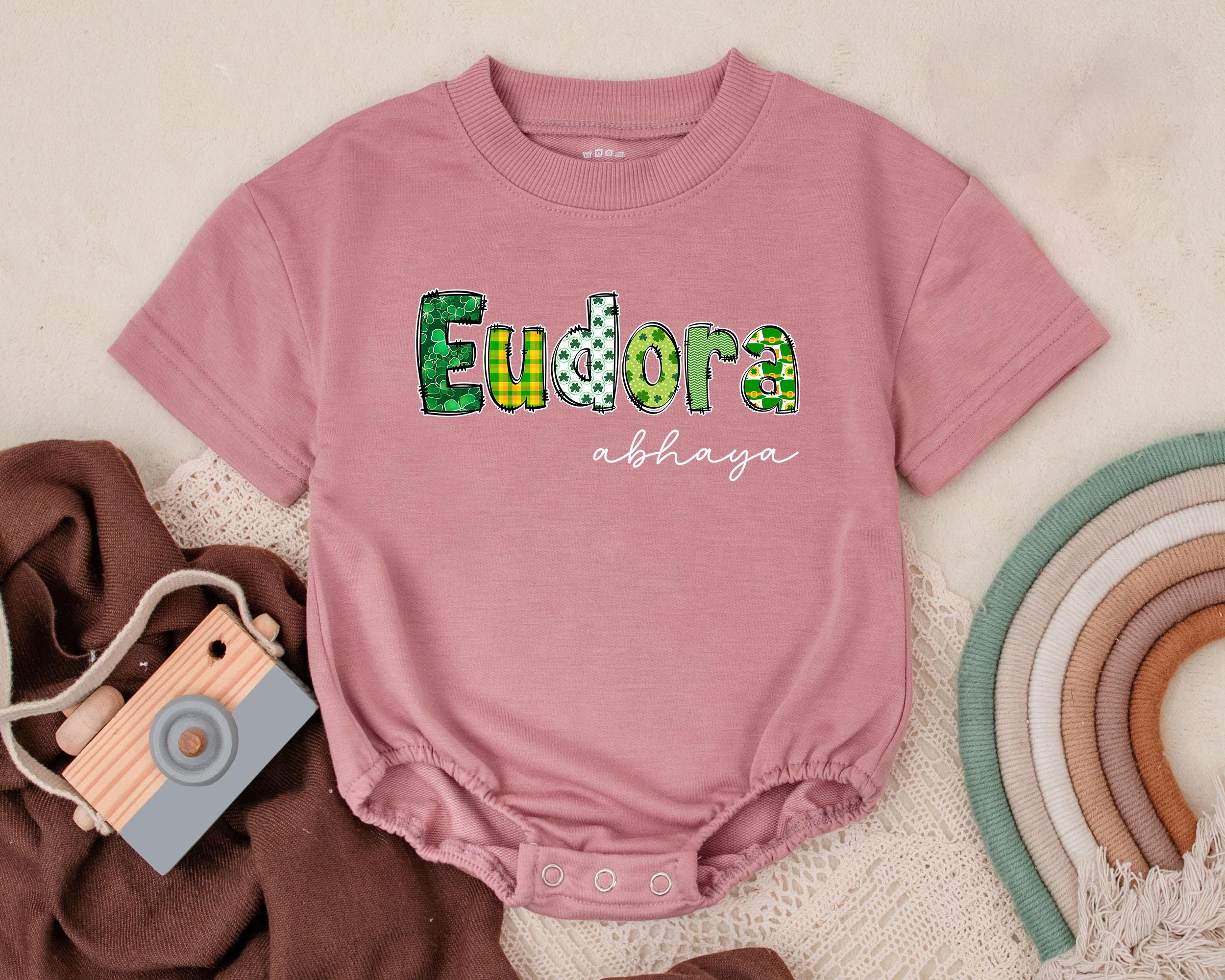 Imagine the joy of celebrating your little one's first St. Patrick's Day with a romper as lively and cheerful as the occasion itself. The name 'Eudora' playfully dances across the fabric in bold letters filled with shamrocks and polka dots, creating a festive, whimsical vibe. Below it, 'abhaya' in elegant black cursive adds a touch of sophistication. This delightful design, with its vibrant green hues and contrasting black, is perfect for holiday gatherings or cozy family moments. Personalize it with your baby's name to make it a treasured keepsake. Whether it's a baby shower gift or a lucky charm for your infant, this romper is a heartfelt way to capture and celebrate precious memories.