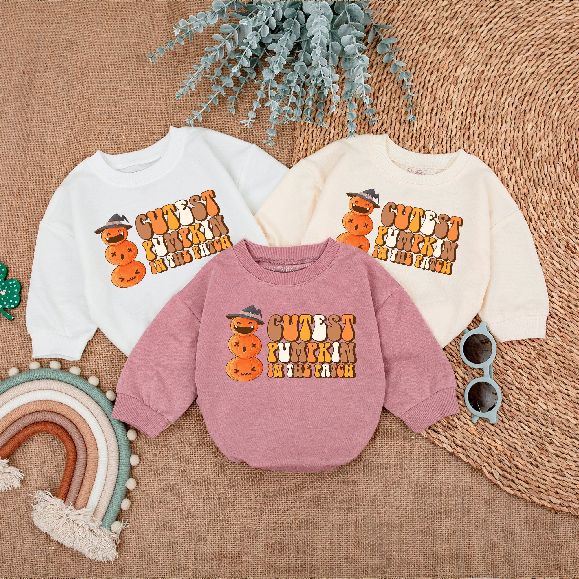 Picture your little one lighting up the room with their giggles, wrapped in the charm of their first Halloween. This darling romper features a trio of smiling pumpkins, each beam with joy, topped with a whimsical witch hat, capturing the essence of a fun-filled Halloween night. Crafted from soft, comfortable cotton, it's perfect for cozy autumn days, from family gatherings to playful afternoons in the pumpkin patch. The vibrant orange and cheerful characters bring a festive spirit to any occasion, making it an ideal choice for adorable photos and cherished memories. The bold 'CUTEST PUMPKIN IN THE PATCH' text adds a touch of playful pride, celebrating your baby's delightful presence. Embrace the warmth of the season and create lasting memories with this enchanting outfit, perfect for your baby's first Halloween adventure.