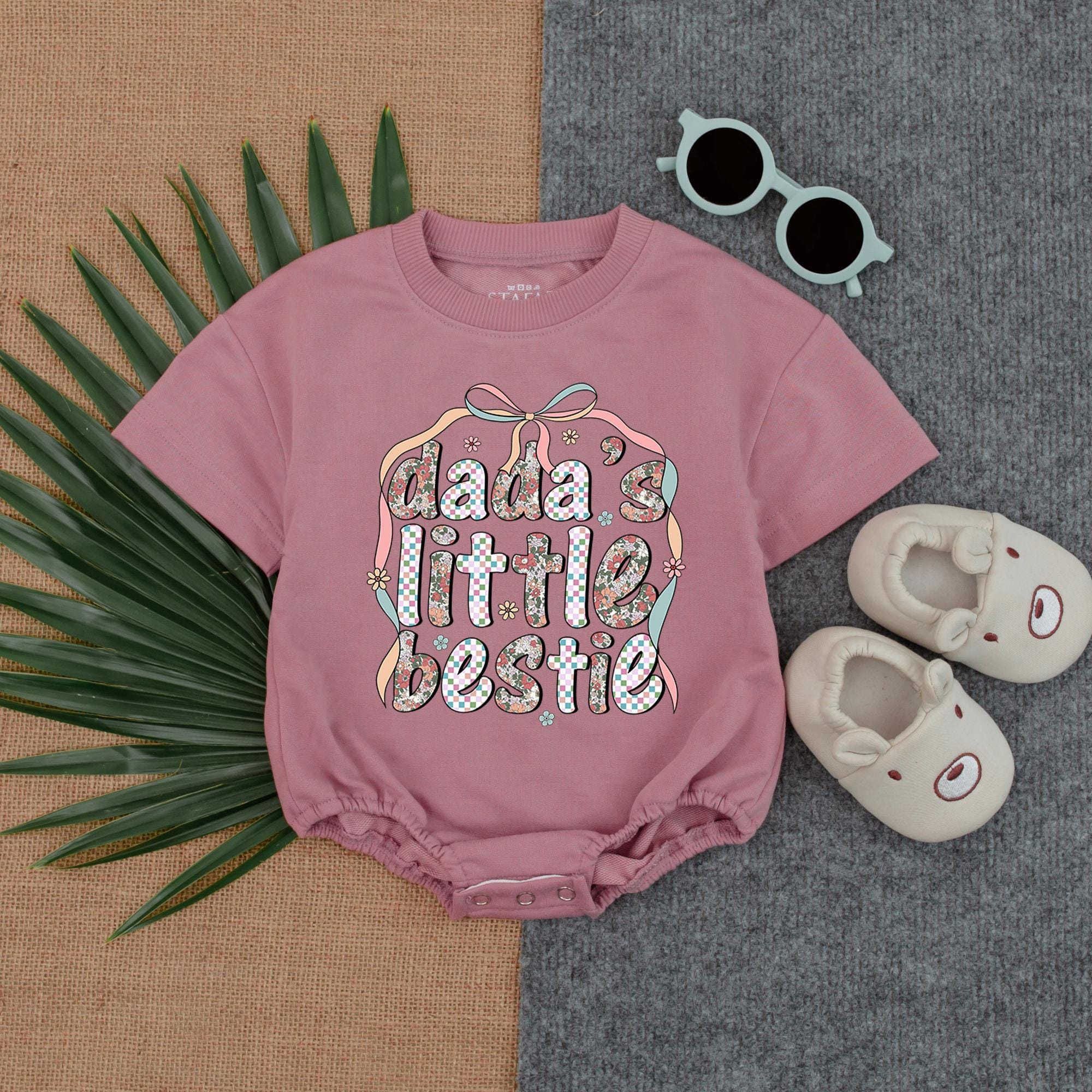 Imagine your little one snuggling up to dad, both sharing a moment of pure joy. This delightful romper, adorned with the whimsical text 'dada's little bestie,' brings that sentiment to life. The vibrant pastel hues of pink, blue, and green dance playfully across the fabric, with charming stars and hearts adding a touch of magic. Perfect for a sunny afternoon or a joyful Father's Day celebration, this romper is crafted from soft cotton, ensuring your baby stays comfortable while looking adorable. Whether you're attending a family picnic or capturing precious memories in a photo session, this outfit promises smiles and cuddles. It's the ideal gift for new parents, inviting them to cherish every giggle and embrace. Don't miss the chance to make everyday moments special with this heartfelt piece.