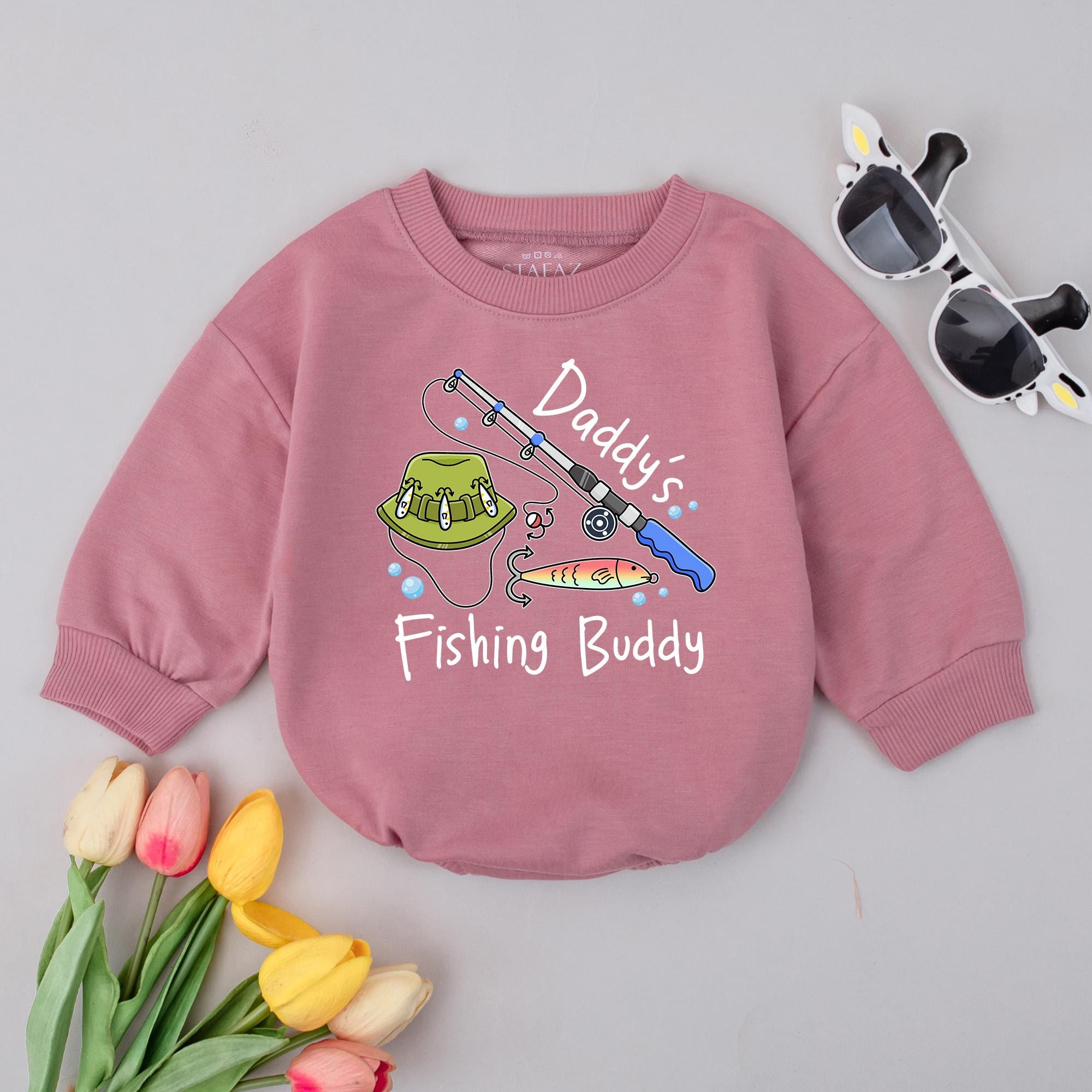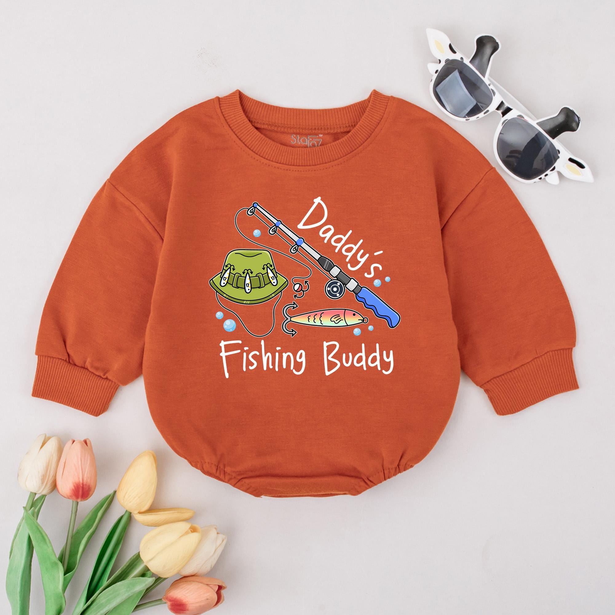 Imagine the joy of a sunny afternoon by the lake, with your little one as 'Daddy's Fishing Buddy.' This delightful romper captures that essence with its playful fishing-themed artwork. A charming fishing rod with a blue handle, a green bucket hat, and a colorful lure dance across the fabric, creating a scene of cheerful fun. The whimsical font of 'Daddy's Fishing Buddy' adds a touch of whimsy and joy, perfect for celebrating a first Father's Day. Crafted from soft, breathable cotton, it's ideal for cozy mornings and memorable family outings. This romper isn't just clothing; it's a keepsake of precious moments and shared adventures. Gift this to the new dad in your life and watch their heart swell with pride.
