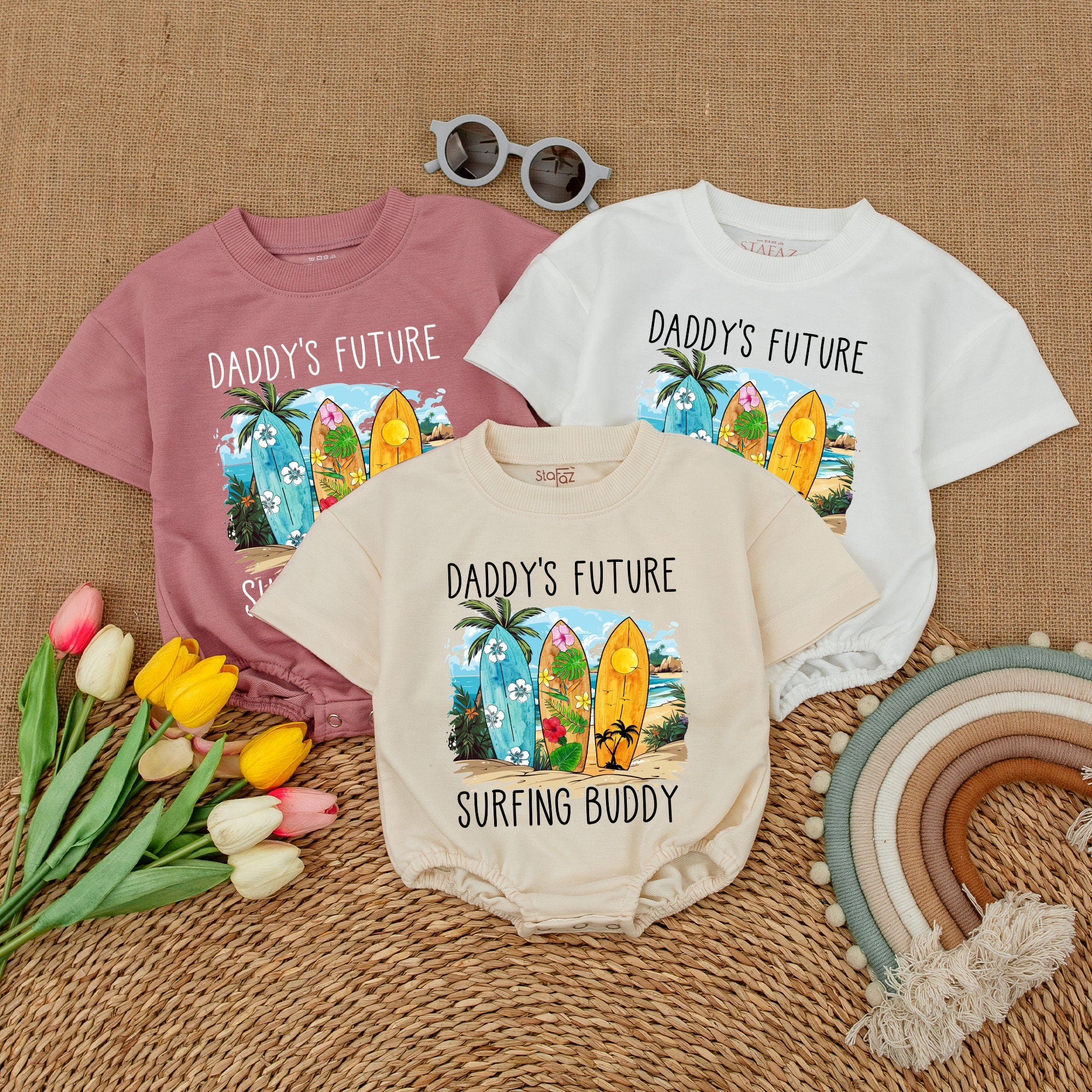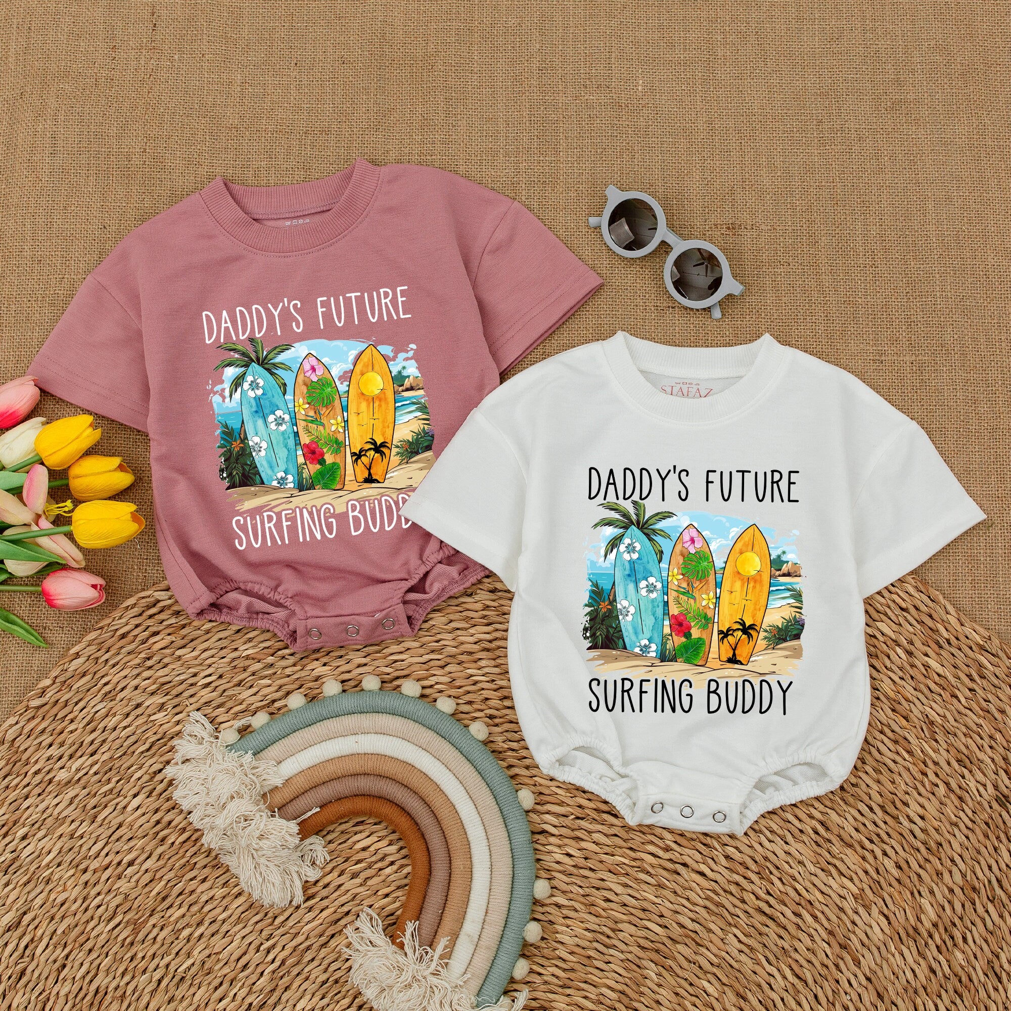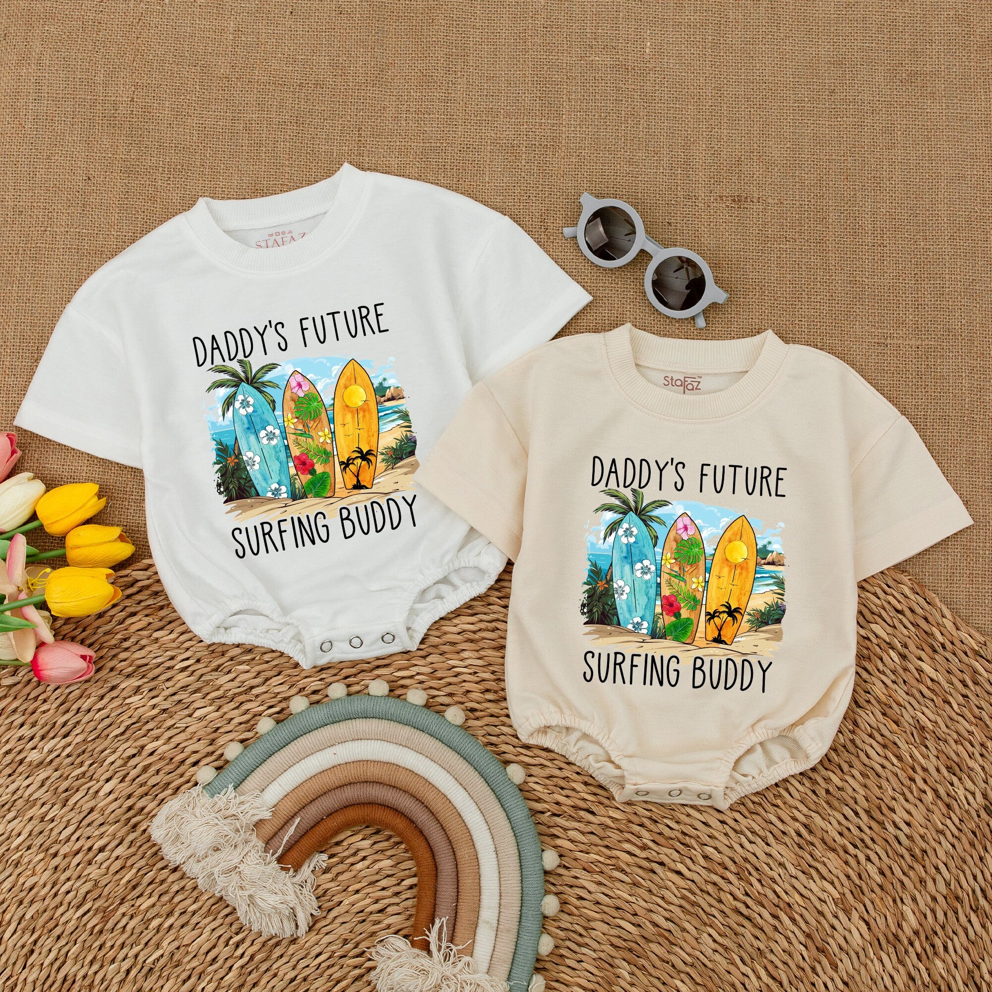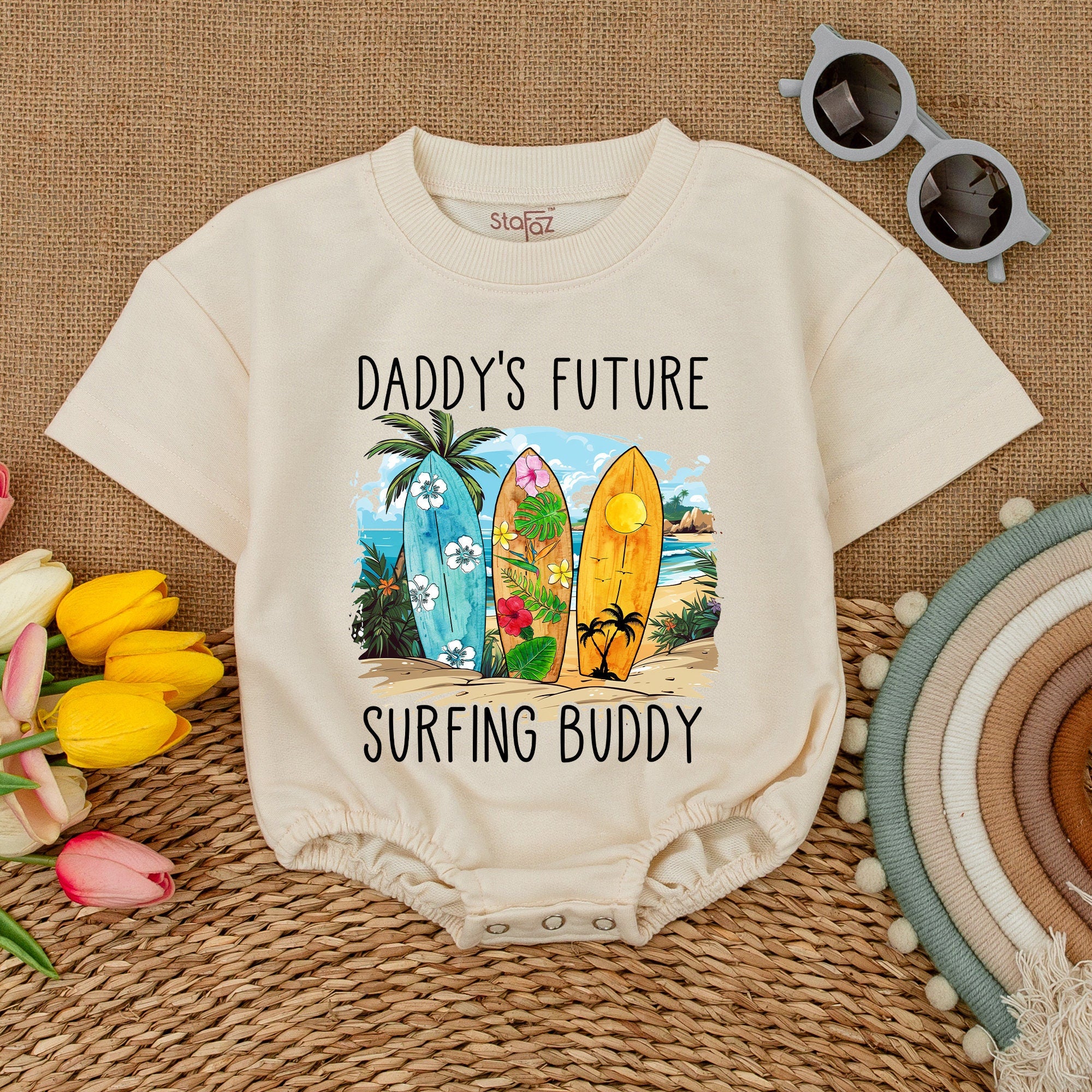 Daddy's Future Surfing Buddy Baby Romper with Beach Scene Surfboards Summer Outfit Newborn Infant Gift Cotton Comfortable Beachwear