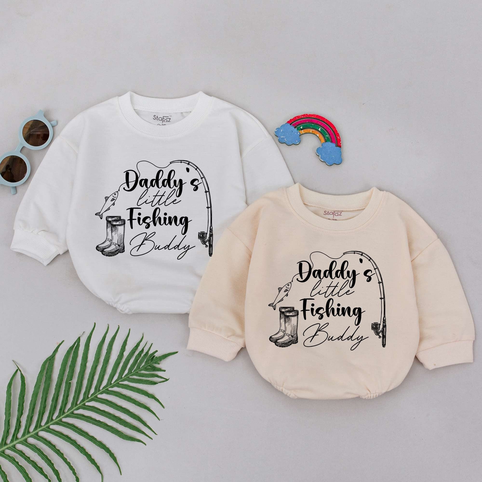 Imagine a sunny afternoon by the lake, where your little one is bundled in this 'Daddy's Little Fishing Buddy' romper, ready for a day of bonding and adventure. The playful, cursive font spells out a sweet message that complements the charming graphic of a fishing rod, fish, and boots, all in bold black against the light fabric. This adorable romper captures the joy of spending quality time outdoors, making it perfect for family gatherings or a cozy day at home. Crafted from soft cotton, it's not only comfortable for your baby but also a cherished gift for Father's Day or baby showers. Each time your little one wears it, you'll be reminded of those precious moments and memories formed. Choose this romper to celebrate the love and adventures shared between father and child.