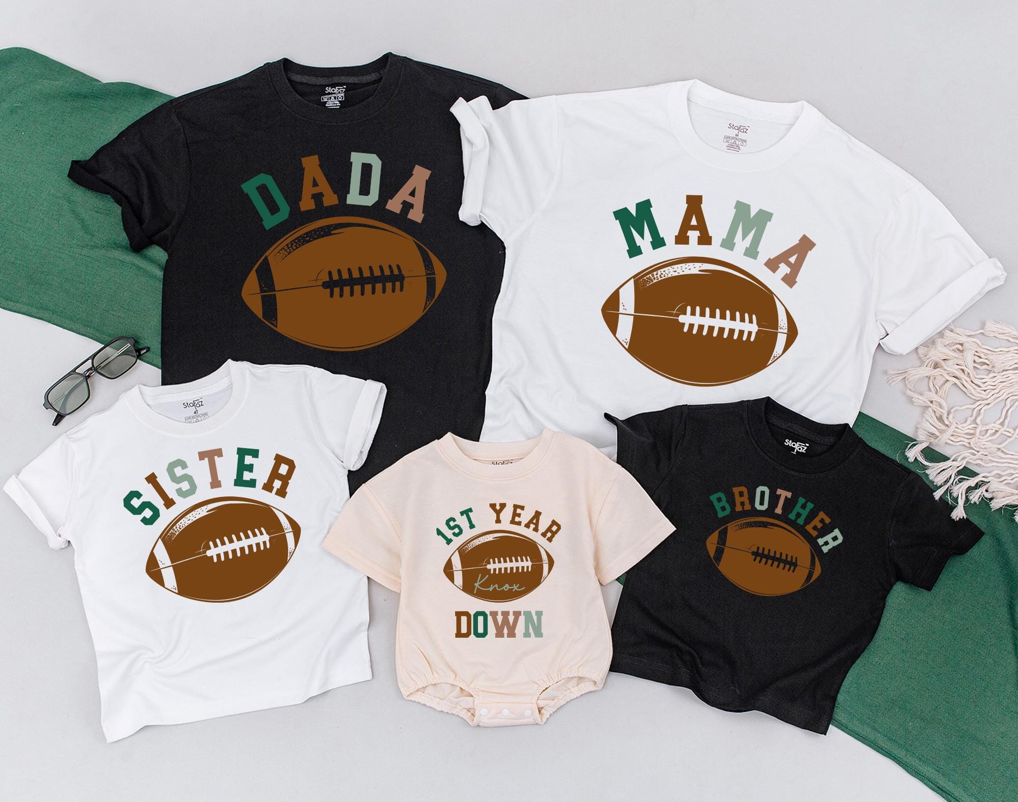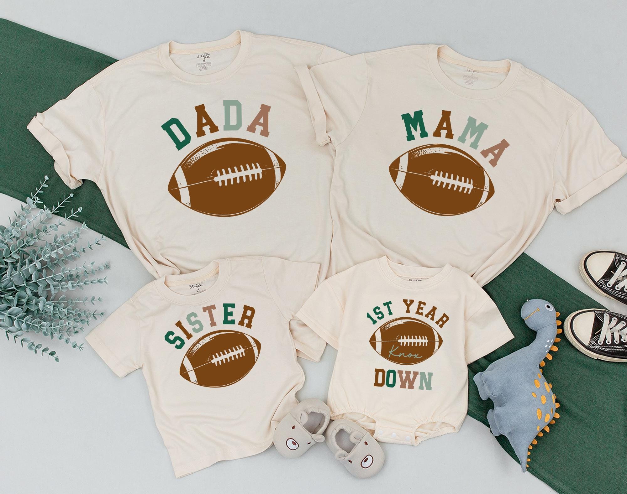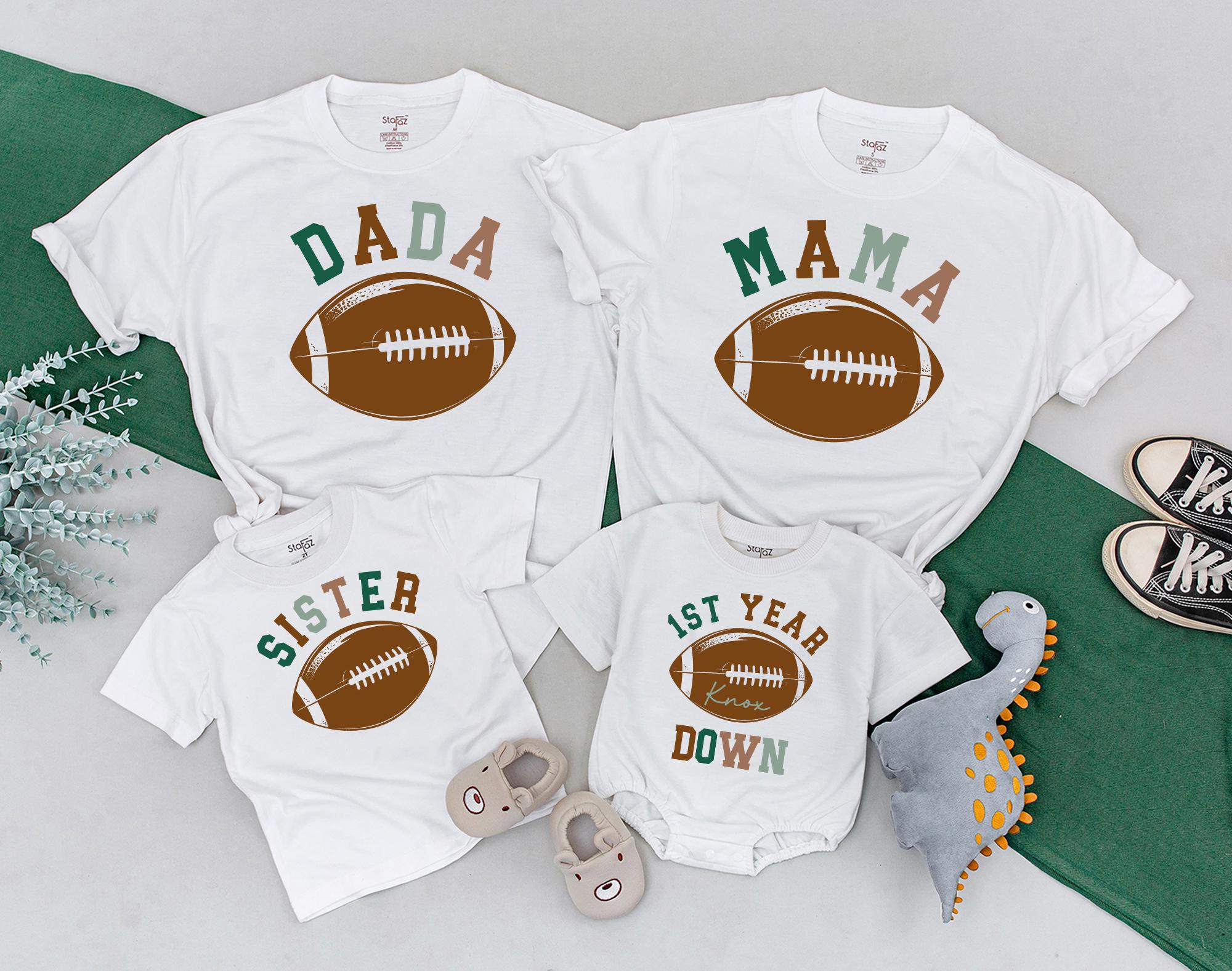 Celebrate your little one's first birthday with a touch of sporty fun and family unity. These matching football-themed shirts feature a playful central graphic of a brown football with bold, block letters highlighting roles like 'DADA,' 'MAMA,' 'SISTER,' and '1ST YEAR DOWN' in vibrant green, brown, and orange. Imagine the joy of a family photoshoot, capturing these precious moments at a birthday party or a casual weekend get-together. The soft, comfortable cotton fabric ensures everyone stays cozy while making memories. Personalize the shirt with a name or date to create a keepsake that will be treasured for years. Invite family and friends to join in the celebration and share in the smiles, all while sporting coordinated looks that highlight the bond you share.