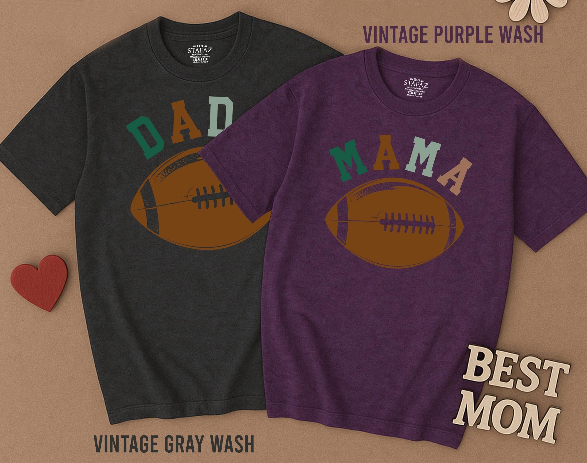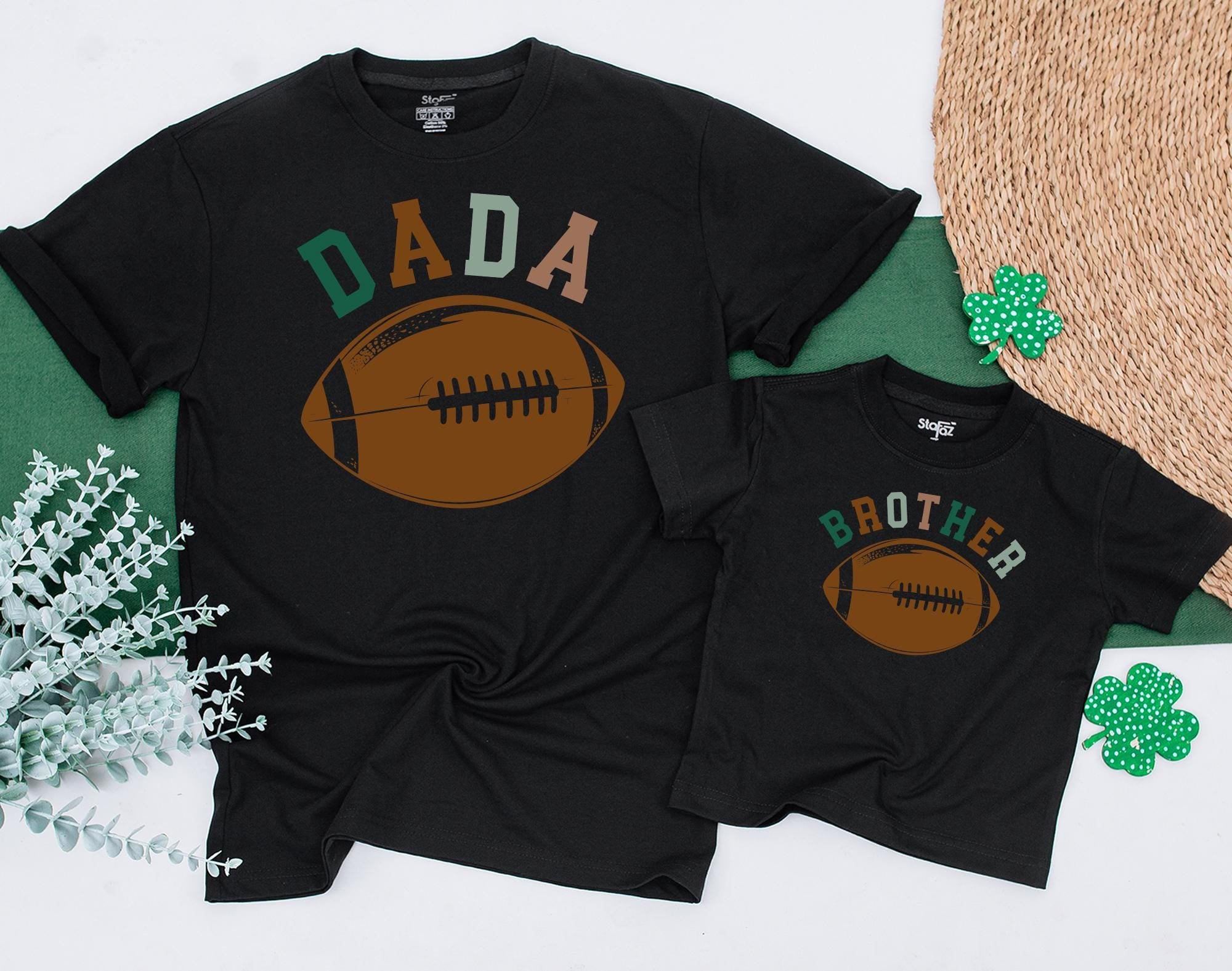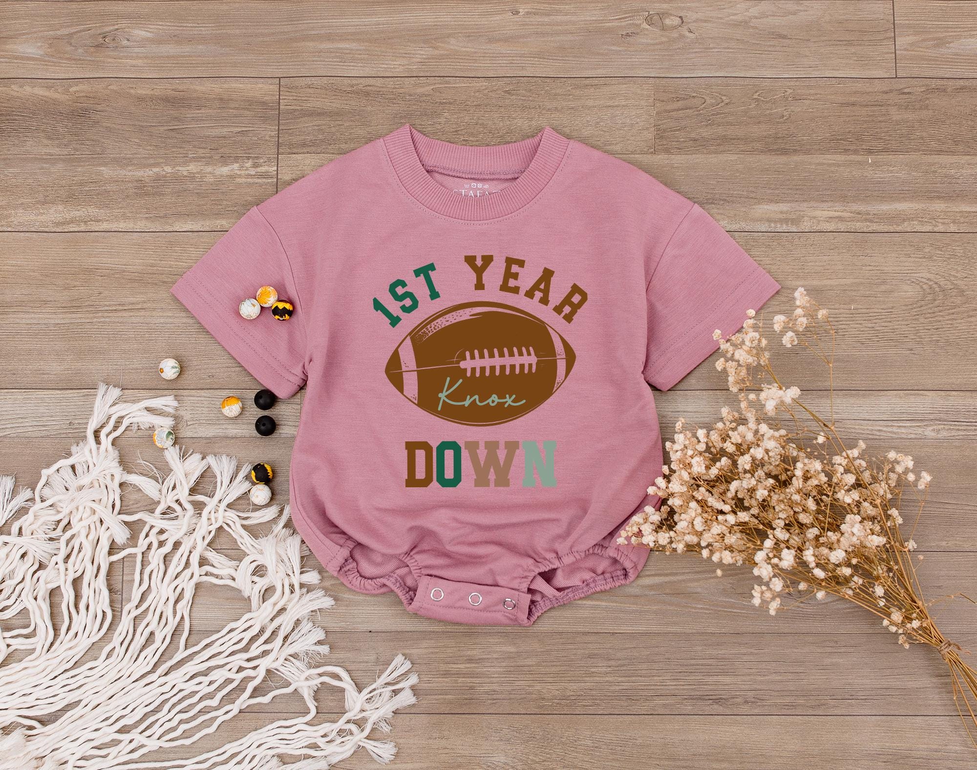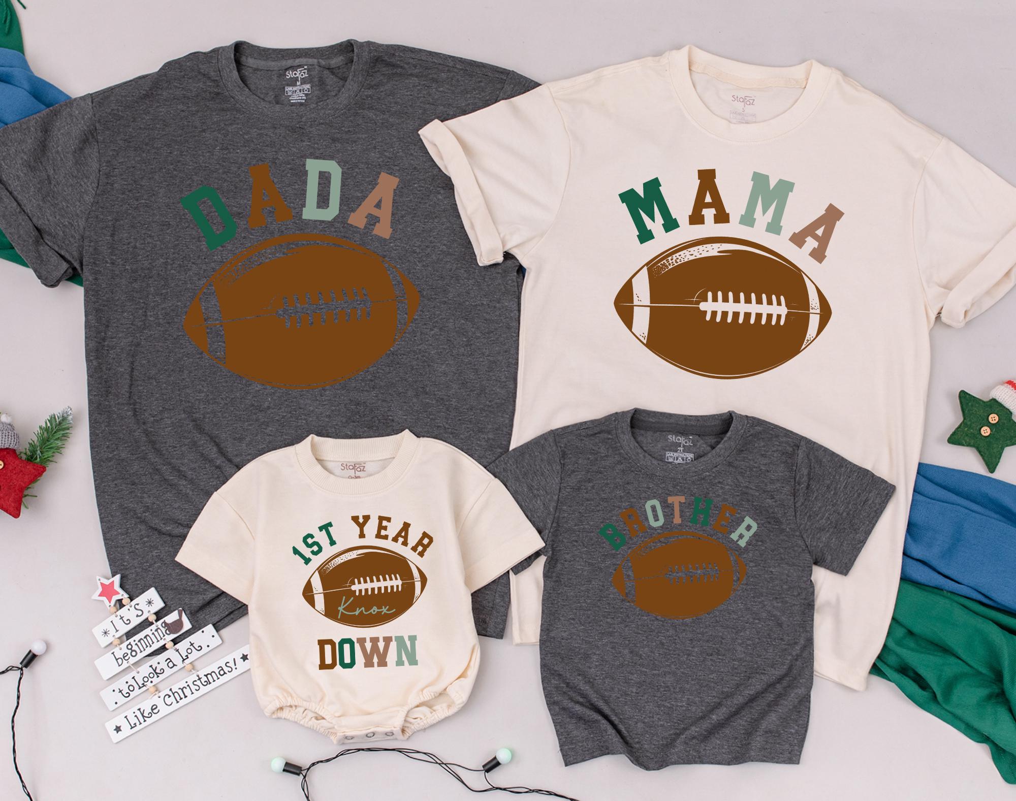 Celebrate your little one's first birthday with a touch of sporty fun and family unity. These matching football-themed shirts feature a playful central graphic of a brown football with bold, block letters highlighting roles like 'DADA,' 'MAMA,' 'SISTER,' and '1ST YEAR DOWN' in vibrant green, brown, and orange. Imagine the joy of a family photoshoot, capturing these precious moments at a birthday party or a casual weekend get-together. The soft, comfortable cotton fabric ensures everyone stays cozy while making memories. Personalize the shirt with a name or date to create a keepsake that will be treasured for years. Invite family and friends to join in the celebration and share in the smiles, all while sporting coordinated looks that highlight the bond you share.
