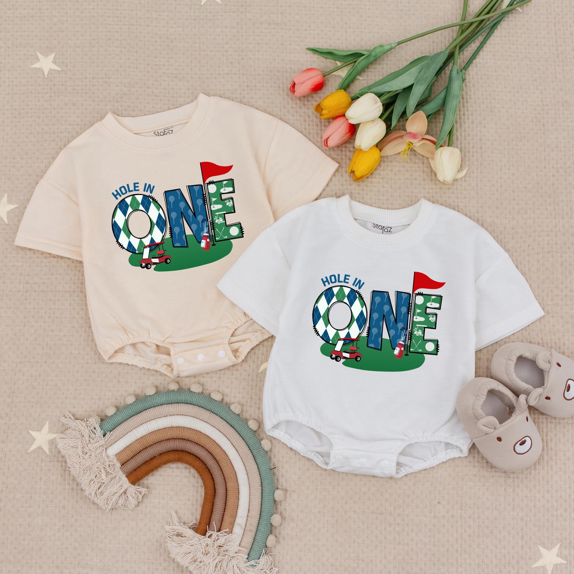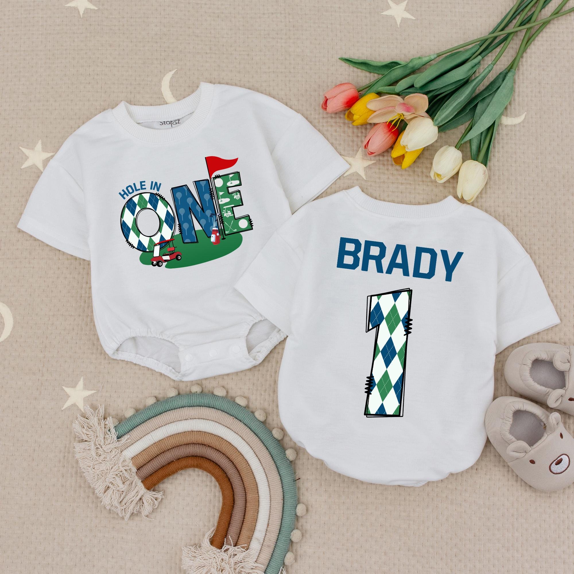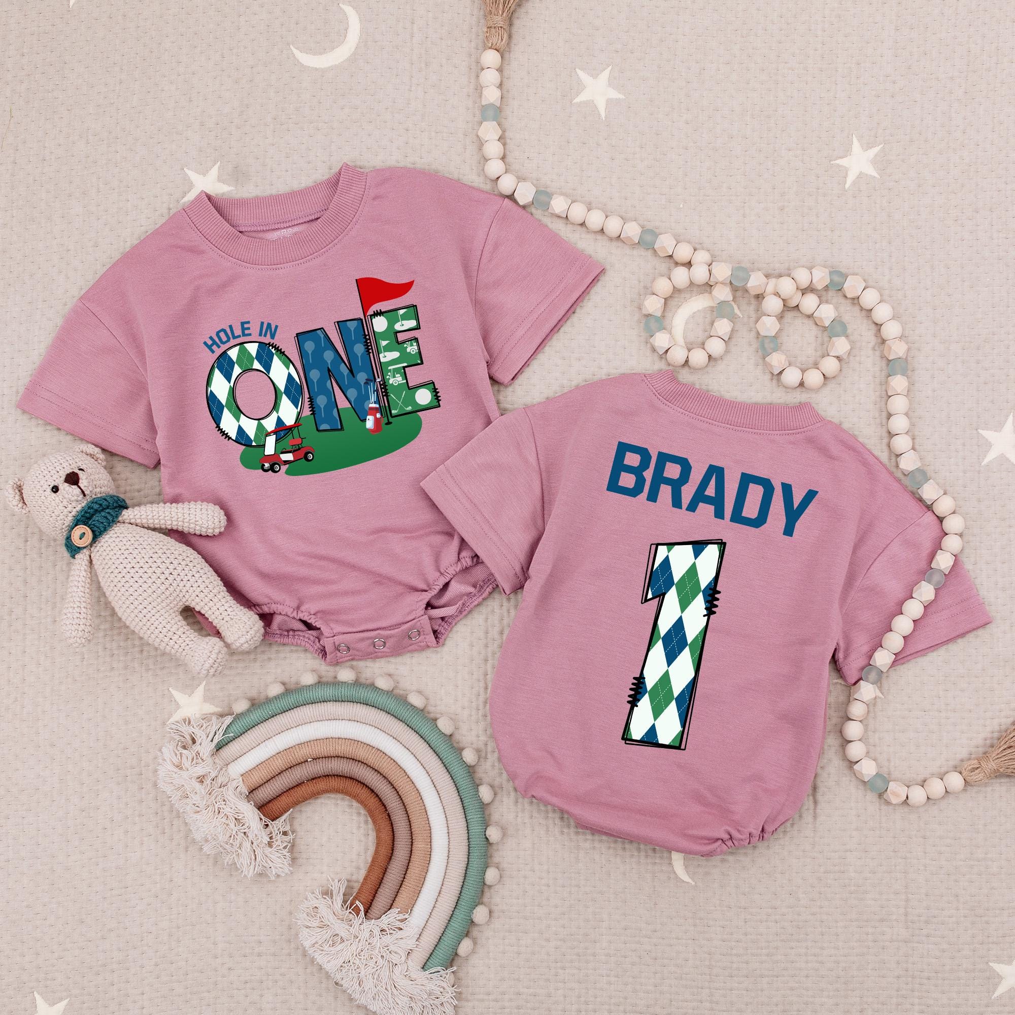 Celebrate your little one's first birthday with this delightful golf-themed romper that captures the spirit of a joyful milestone. The front features the playful phrase 'HOLE IN ONE,' where the 'O' is cleverly designed as a golf ball, set against a vibrant golf course scene complete with a red flagstick. On the back, a bold number '1' in a charming blue and white argyle pattern is topped with the name 'BRADY,' adding a personal touch to your baby's special day. Imagine your baby wearing this cozy, cotton romper at their birthday party, bringing smiles and laughter to family and friends. This romper is not just an outfit; it's a keepsake for those cherished moments and a perfect outfit for a memorable cake smash. Make your child's first birthday unforgettable with this unique, personalized romper.