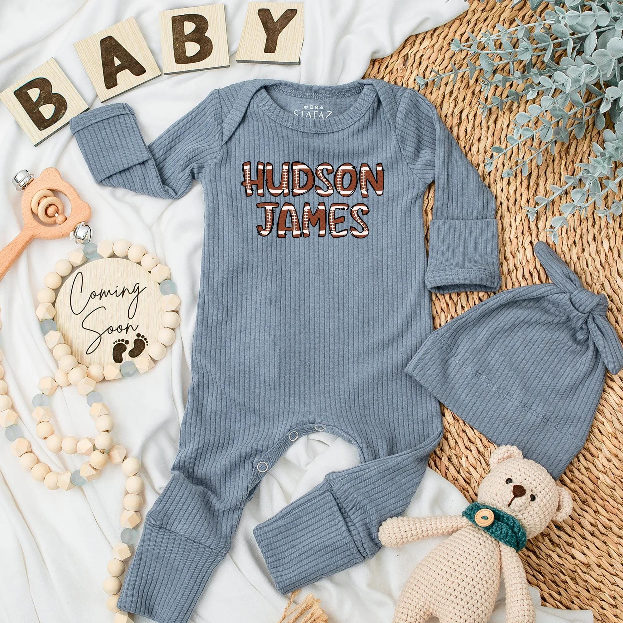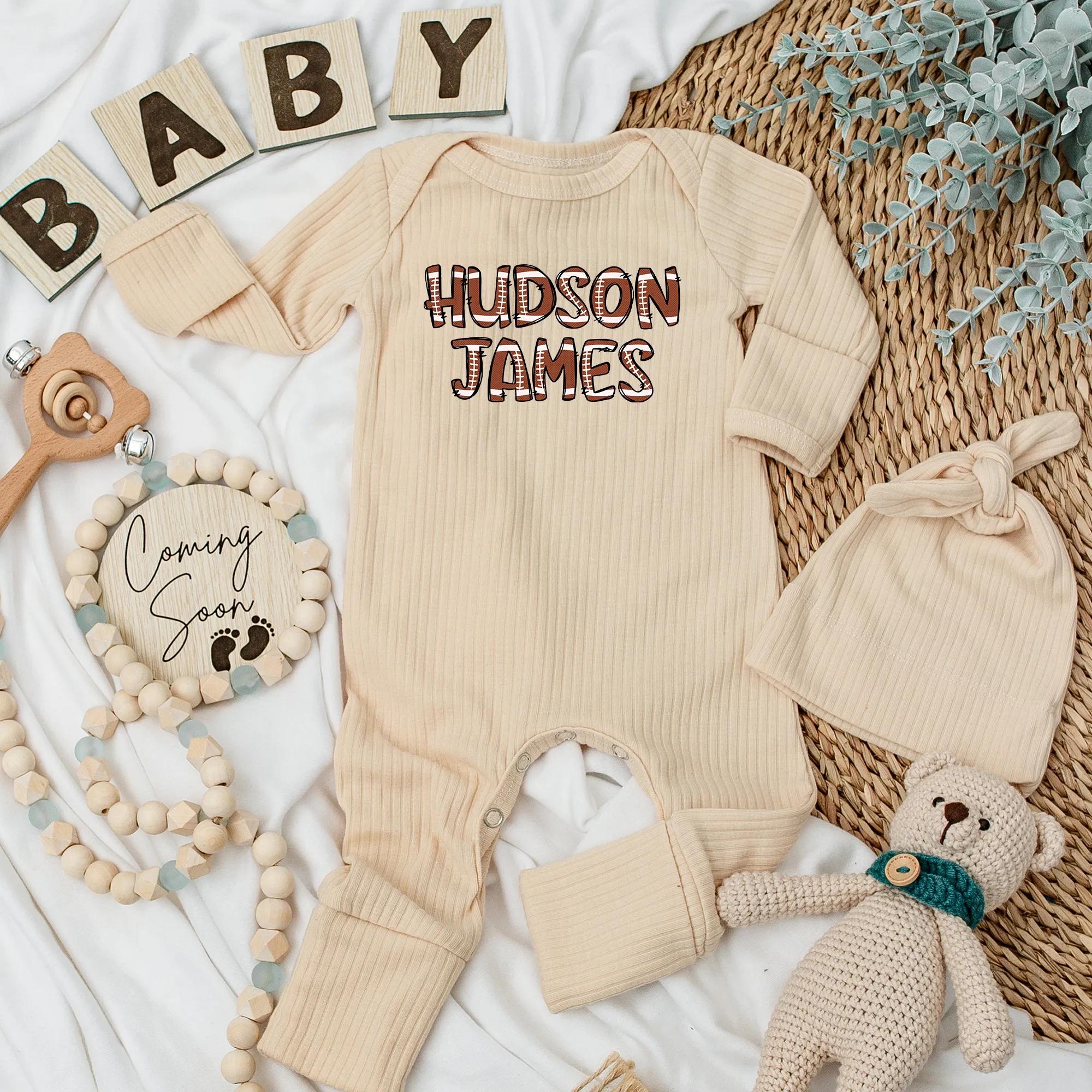 Imagine the thrill of game day excitement captured in a tiny outfit for your little one. This adorable baby bodysuit features 'HUDSON JAMES' in bold, playful lettering with a football texture pattern. The rich shades of brown and white mimic a football's surface, making it a delight for football-loving families. Whether you're enjoying a Sunday game together or celebrating a special milestone, this romper brings a sporty charm to any occasion. Personalize it with your baby's name to create a cherished keepsake that celebrates their first football season. Perfect for gifting at baby showers or as a unique memento for proud parents, this bodysuit is both soft and comfortable for your infant's delicate skin. Capture the spirit of the season and share a memorable moment with your little sports fan.
