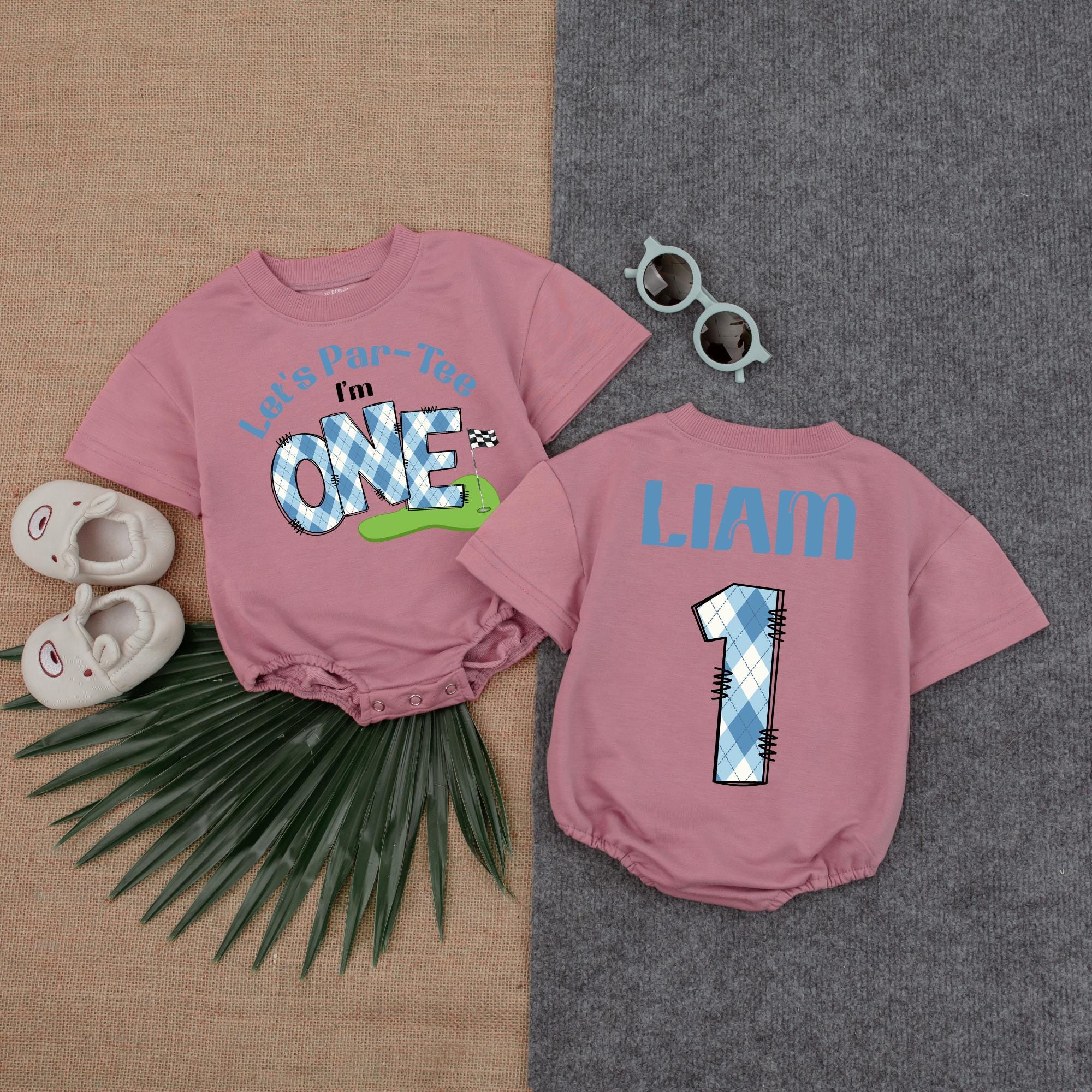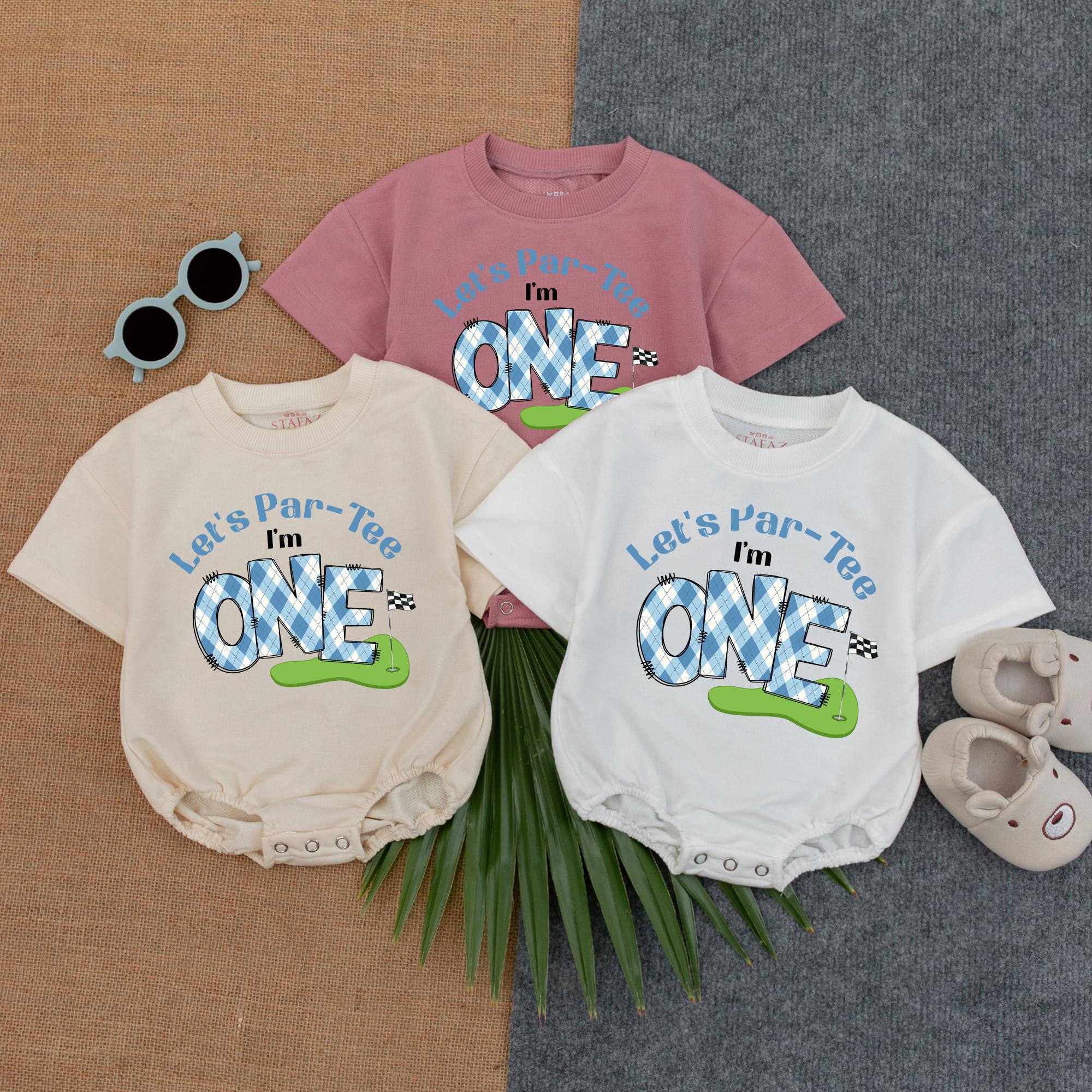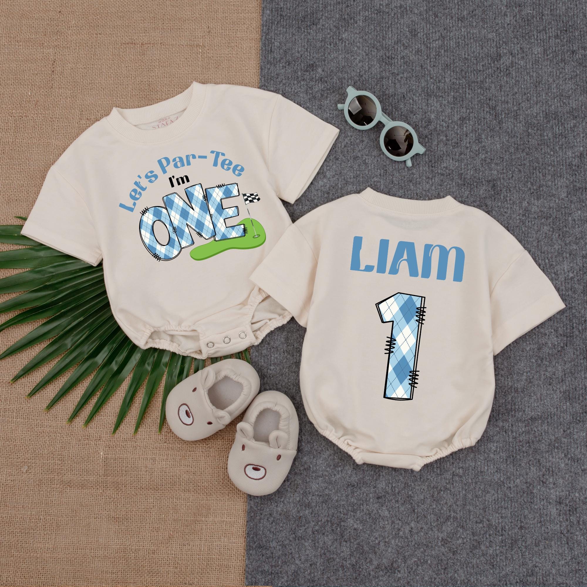 Let's Par-Tee I'm ONE Birthday Romper for Boys Personalized Golf Outfit Baby's First Party Blue Plaid Toddler Gift