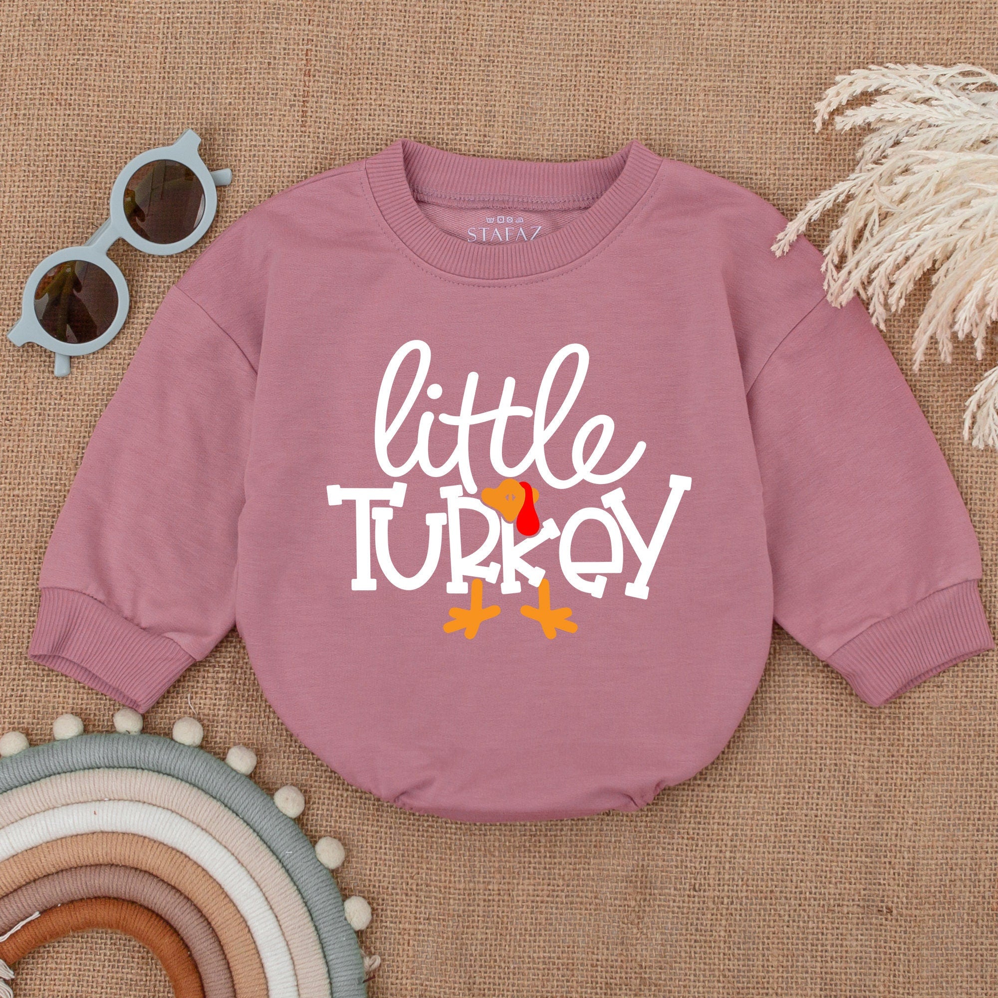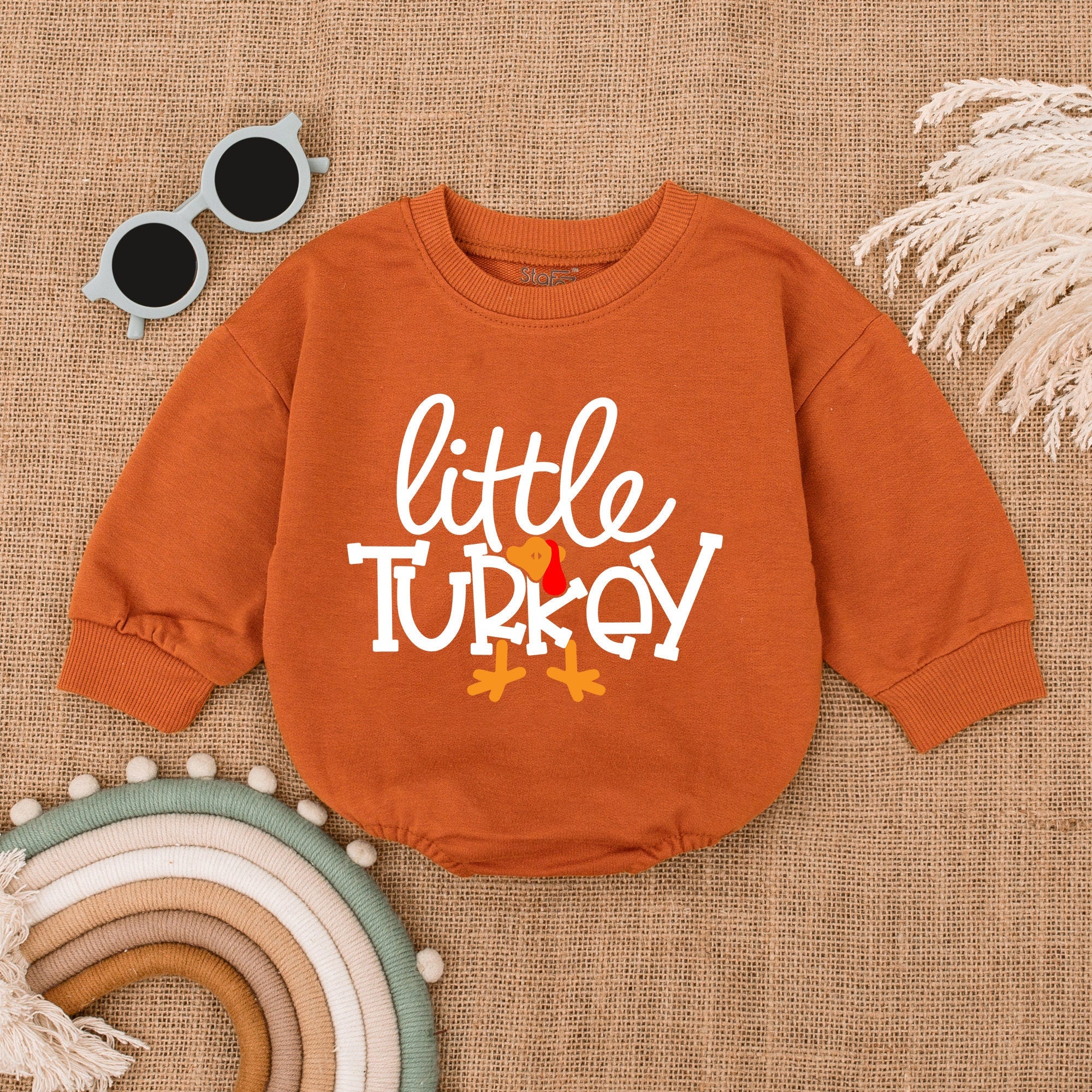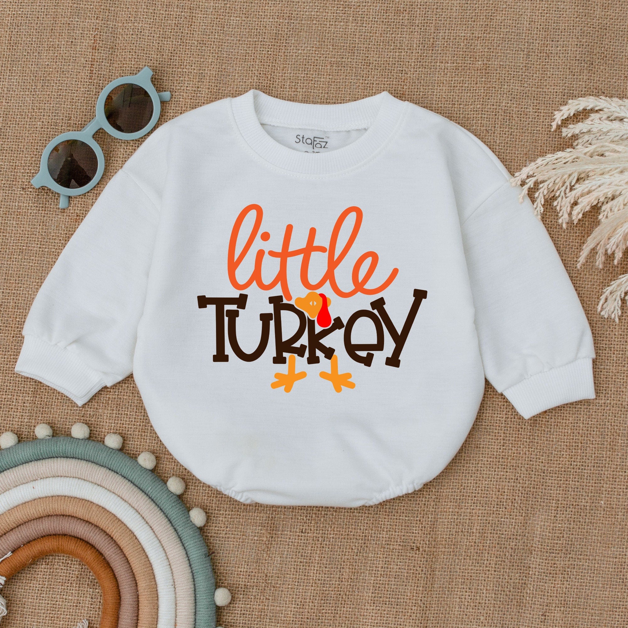 Imagine your little one joyfully toddling around in this charming 'little TURKEY' outfit during a cozy Thanksgiving gathering. The playful design, with 'little' in graceful orange cursive and 'TURKEY' in bold brown, captures the spirit of the season. An adorable turkey graphic cleverly replaces the 'U,' adding a whimsical touch to this festive attire. Perfect for holiday photos or a family feast, the romper's warm autumnal hues and scattered leaf motifs bring a touch of seasonal charm. Crafted from soft, comfortable cotton, it ensures your baby stays snug and stylish all day. Whether it's a thoughtful baby shower gift or an addition to your baby's fall wardrobe, this outfit invites you to create lasting memories. Embrace the season's warmth and capture the joy of Thanksgiving with this delightful piece.