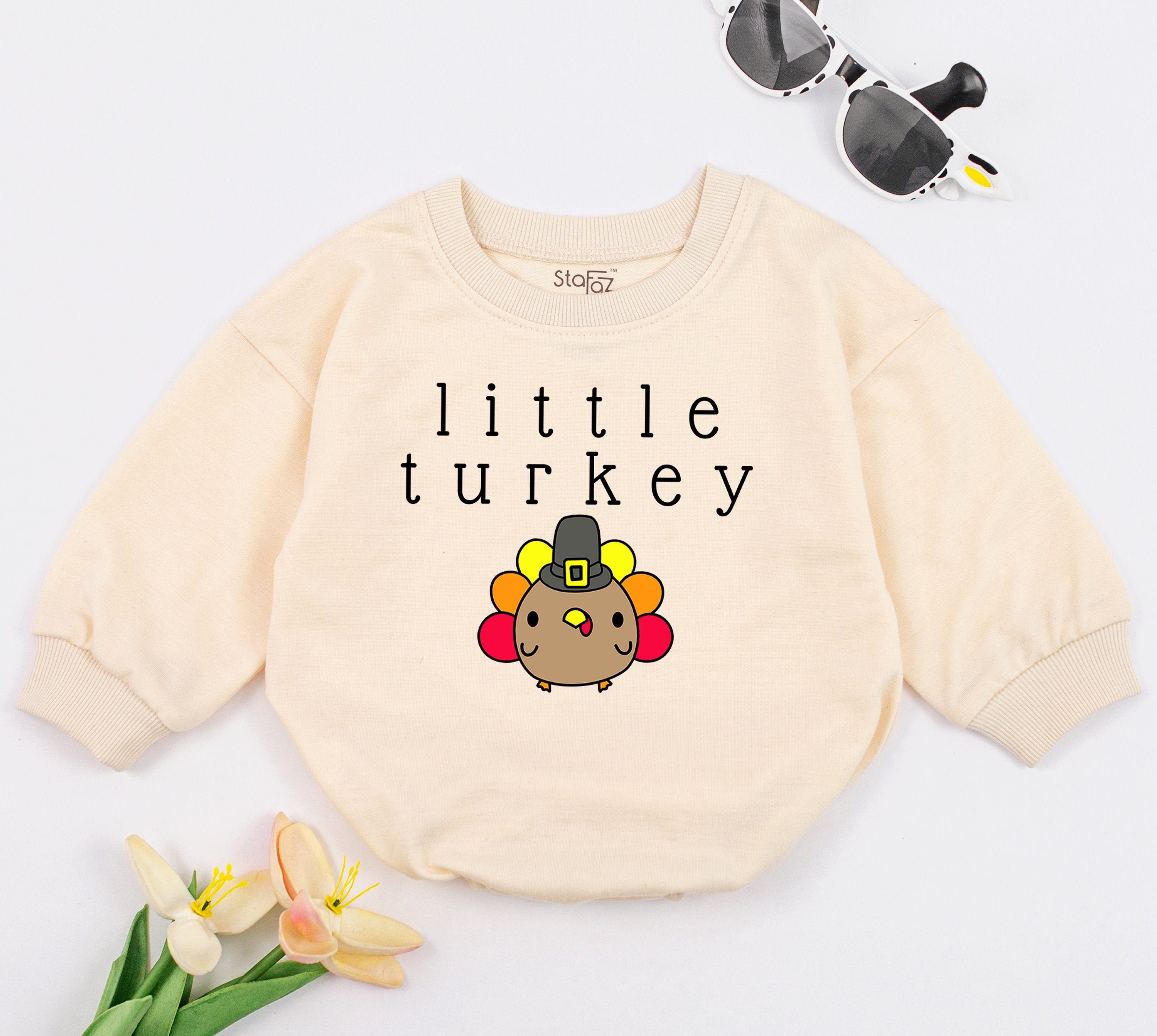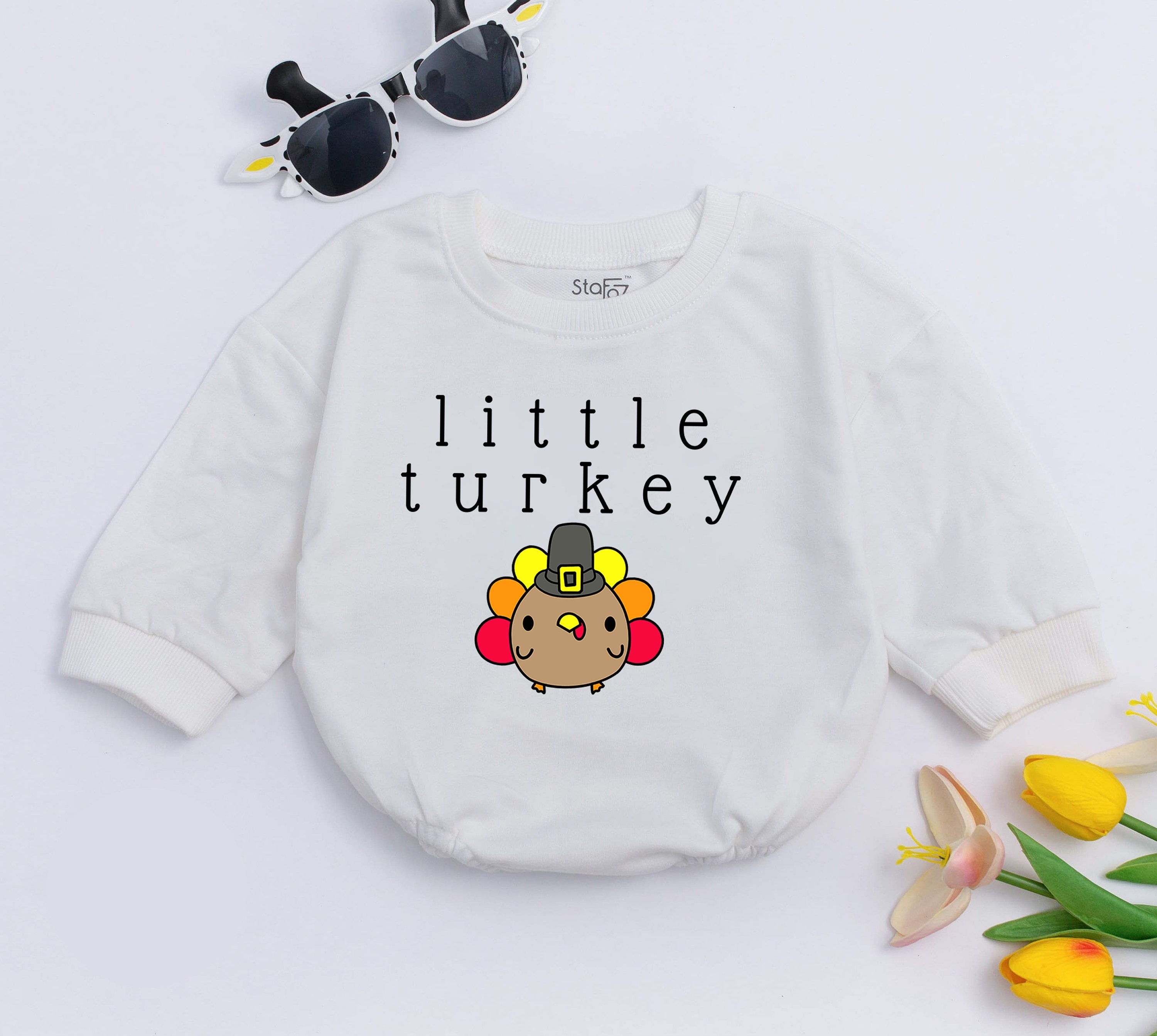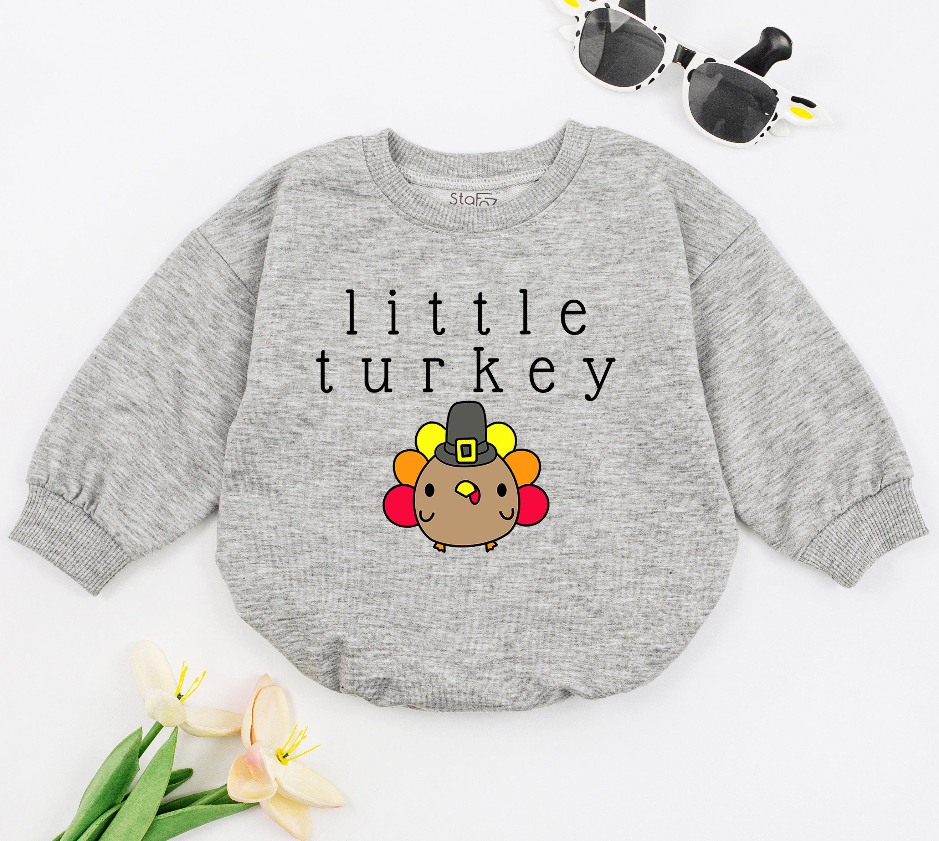 Imagine your little one giggling through their first Thanksgiving, wrapped in the soft embrace of this charming romper. The adorable cartoon turkey, donned with a playful pilgrim hat, brings a splash of vibrant colors to the festive season. Its bright red, yellow, and orange tail feathers dance joyously, making every moment a picture-perfect memory. Whether it’s a cozy family dinner or a playful photo session, this romper captures the spirit of fun and celebration. With the whimsical 'little turkey' text above, it’s sure to bring smiles and warmth to your holiday gatherings. Celebrate those cherished family moments with this delightful outfit, perfect for creating lasting memories. Let your little one shine in this joyful ensemble, ideal for capturing the magic of Thanksgiving.