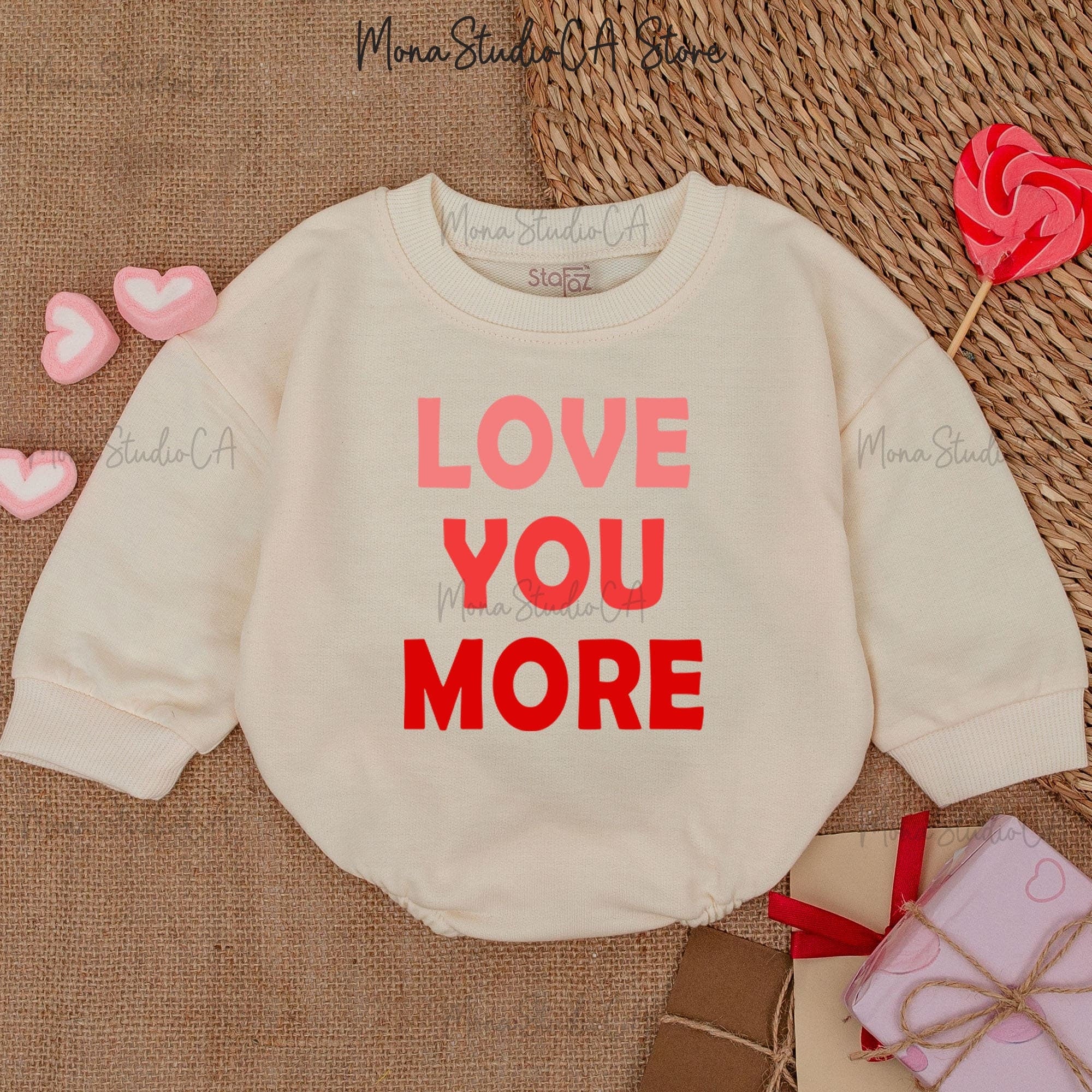 Imagine your little one cuddled up in this adorable romper, its message of 'LOVE YOU MORE' written in bold, cheerful colors that capture the spirit of Valentine's Day. The design is simple yet striking, featuring the words in a charming mix of white, pink, and vibrant red. Perfect for a cozy family gathering or a first Valentine's Day photo shoot, this romper brings warmth and joy to any occasion. Crafted from soft, comfortable cotton, it's gentle on your baby's skin, ensuring they stay happy and relaxed. Picture your baby girl wearing this on a special holiday, spreading love and smiles wherever she goes. Make this Valentine's Day memorable by dressing your little one in a garment that speaks volumes about love and family. Don't miss the chance to create lasting memories with this delightful outfit.
