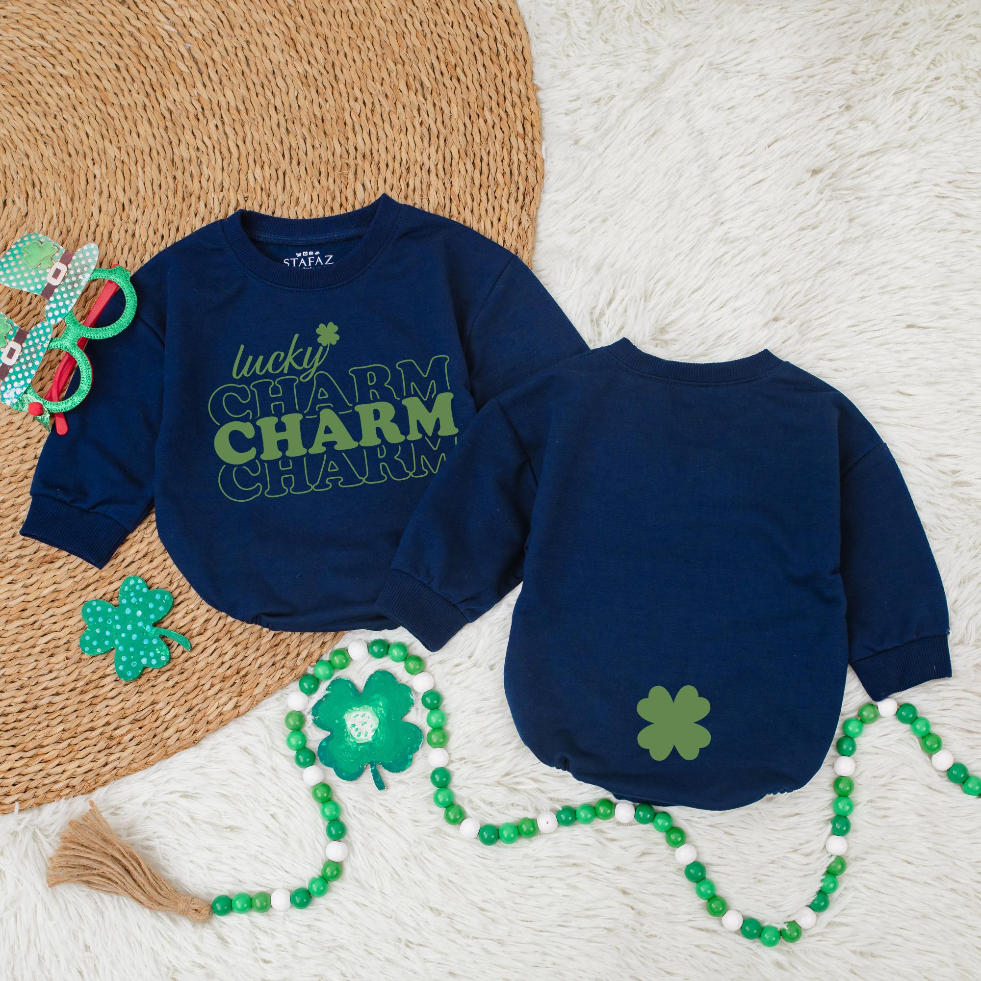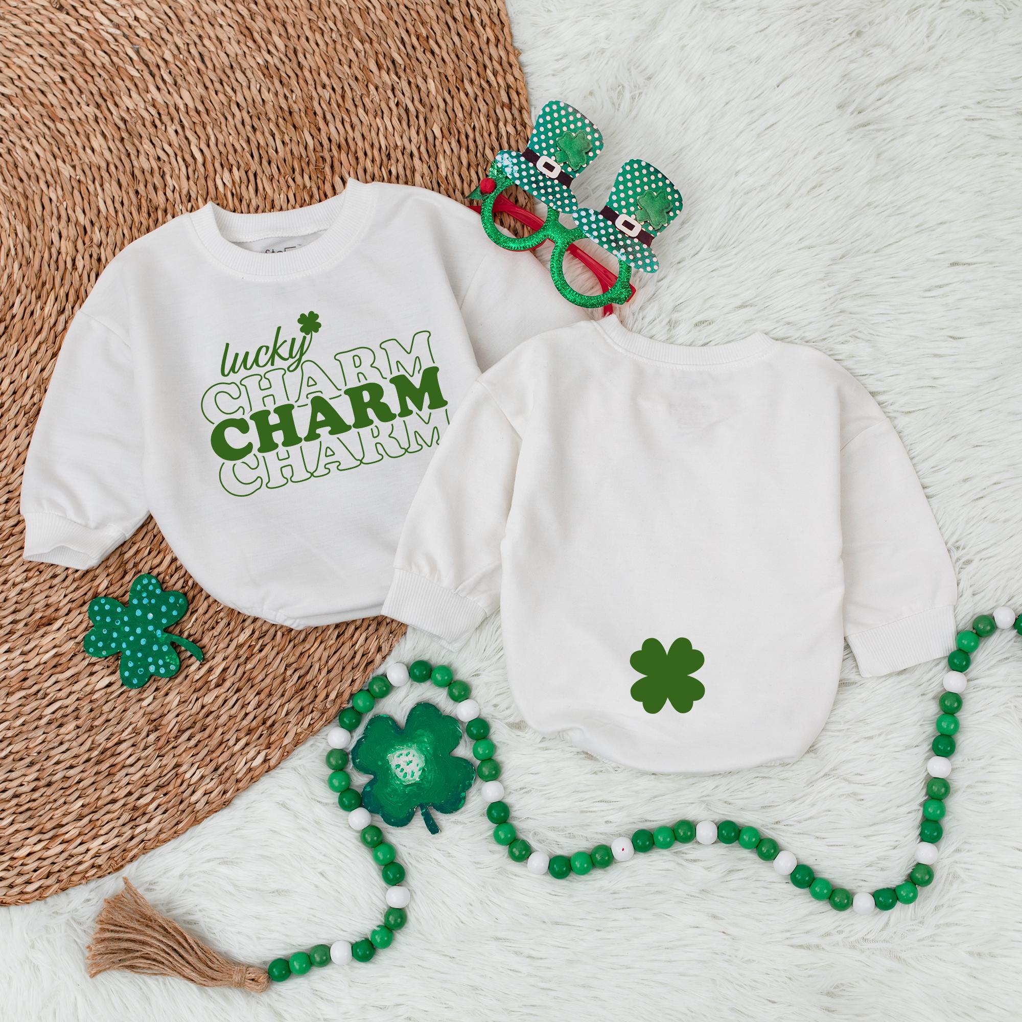 Imagine the joy of dressing your little one in this charming bodysuit, capturing the spirit of St. Patrick's Day with its playful 'lucky CHARM CHARM' design. The vibrant green colors and whimsical lettering create a festive vibe, perfect for holiday celebrations. With a delicate shamrock dotting the 'i' in 'lucky', every detail speaks to Irish heritage and cheer. Whether it's a cozy family gathering or a festive party, this soft cotton bodysuit ensures comfort and style for your baby. The simple shamrock on the back adds a touch of tradition, making it a delightful gift for any newborn. Celebrate the season with this adorable outfit, creating memories and spreading smiles. A perfect pick for parents who cherish both style and sentiment in their baby's wardrobe.