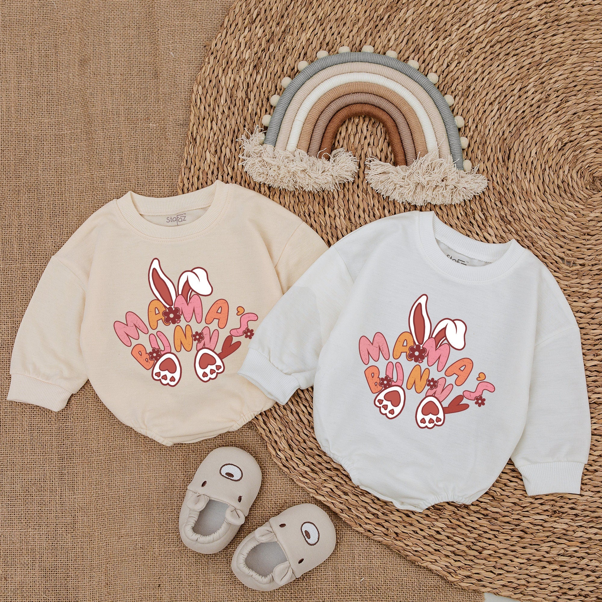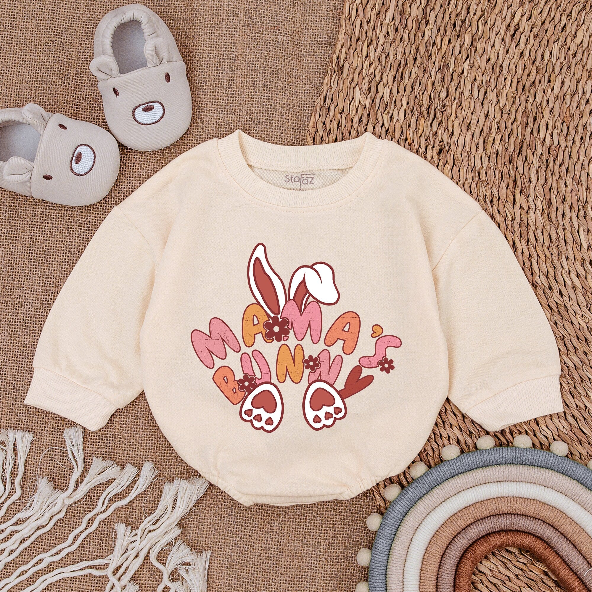 Imagine the delight on your little one's face as they hop through Easter morning in this adorable 'Mama's Bunny' romper. The vibrant design features playful bunny ears and a fluffy tail, bringing a touch of whimsy to your baby's wardrobe. Each letter in 'Mama's Bunny' dances in shades of pink and orange, surrounded by charming flower motifs and tiny bunny paw prints. Perfect for holiday gatherings or cozy family pictures, this soft, cotton romper ensures your baby's comfort while capturing the joy of the season. Whether it's their first Easter or a cherished tradition, this outfit is a delightful way to celebrate those special moments. Dress your baby in this cute ensemble and create memories that you’ll treasure forever.