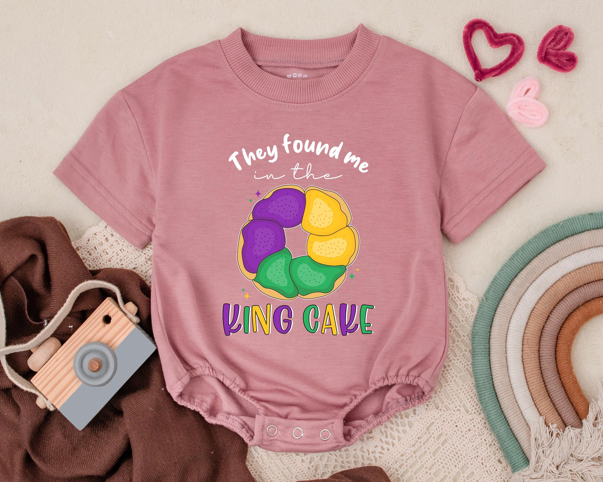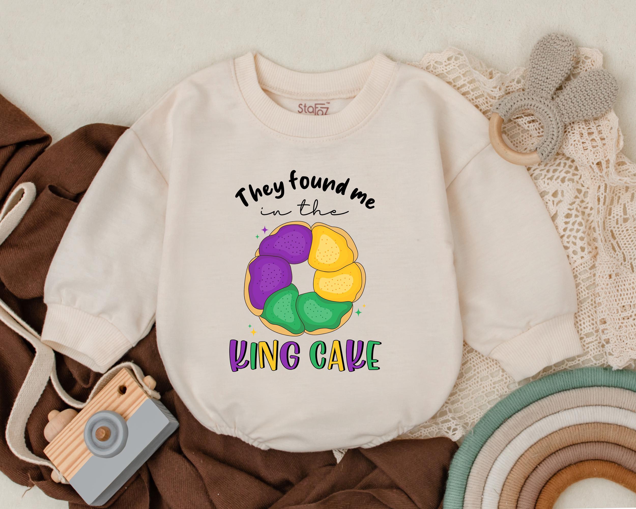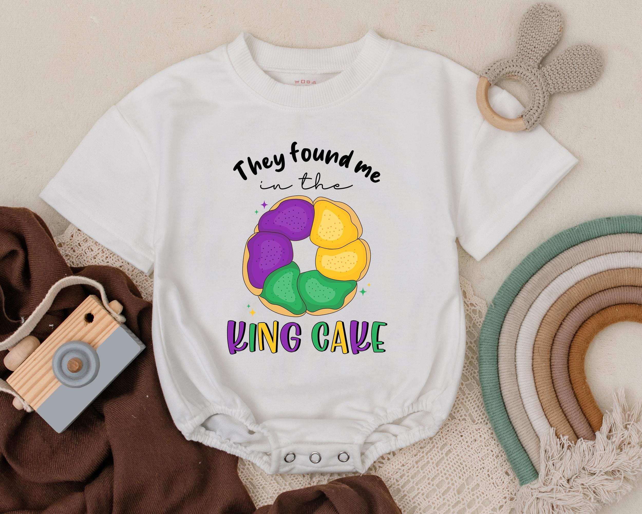 Imagine the joy of your little one all dressed up for their first Mardi Gras celebration. This adorable romper features a vibrant illustration of a king cake, capturing the essence of the festive season with its bold purple, yellow, and green colors. Above the cake, the playful phrase 'They found me in the' adds a whimsical touch, while 'KING CAKE' below it pops out in bold letters, making it a charming conversation starter at any gathering. Whether you're attending a family brunch or a Mardi Gras parade, this romper ensures your baby is at the center of attention, wrapped in a warm embrace of tradition and color. Perfect as a baby shower gift or a special outfit for capturing those precious first-year moments. Embrace the spirit of Carnival and let this romper be a sweet reminder of joyful celebrations. Dress your baby in this delightful piece and create memories that will last a lifetime.