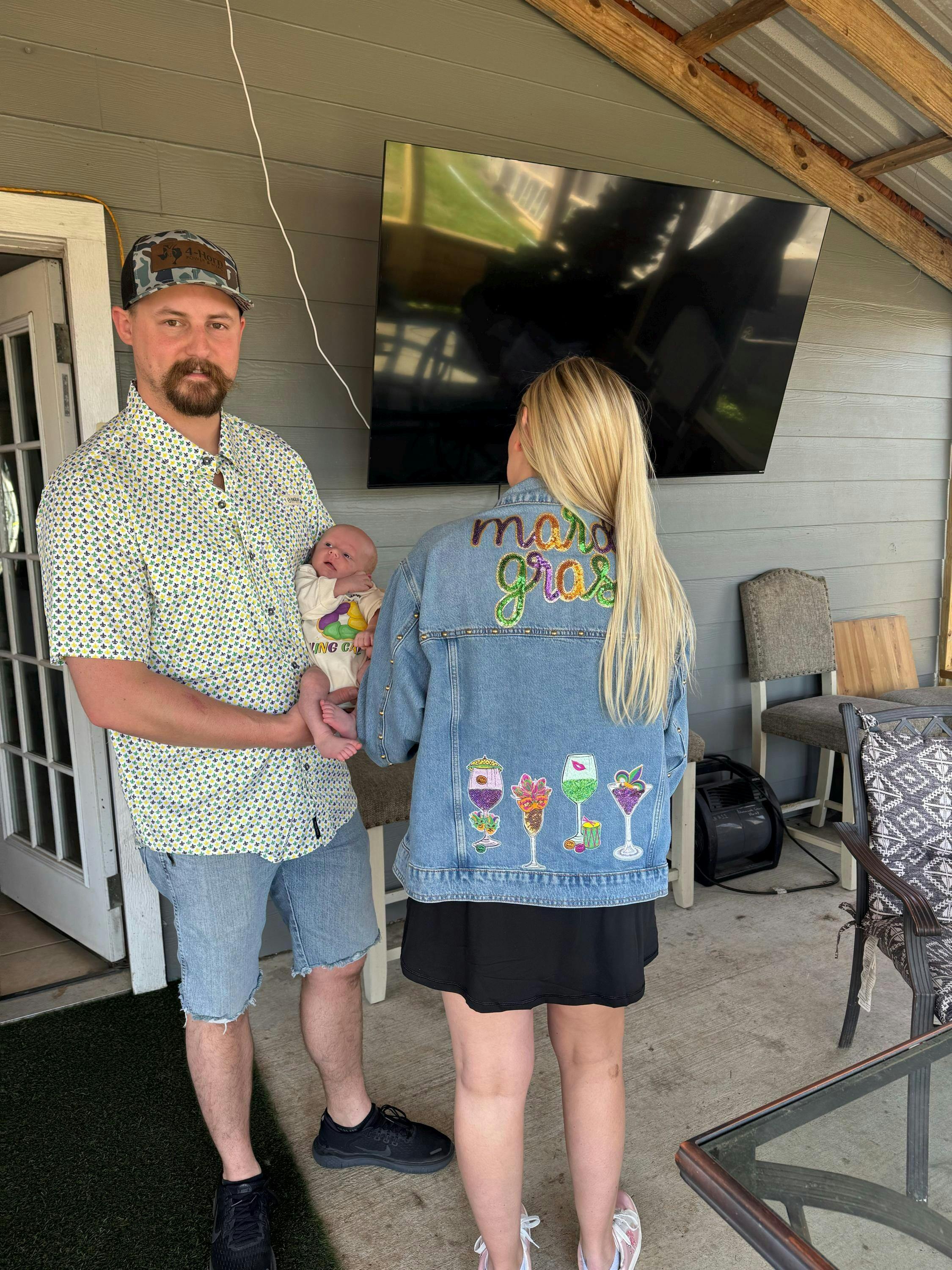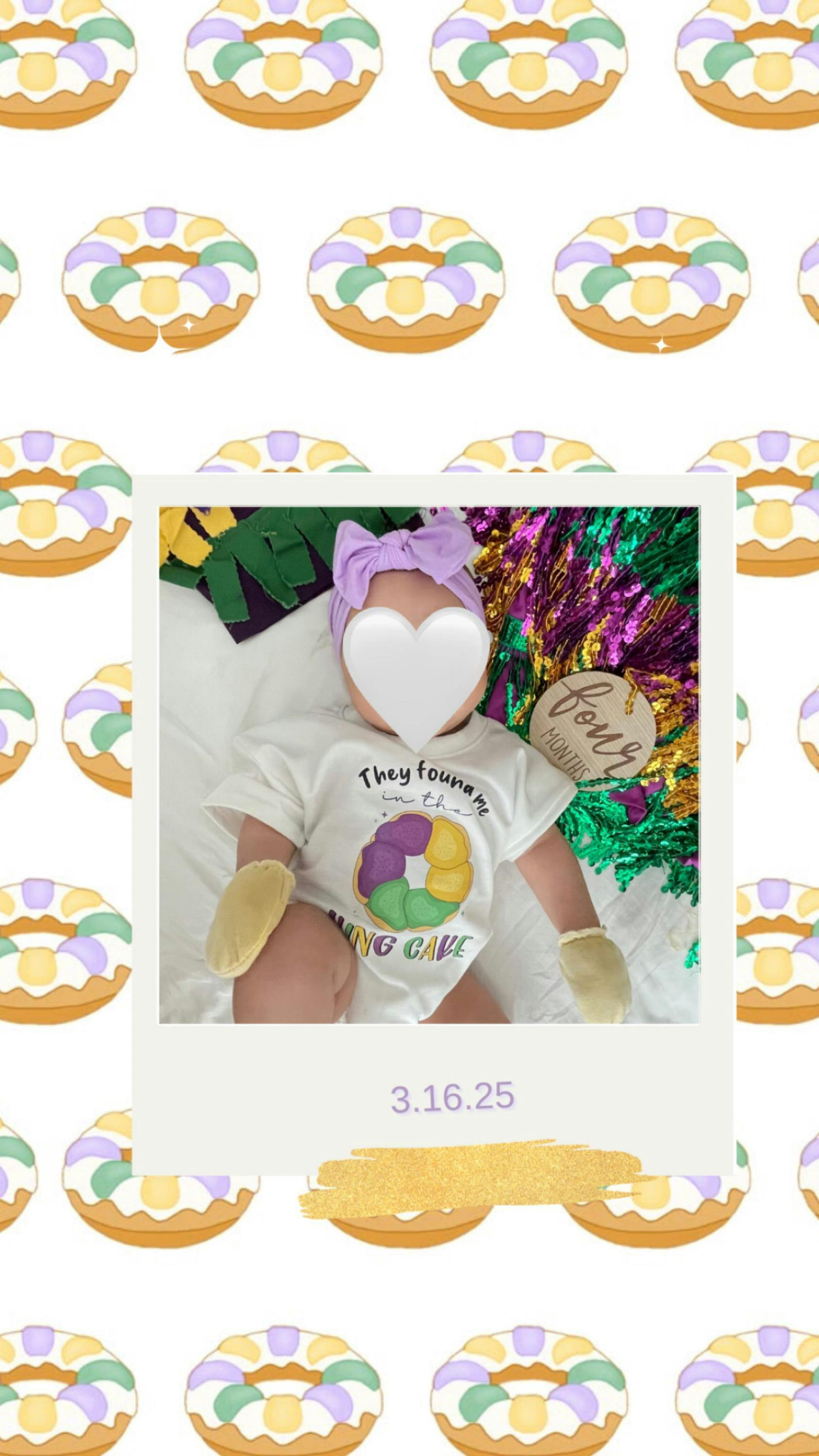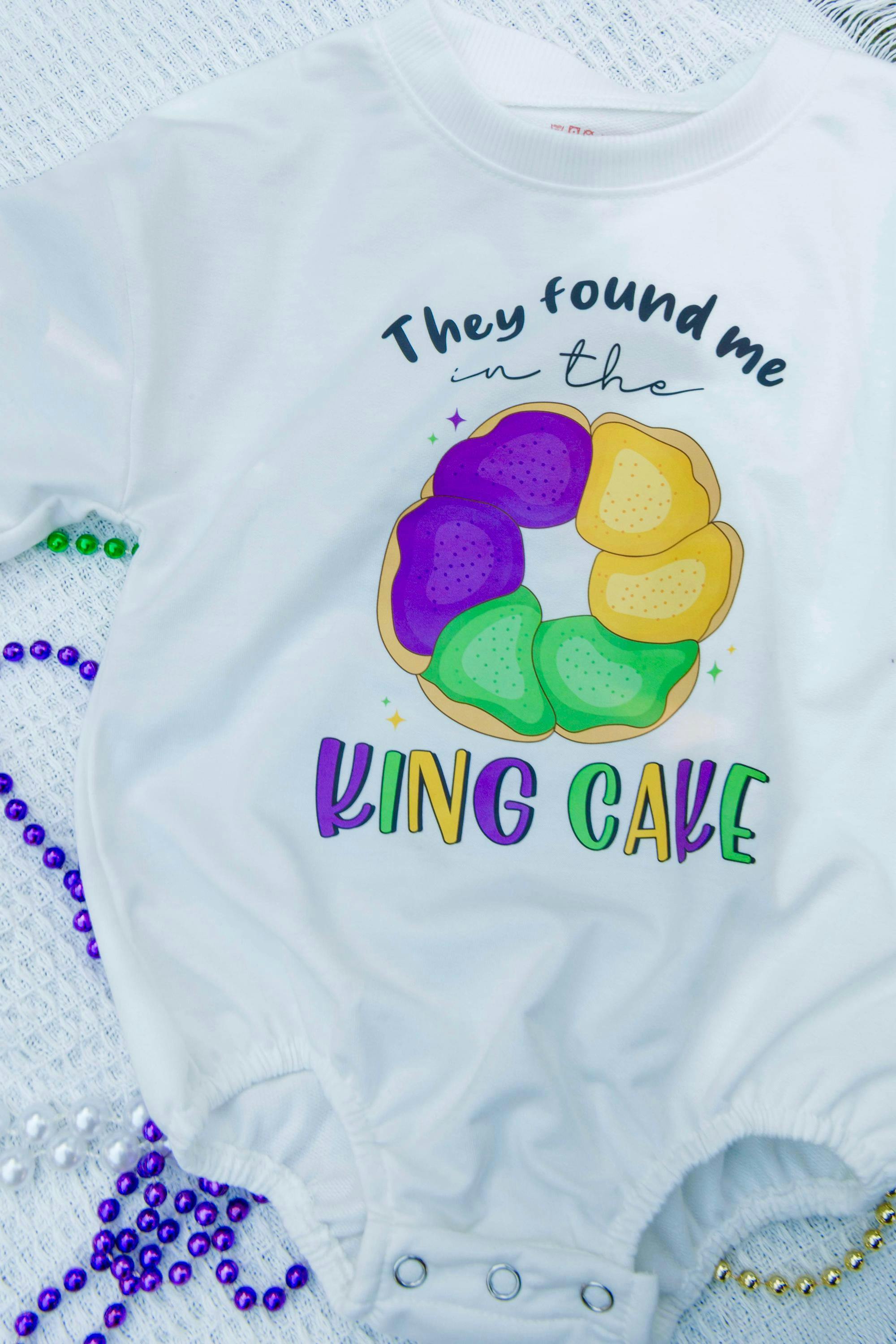 Imagine the joy of your little one all dressed up for their first Mardi Gras celebration. This adorable romper features a vibrant illustration of a king cake, capturing the essence of the festive season with its bold purple, yellow, and green colors. Above the cake, the playful phrase 'They found me in the' adds a whimsical touch, while 'KING CAKE' below it pops out in bold letters, making it a charming conversation starter at any gathering. Whether you're attending a family brunch or a Mardi Gras parade, this romper ensures your baby is at the center of attention, wrapped in a warm embrace of tradition and color. Perfect as a baby shower gift or a special outfit for capturing those precious first-year moments. Embrace the spirit of Carnival and let this romper be a sweet reminder of joyful celebrations. Dress your baby in this delightful piece and create memories that will last a lifetime.
