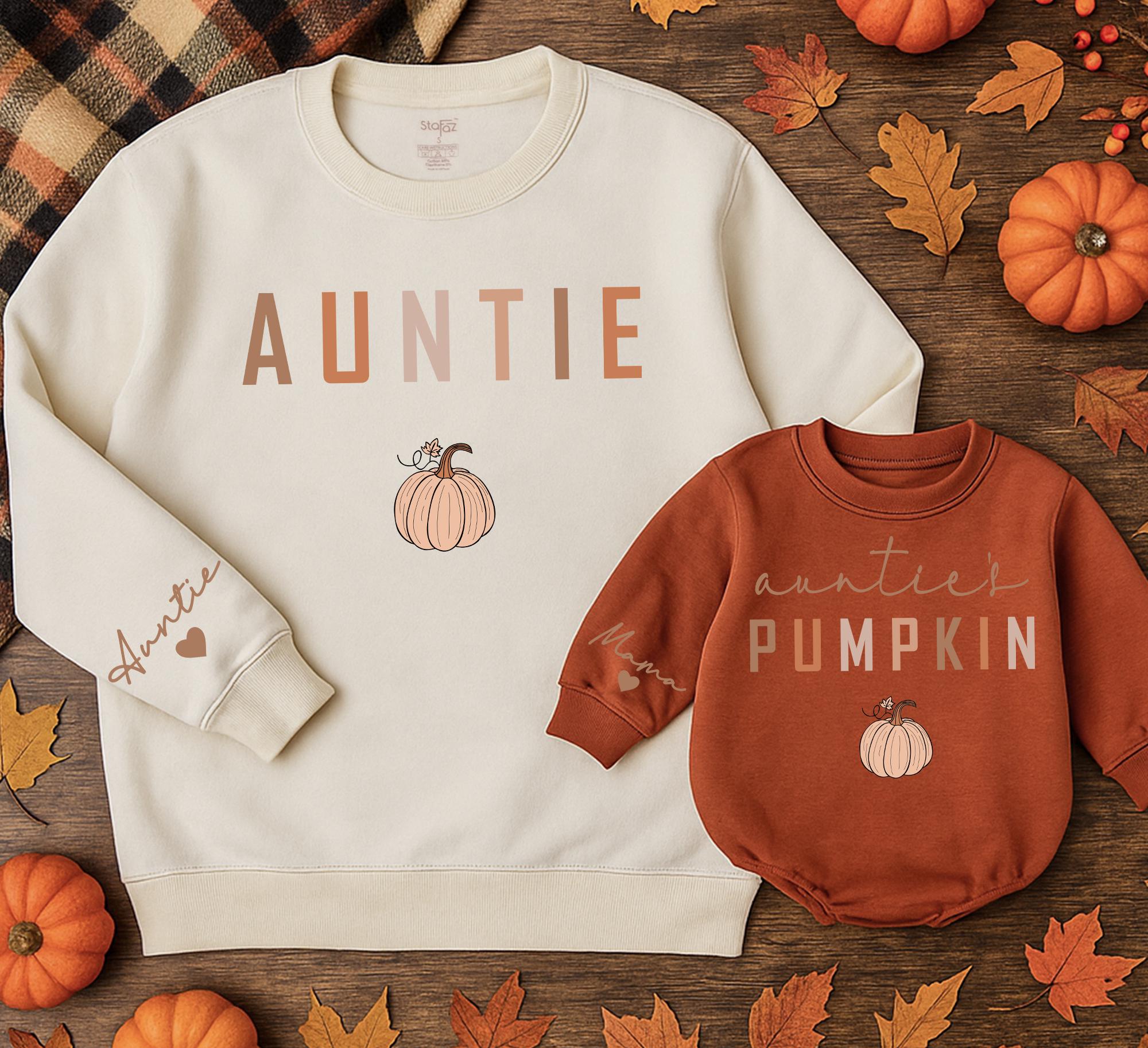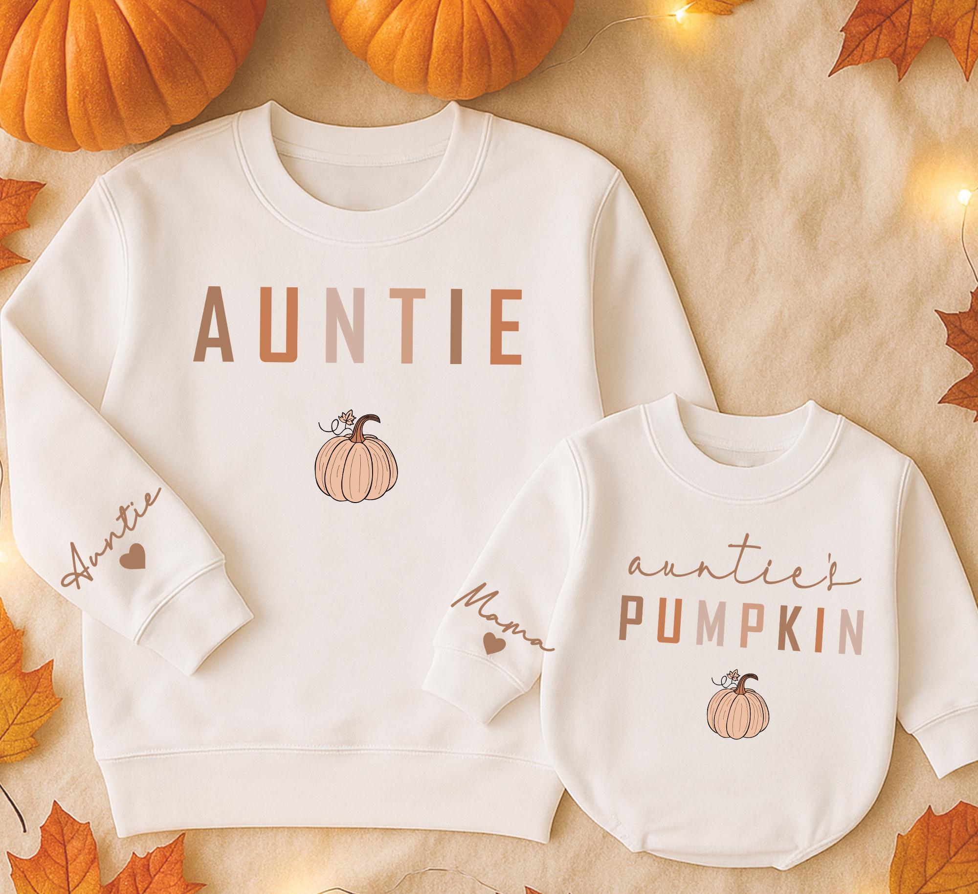 Imagine a crisp autumn day, leaves crunching underfoot, as you and your little one don these charming matching sweatshirts. The word 'AUNTIE' stands proudly on a soft brown background, with a delightful hand-drawn pumpkin adding a touch of seasonal whimsy. On the sleeve, 'Auntie' is elegantly scripted with a sweet heart, connecting warmth and love. For your little one, 'auntie's PUMPKIN' is playfully displayed, perfect for family gatherings or a cozy day at home. These sweatshirts aren’t just about style; they capture the joy of togetherness and the magic of fall. Whether you're heading to a pumpkin patch or capturing precious moments in a family photoshoot, these outfits make every occasion special. Embrace the season and create memories that last a lifetime.