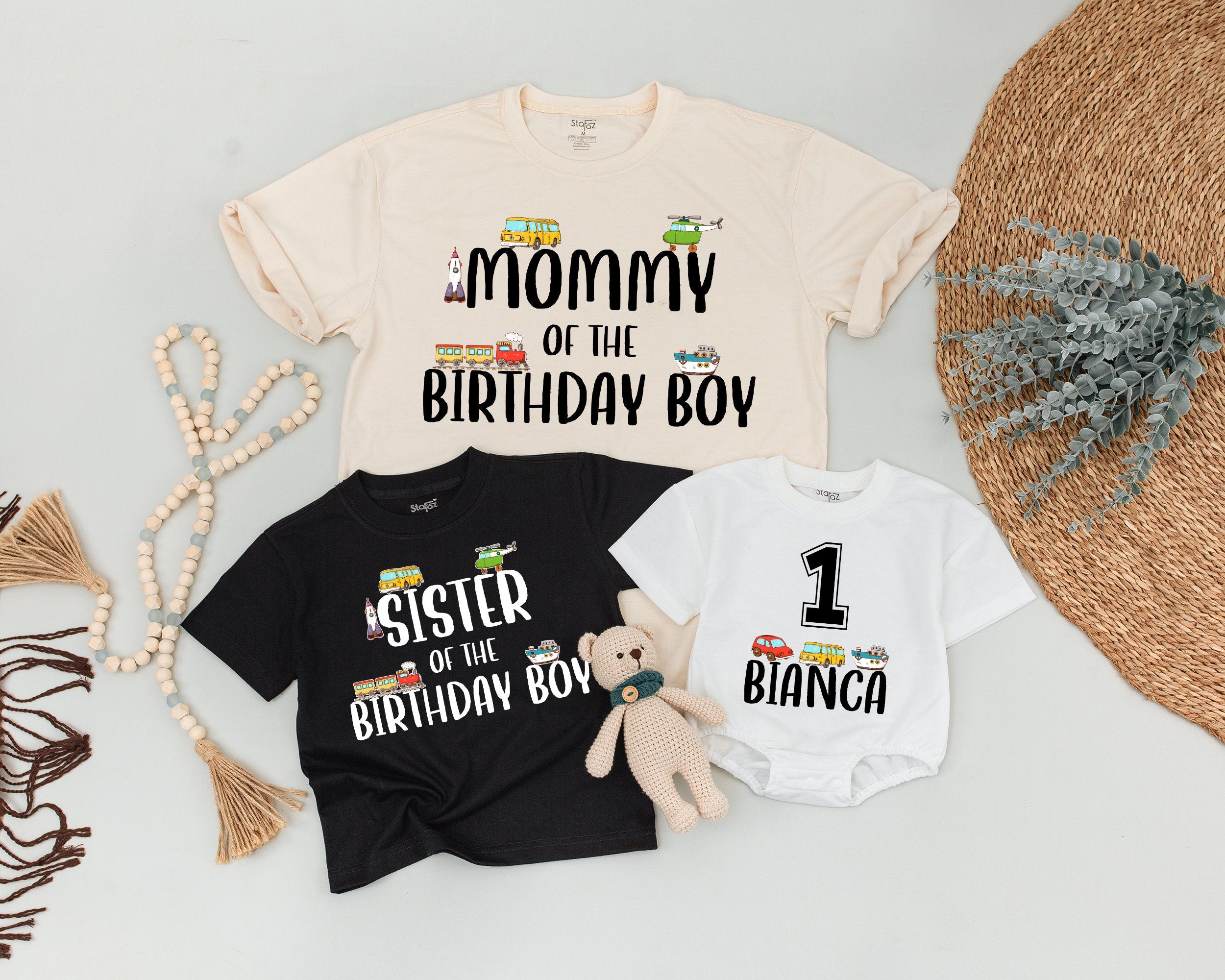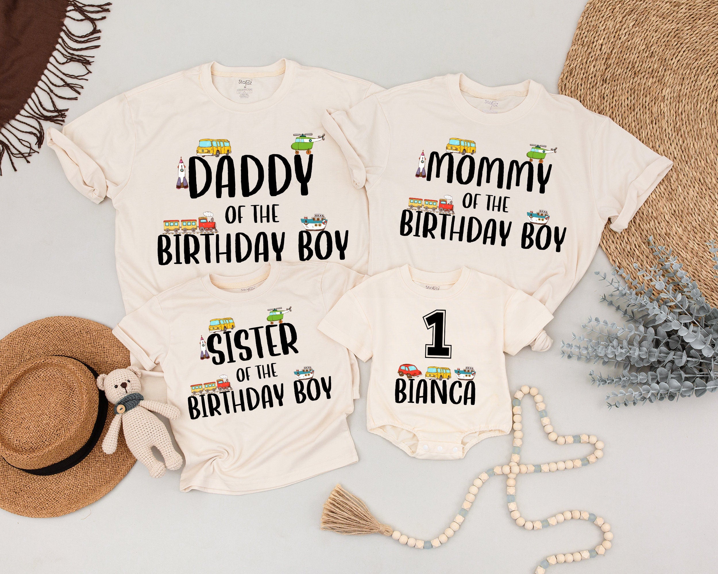 Imagine the joy of celebrating a special birthday with the whole family decked out in matching shirts, each one vibrant with playful illustrations of a school bus, fire truck, and car in lively yellows, reds, and greens. The bold, black text adds a touch of personalization, proudly declaring 'DADDY OF THE BIRTHDAY BOY,' 'MOMMY OF THE BIRTHDAY BOY,' or even 'SISTER OF THE BIRTHDAY BOY.' For the little one, a unique touch with '1 BIANCA' makes it a keepsake they'll treasure. Perfect for a transportation-themed birthday bash, these soft cotton shirts offer comfort and style. Picture a family photo capturing this fun, cohesive look, or imagine the smiles as your little one beams in their special shirt. Create memories and celebrate in style with a personalized touch that makes this day truly unforgettable.